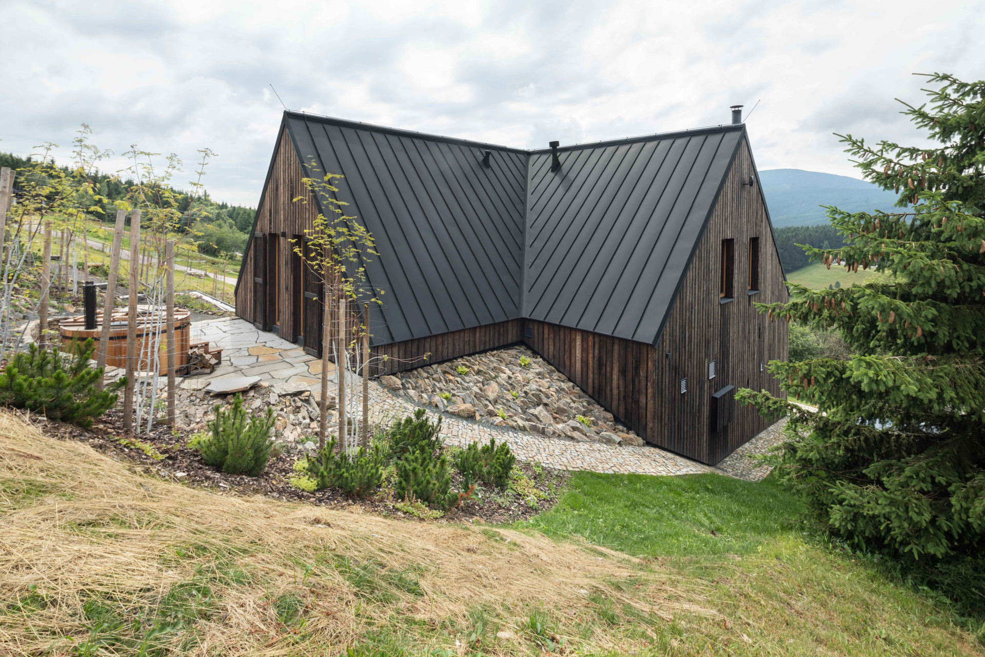 Nowa rodzinna chałupa, zaprojektowana przez OK PLAN ARCHITECTS, musiała dostosować się do tych zasad. Posiada tradycyjny dach dwuspadowy, drewnianą elewację i została ustawiona zgodnie z linią konturu terenu. Właściciele nazywają ją „rodzinną boudą”.