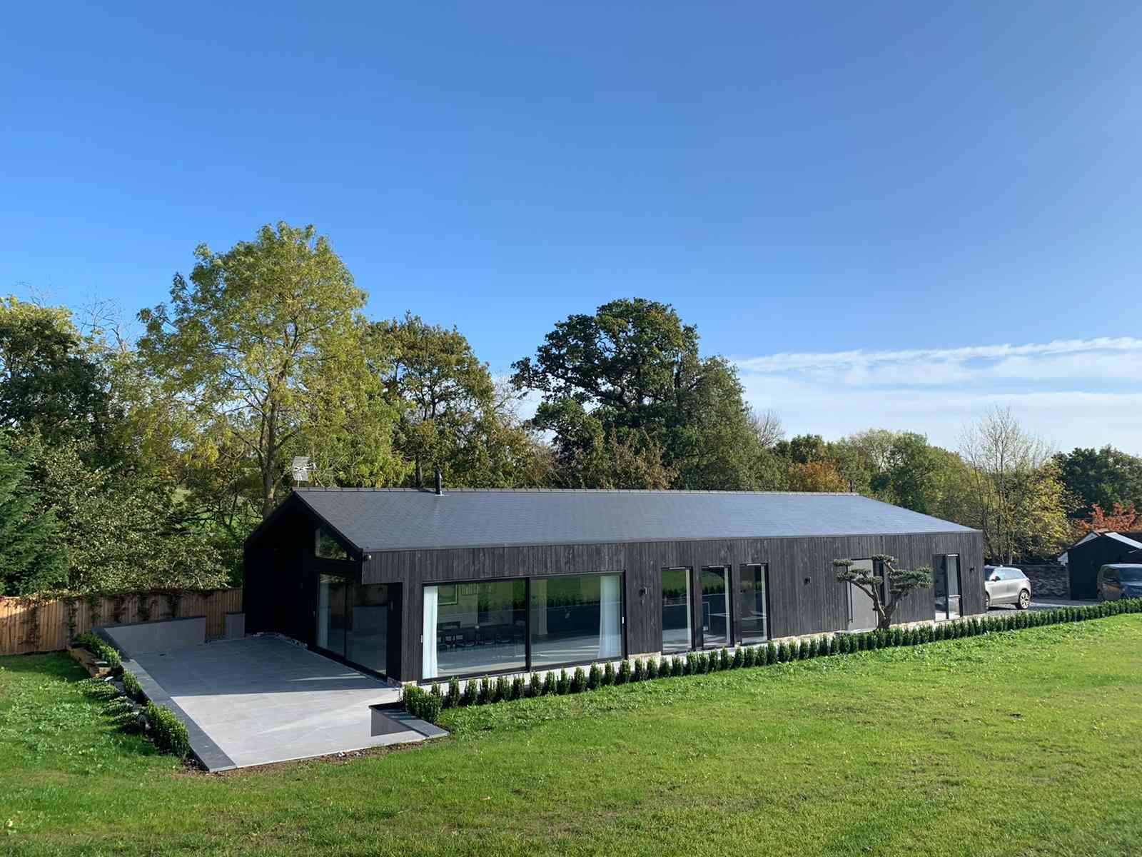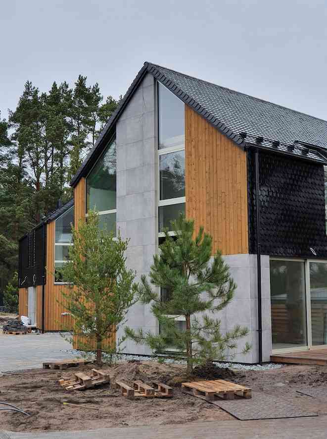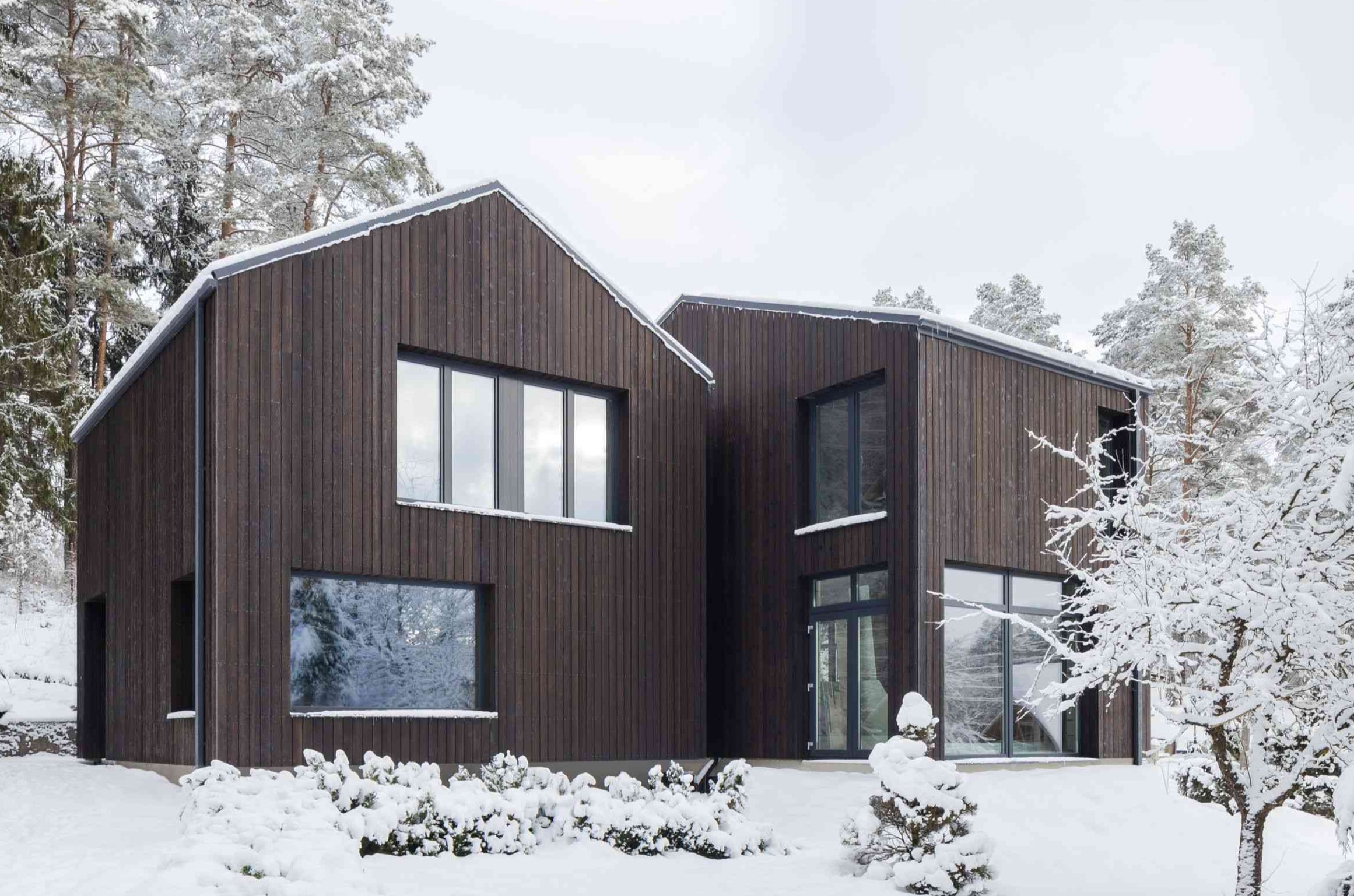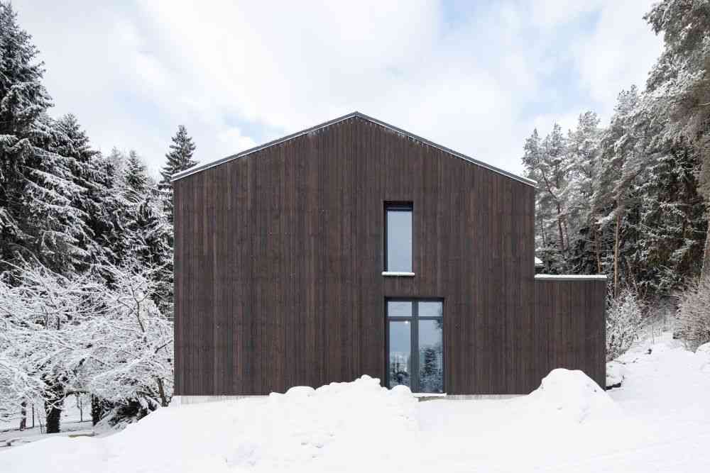 Zamiast jednej masywnej bryły powstały dwa niezależne domy – jeden przeznaczony dla rodziców, drugi dla dzieci – połączone wspólną przestrzenią parterową, sprzyjającą integracji rodziny. Takie rozwiązanie doskonale wpisuje się w ideę domu wielopokoleniowego i architektury dopasowanej do skali otoczenia. Jednym z kluczowych elementów projektu jest elewacja z wypalonego modrzewia, która nadaje bryle lekkości, podkreśla naturalny charakter inwestycji i pozwala budynkom subtelnie wtopić się w krajobraz. Całość łączy cechy, jakie oferuje nowoczesna stodoła – prostą formę, funkcjonalność i silną relację z naturą – bez dominowania nad otoczeniem.