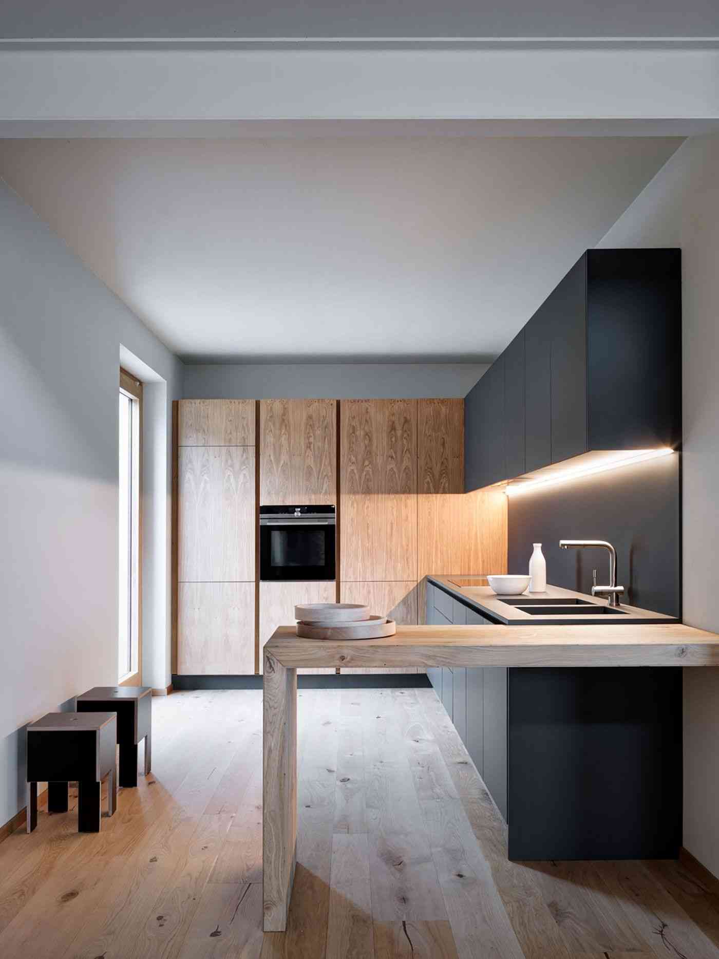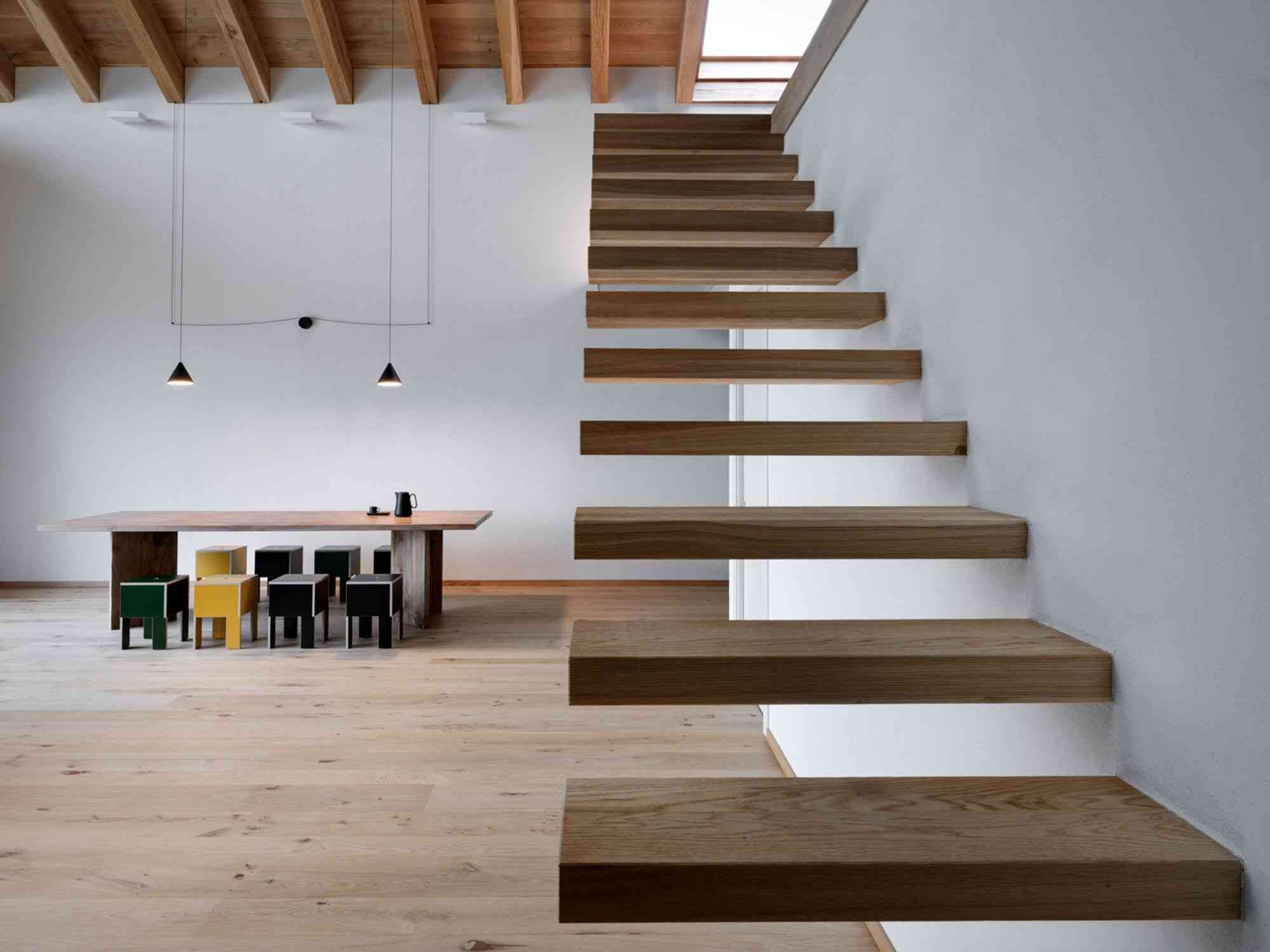 Nowy dom został wzniesiony na istniejącym wcześniej garażu, a jego drewniana konstrukcja spaja oba elementy oraz stanowi podstawę dla nowego dachu. Solidne drewno dębowe pozwoliło architektowi na zastosowanie imponujących belek i filarów, nadających wnętrzu charakteru i monumentalności. Szczególnie efektownie prezentuje się południowa fasada, gdzie dwupoziomowe filary podtrzymują konstrukcję, wpisując się w estetykę współczesnej, alpejskiej chaty. Budynek subtelnie łączy tradycję z modernizmem, tworząc przestrzeń, która jest zarówno nowoczesna, jak i głęboko zakorzeniona w lokalnym kontekście.