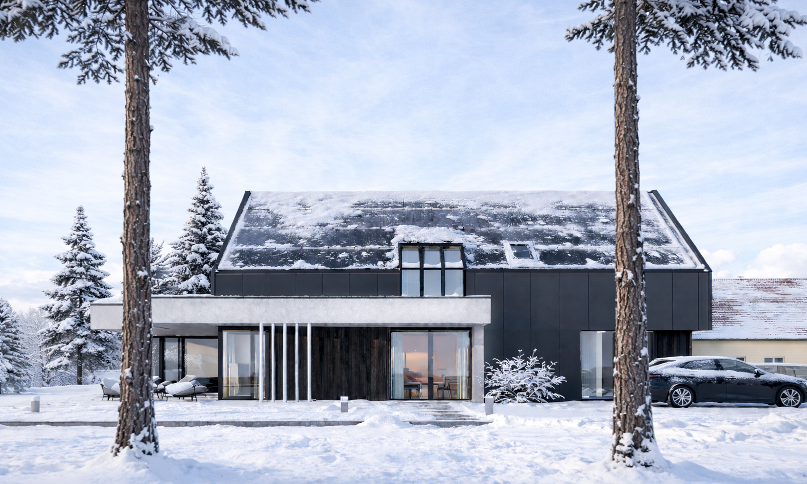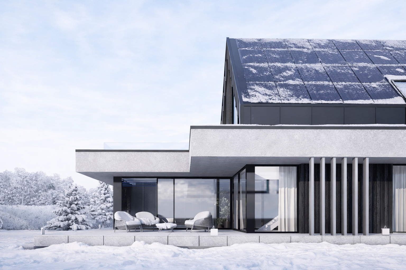 Koncepcję uzupełnia dach w zintegrowanym systemie solarnym od strony południowej, podkreślający nowoczesny i świadomy charakter projektu.