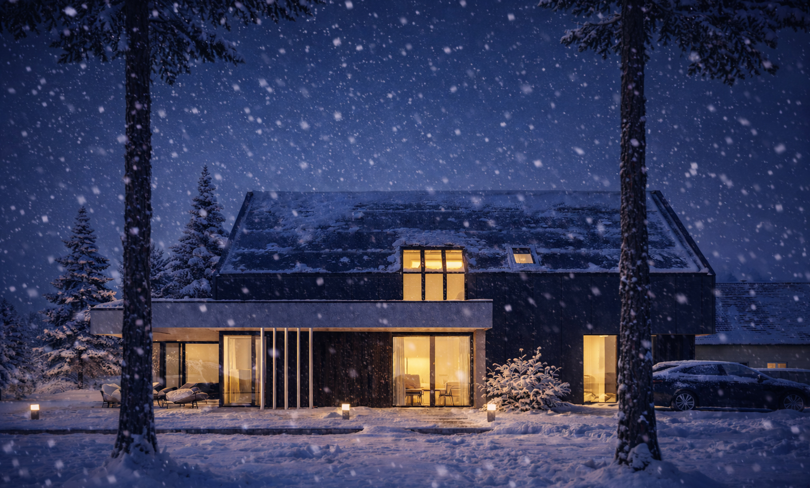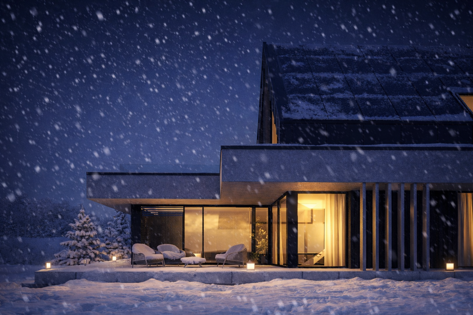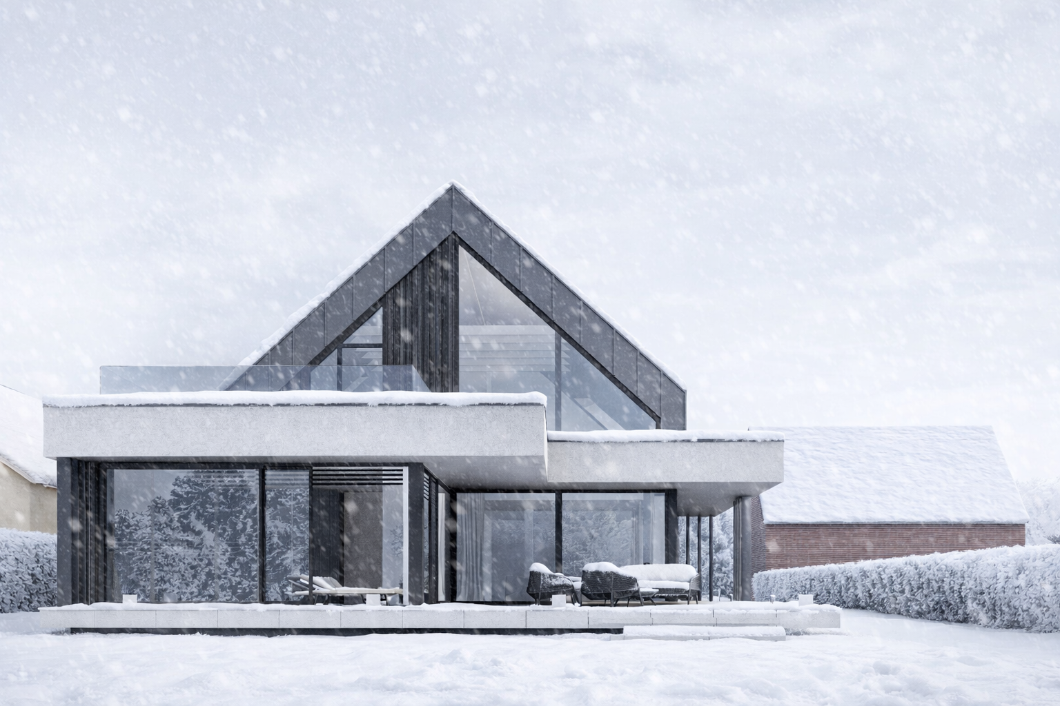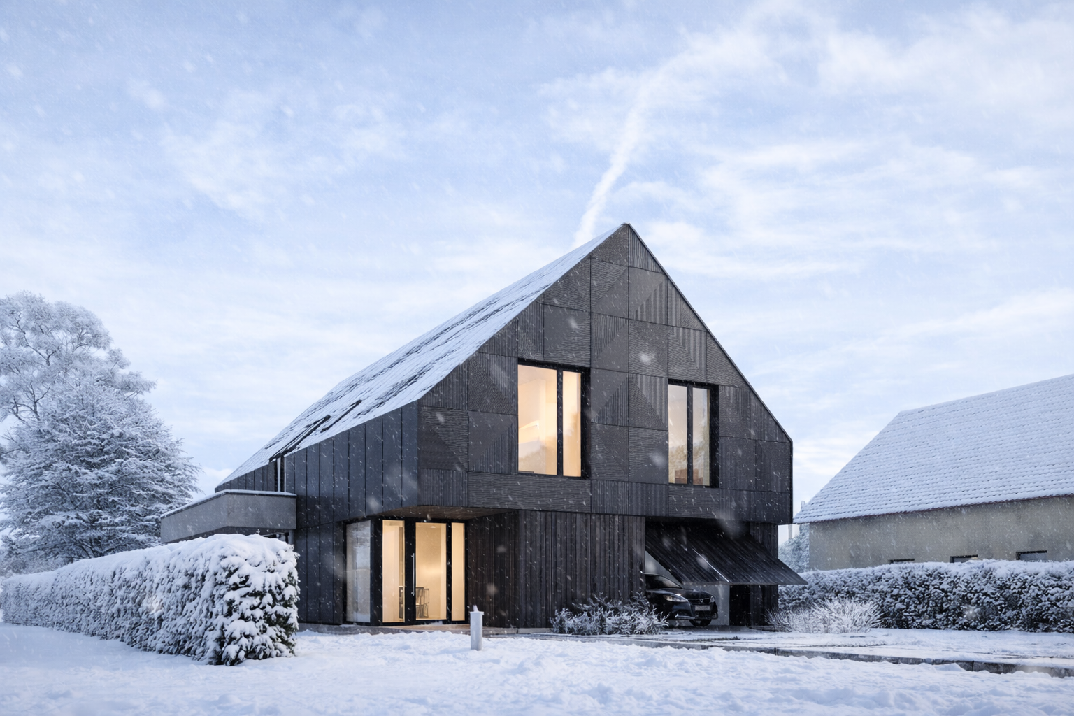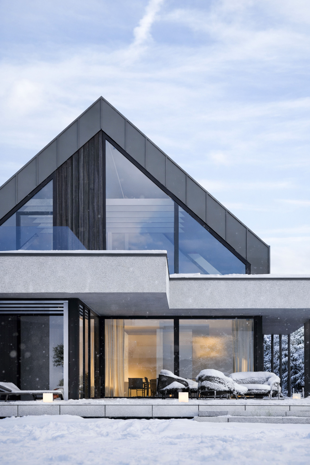 Projekt wyróżnia się konsekwencją i spokojem, które definiują jego charakter niezależnie od pory roku. Forma budynku została ukształtowana tak, aby nie dominować nad otoczeniem, lecz prowadzić z nim subtelny dialog, w którym kluczową rolę odgrywają proporcje, światło i rytm elewacji. Zimowy krajobraz dodatkowo podkreśla precyzję formy oraz szlachetność zastosowanych rozwiązań, odsłaniając ideę domu jako trwałej, wyważonej struktury — estetycznej, funkcjonalnej i świadomie osadzonej w miejscu.
