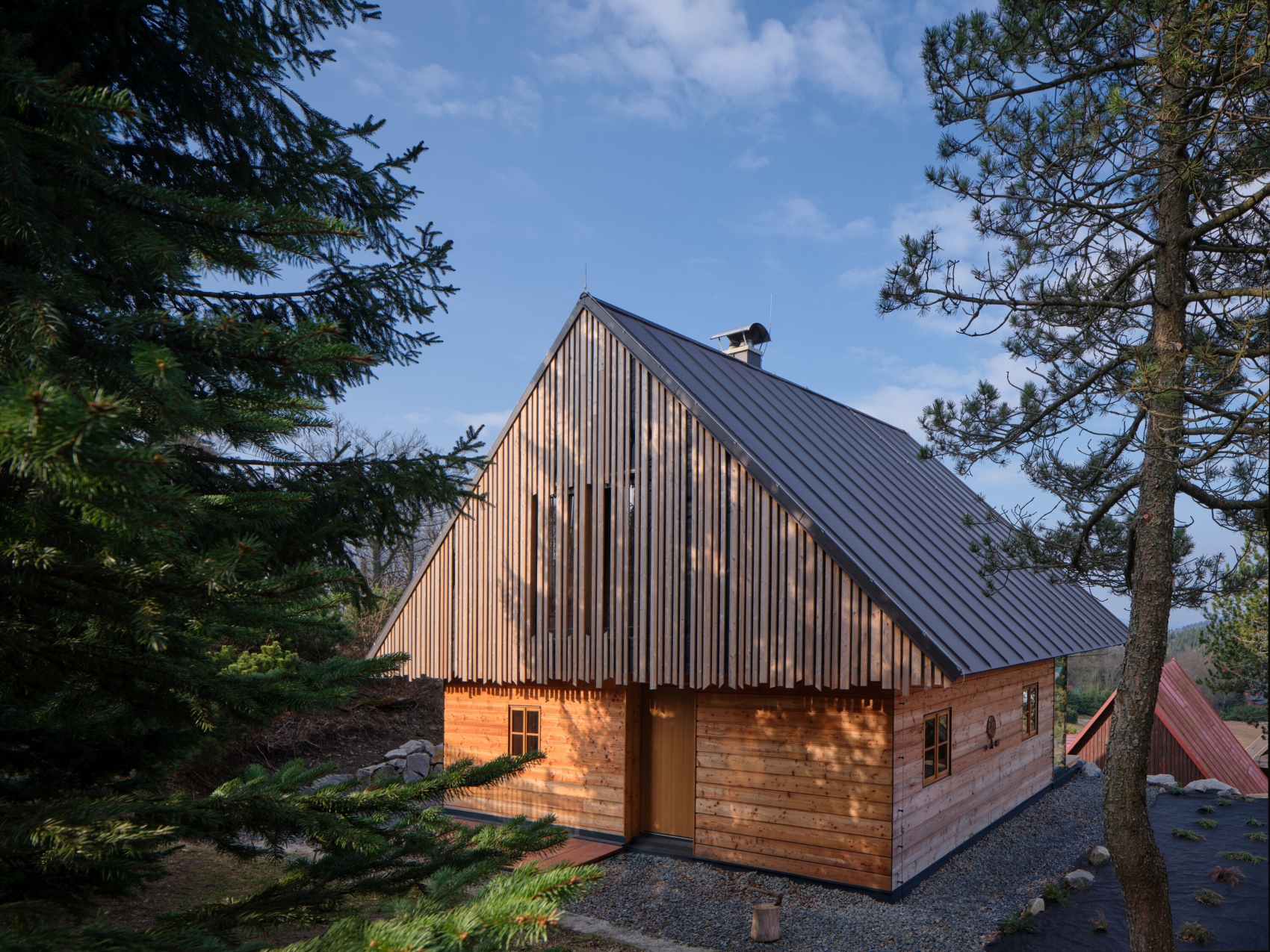 Na stoku, gdzie ściany lasu otwierają się na rozległą panoramę Jaworników, stanął dom zaprojektowany przez SENAA architekti – Václava Navrátila i Jana Sedláčka. To współczesna interpretacja górskiej chaty, której prosta bryła i tradycyjny dach siodłowy sprawiają, że architektura płynnie wpisuje się w naturalne otoczenie.