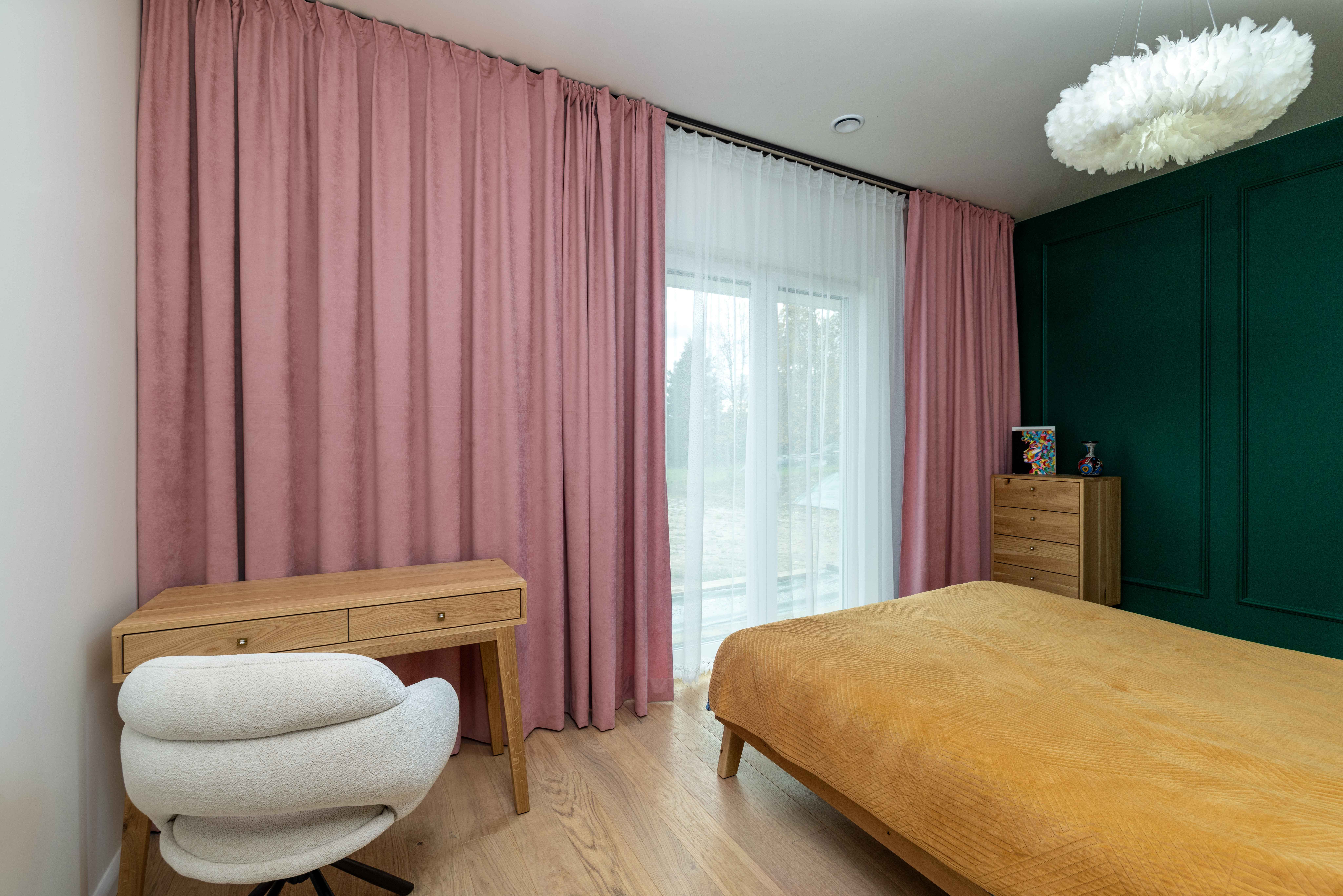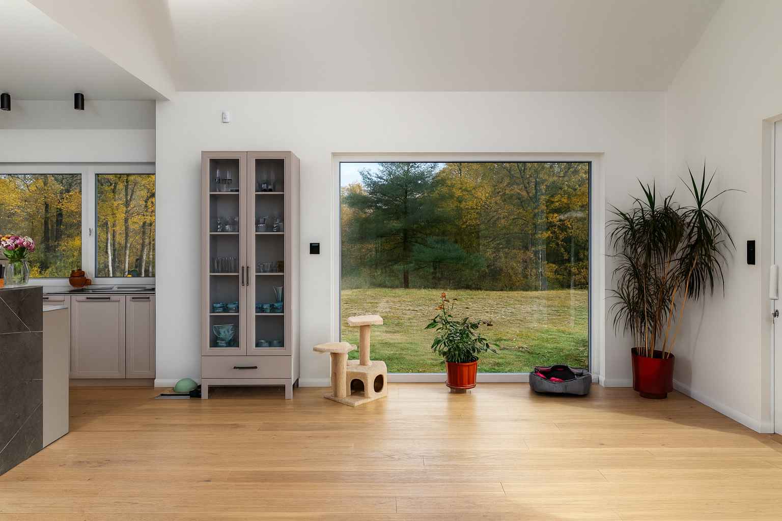 Wnętrze zostało zaprojektowane z myślą o komforcie i codziennym funkcjonalnym użytkowaniu — salon znajduje się wydzielonej części budynku, natomiast sypialnie ulokowano osobno, co zapewnia domownikom prywatność i ciszę. Dodatkowo zastosowanie dużych przeszkleń pozwala „zaprosić” otaczającą naturę do środka — wnętrza są jasne, przestronne, a dom staje się częścią otoczenia.
