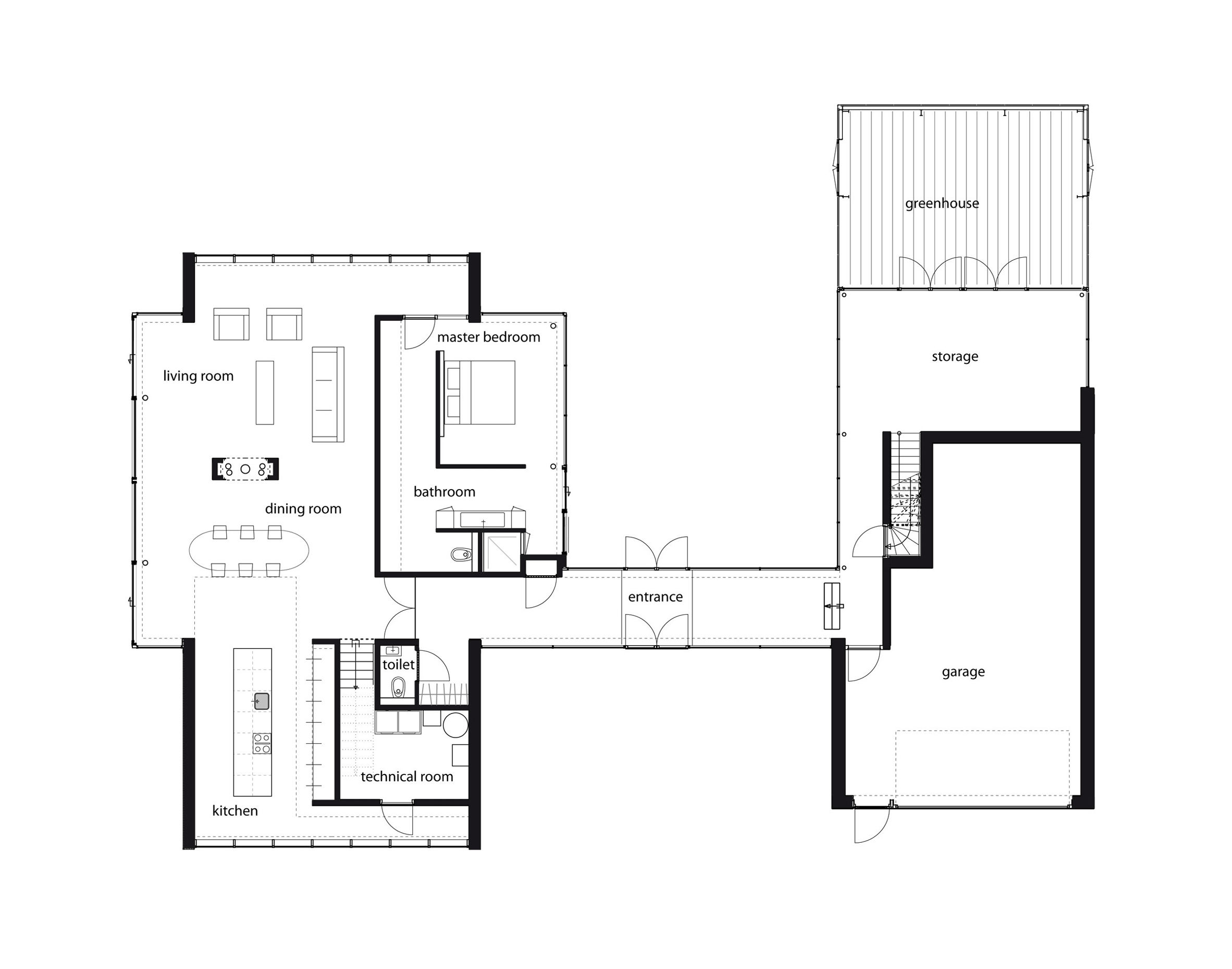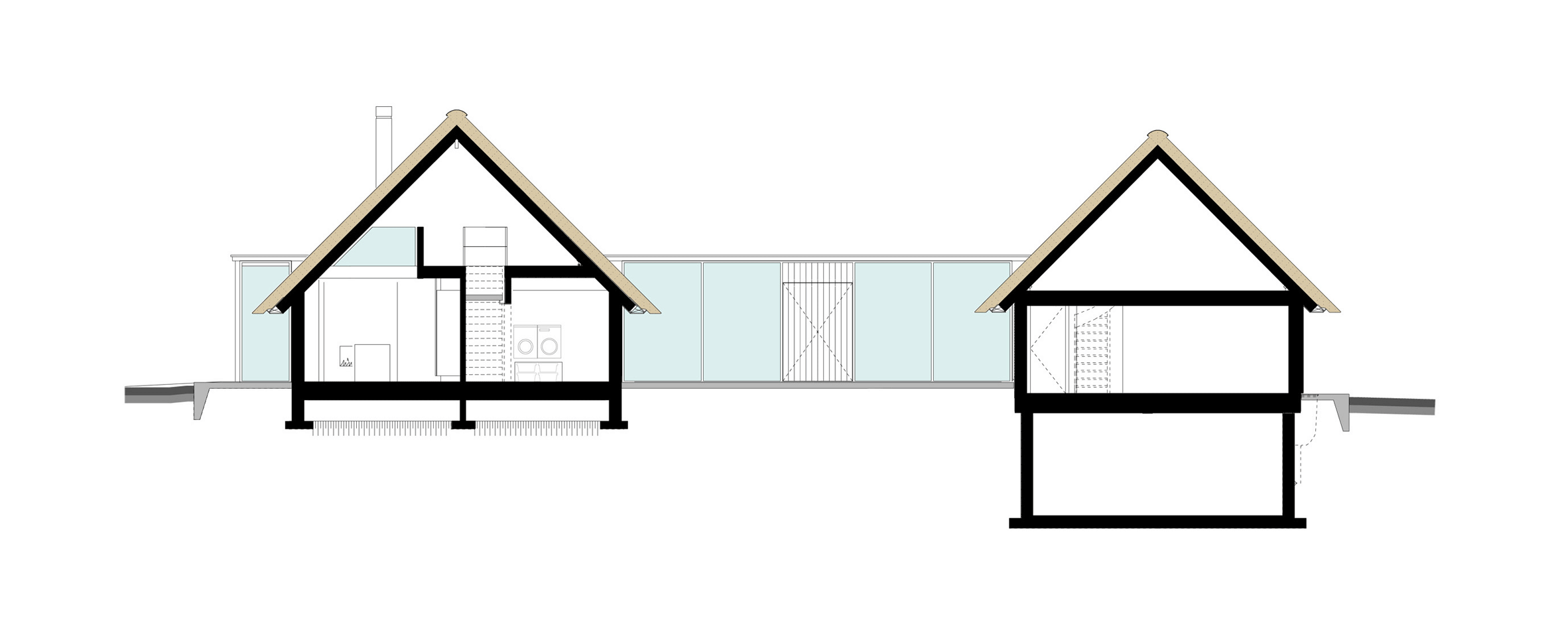 Budynek ma kształt litery H i dwa kontrastujące ze sobą skrzydła. Jedno z nich ma ciemną, drewnianą elewację. Drugie zespolono z konstrukcją z dużymi przeszkleniami. Lukę między skrzydłami wypełnia centralny, przeszklony korytarz, w którym znajduje się również wejście do domu. Element znajdujący się po prawej stronie od wejścia mieści garaż i przestrzenie użytkowe. To właśnie tą część połączono ze „szklarnią”, która wysuwa się spod dachu krytego strzechą. Przeszklony dach, który zachowuje ten sam kształt co główna część pokrycia, wpuszcza do wnętrza mnóstwo dziennego światła, a przestrzeń, która się pod nim kryje ma być wykorzystywana jako studio.