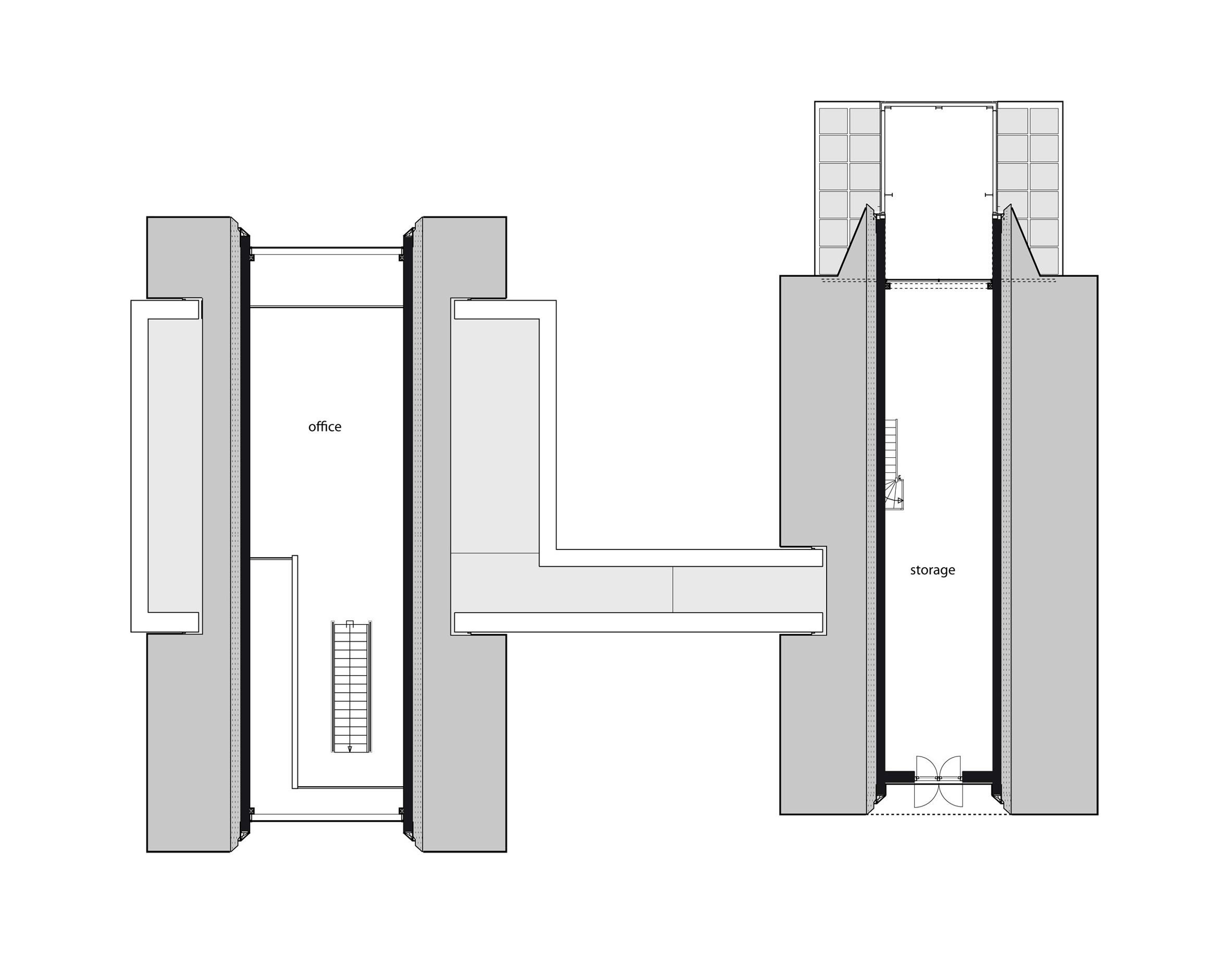 Po stronie przeciwnej znajduje się drugie skrzydło, w którym urządzono główne przestrzenie dzienne. Po bokach otoczono je w pełni przeszklonymi ścianami. Na granicy działki od frontu rośnie rząd drzew, które zapewniają wnętrzom niezbędną w tej sytuacji prywatność, chroniąc mieszkańców przed wzrokiem osób jeżdżących po pobliskiej drodze. Duże przeszklenia otwierają wnętrza, a szczególnie salon, jadalnię i studio na otaczające dom krajobrazy. „Kształt litery H tworzy prywatne przestrzenie zewnętrzne, w których można usiąść, by podziwiać zachód słońca” mówią architekci. „Dom zapewnia prywatność pomimo sporej ilości przeszkleń.”