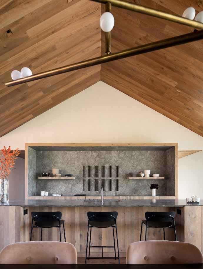 We wnętrzach Stony Hill przenikają się tradycja i nowoczesność, tworząc przestrzeń harmonijną i organicznie powiązaną z naturą. Odsłonięta strzecha, naturalny dąb, ceramika i tynki budują ciepły, wyciszający klimat, a liczne kominki integrują domowników wokół wspólnych przestrzeni. Dzięki holistycznemu podejściu do architektury i krajobrazu projekt Stony Hill nie tylko harmonizuje z otoczeniem, lecz również opowiada jego historię, wzbogacając codzienne życie mieszkańców o głębszy kontekst i związek z miejscem.