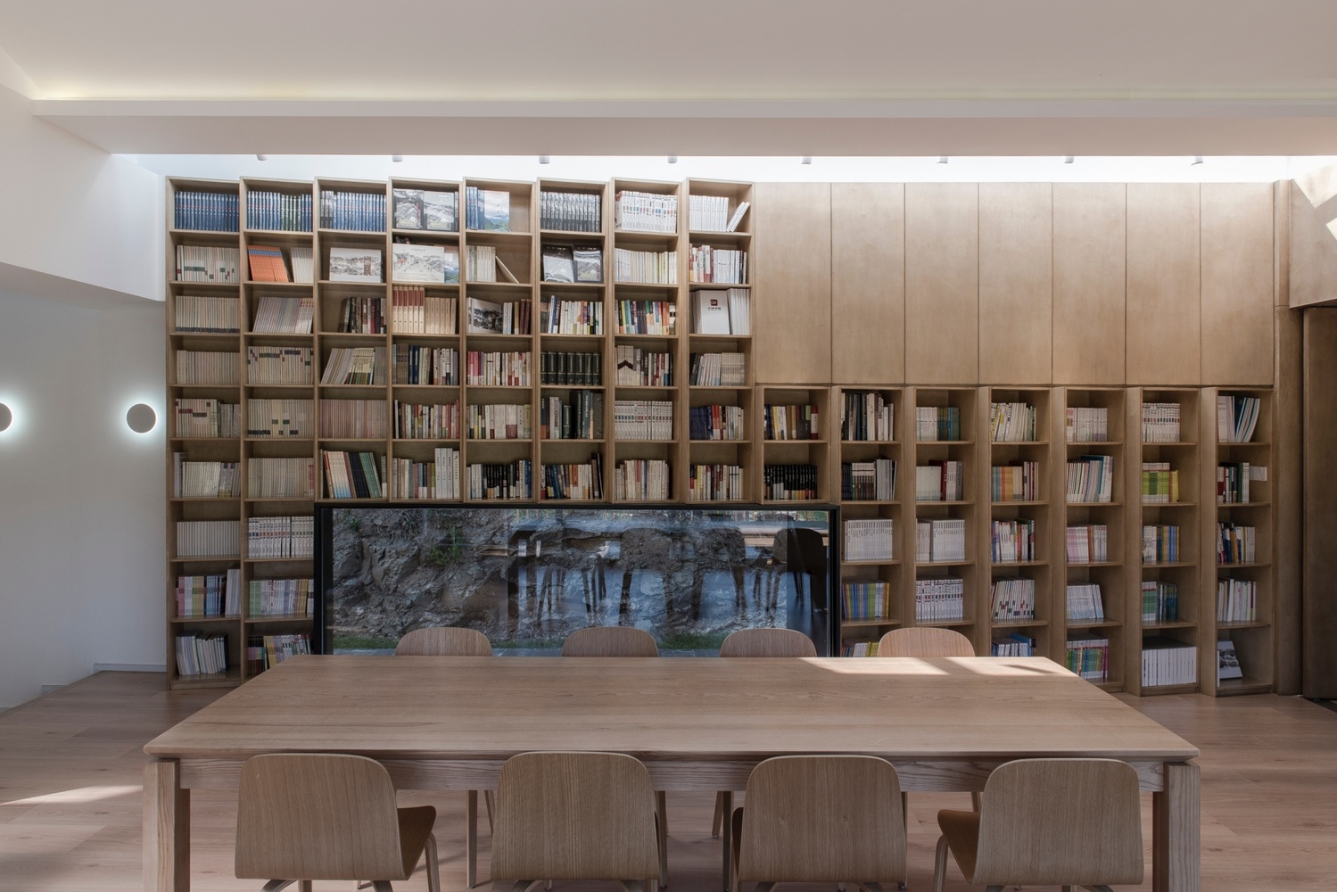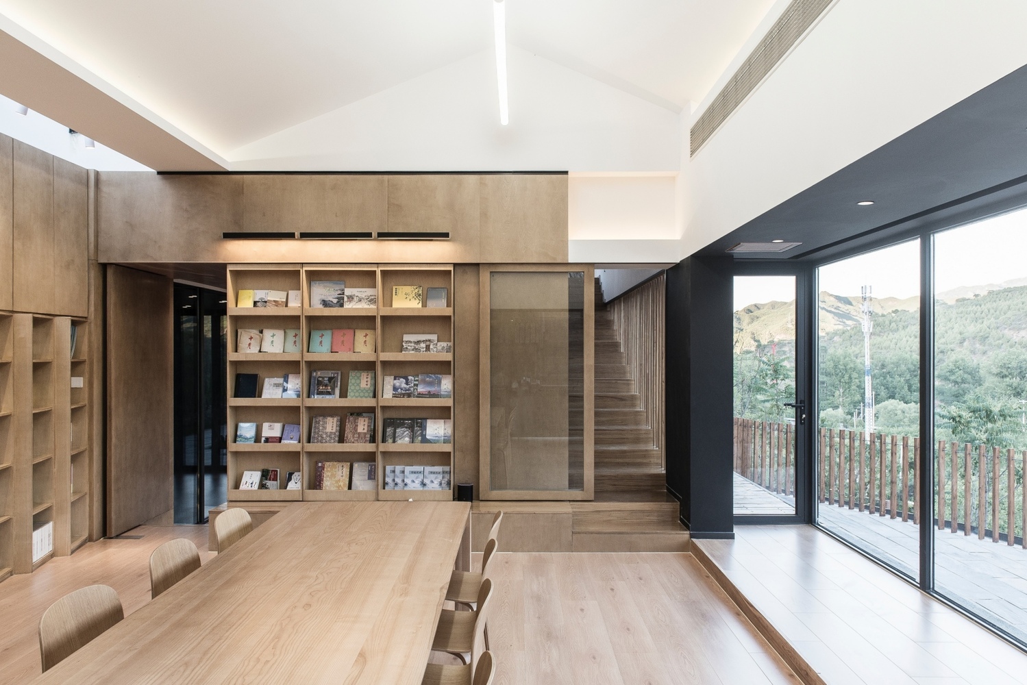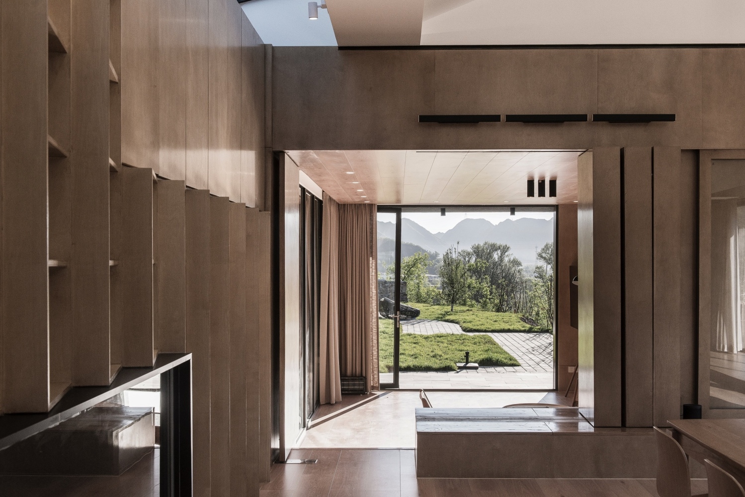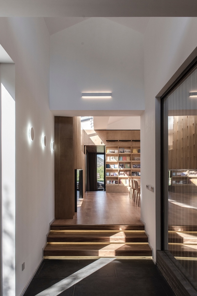 Różnice wysokości terenu stały się punktem wyjścia dla przestrzennego układu wnętrz. Kolejne poziomy tworzą subtelną sekwencję, a światło wpadające przez świetliki dachowe stale zmienia atmosferę przestrzeni. W centrum budynku znalazła się otwarta strefa aktywności, którą można łatwo przeorganizować dzięki mobilnym elementom wyposażenia. Naturalne materiały i miękkie faktury podkreślają związek obiektu z otaczającą górską naturą.