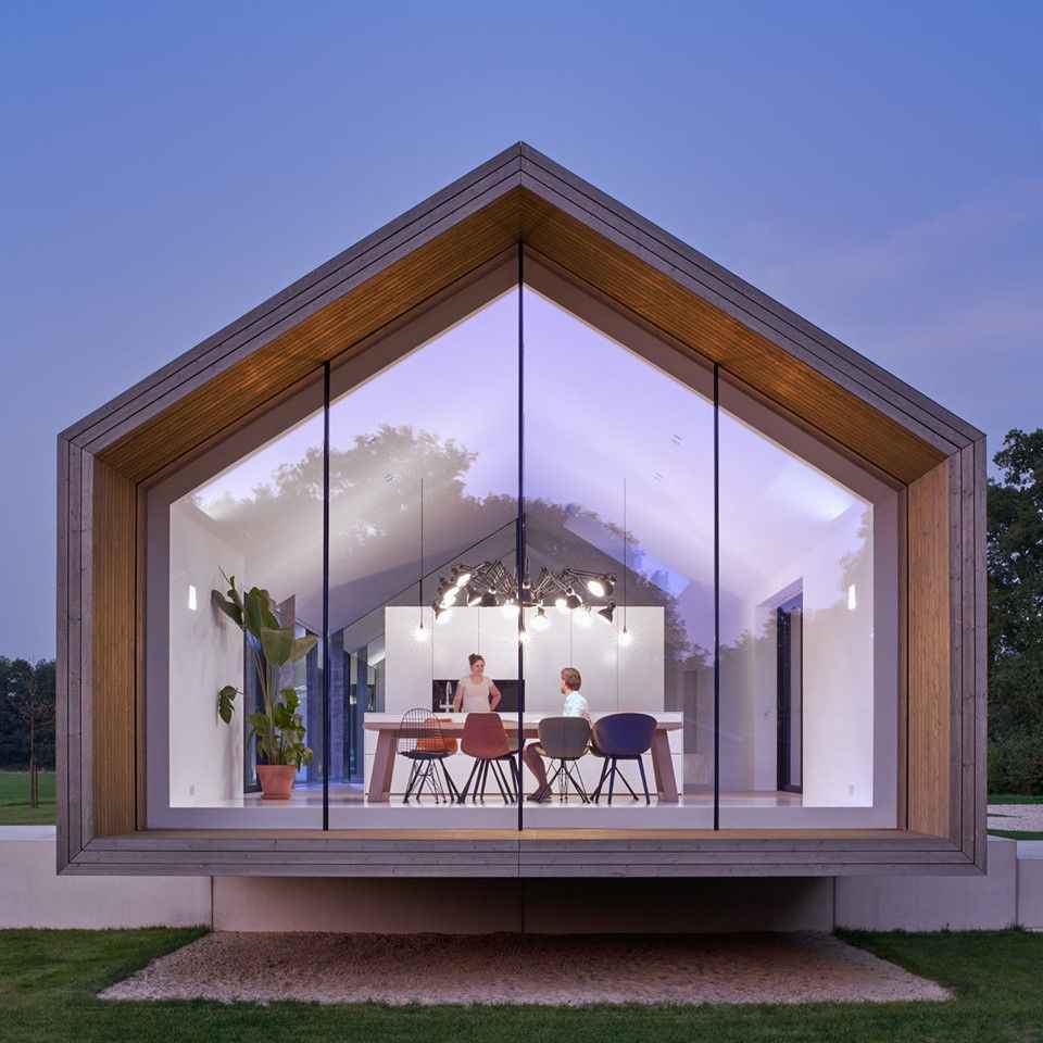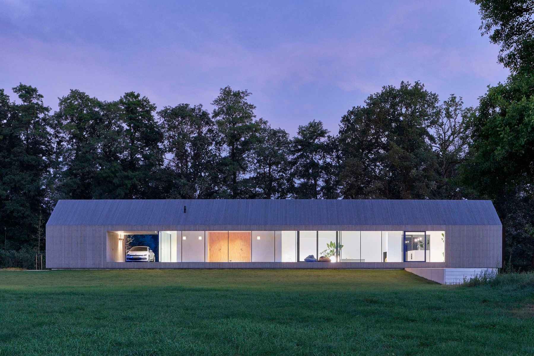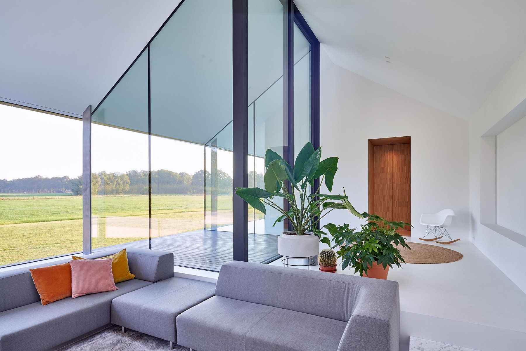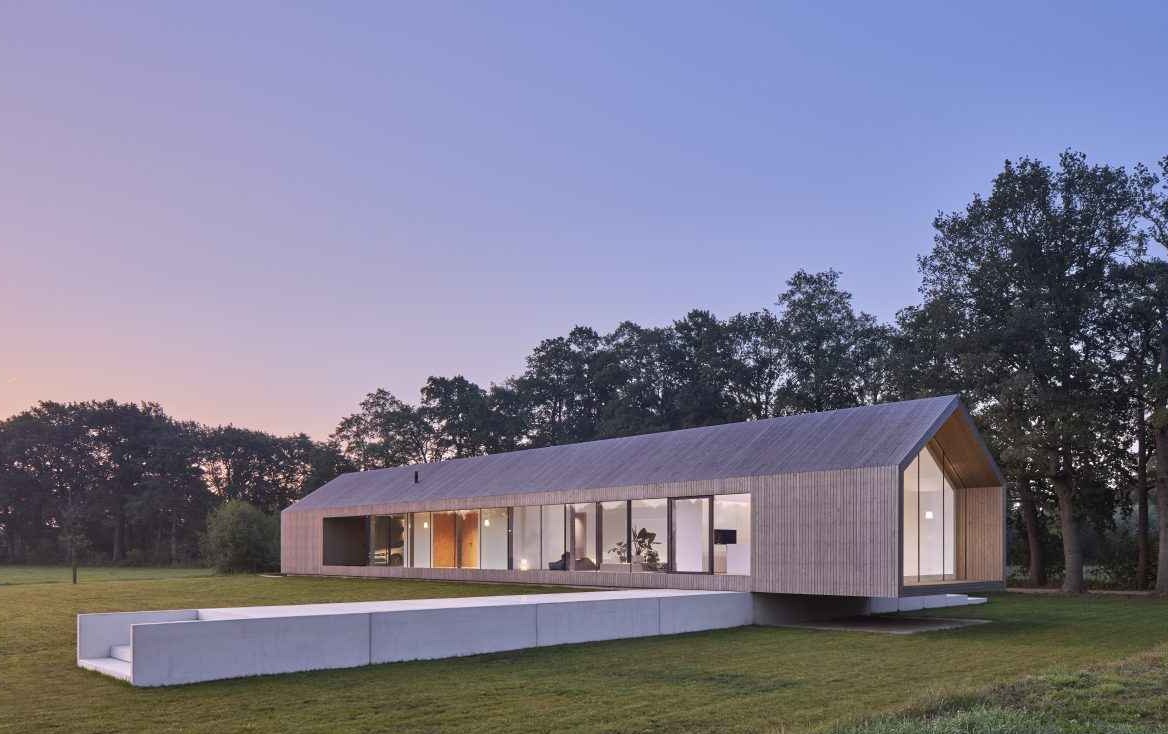 Bryła nowego budynku nawiązuje do klasycznego, wydłużonego kształtu dawnej stodoły, idealnie wpisując się w zielony krajobraz regionu Twente. Nazwa Het Kleine Krikhaar zachowuje pamięć o historycznym budynku, który kiedyś znajdował się w tym samym miejscu. Nowy dom został zaprojektowany tak, by maksymalnie wykorzystać otaczające widoki – od strony jadalni rozciąga się panorama zachodniego horyzontu, z kuchni widać południe i północ, a w salonie, dzięki świetlikowi, można podziwiać także niebo. Centralnym punktem domu jest przeszklone patio – miejsce relaksu i rodzinnych spotkań. Całość utrzymana jest w duchu nowoczesnej stodoły, w której naturalne materiały, światło i przestrzeń tworzą harmonijną całość.
