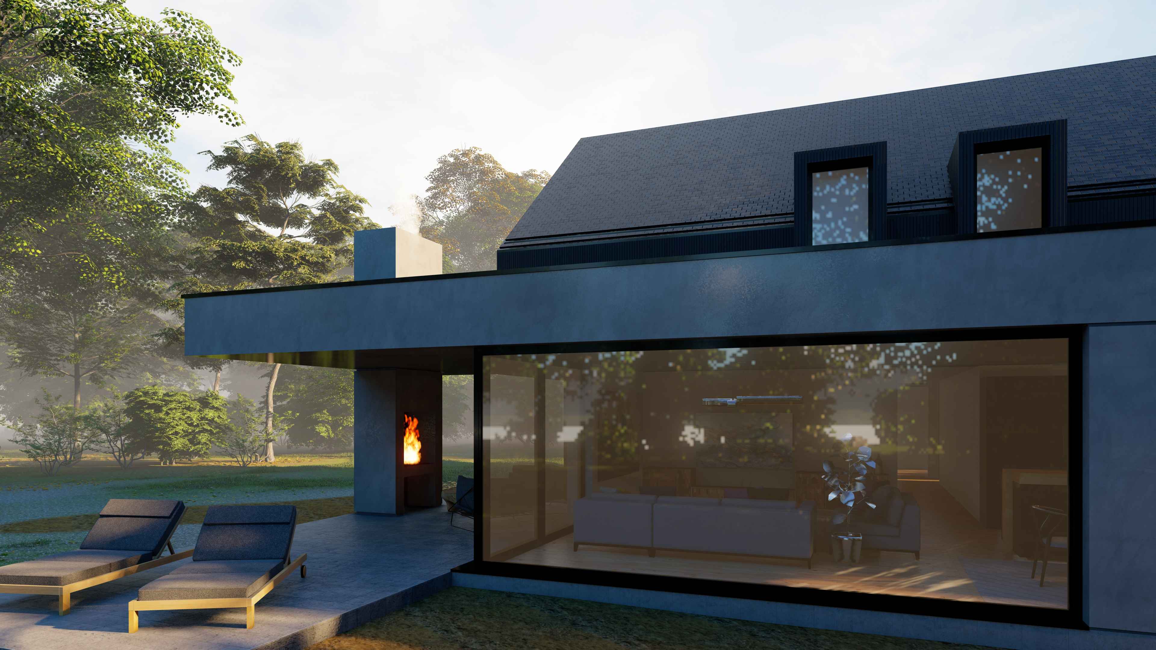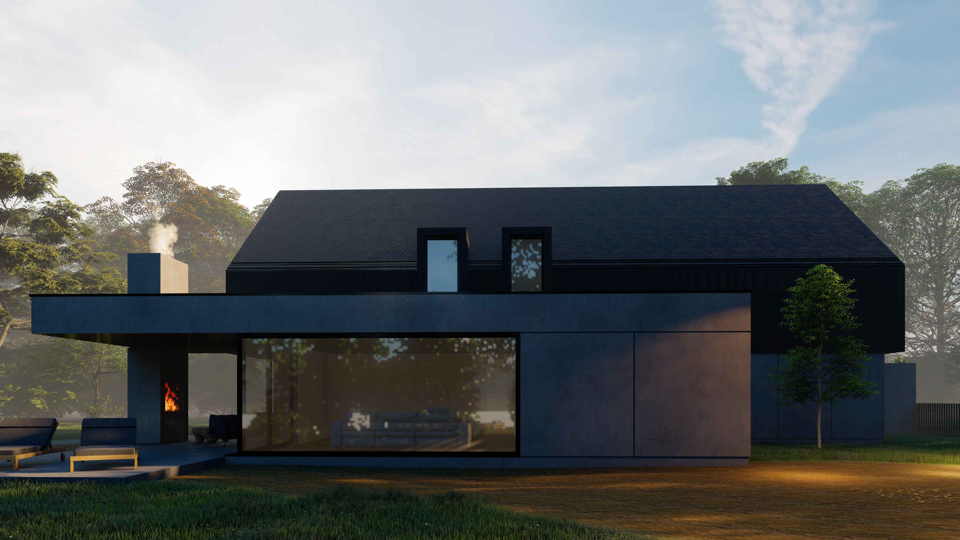 Zależało nam na osiągnięciu balansu między modernizmem a naturą. Elewację parteru zaprojektowaliśmy w nowoczesnej formie z zastosowanym betonem architektonicznym i przemyślanym podziałem odwzorowującym linie nadproży okiennych - podział na płyty miał zadanie wprowadzić spokój i porządek.