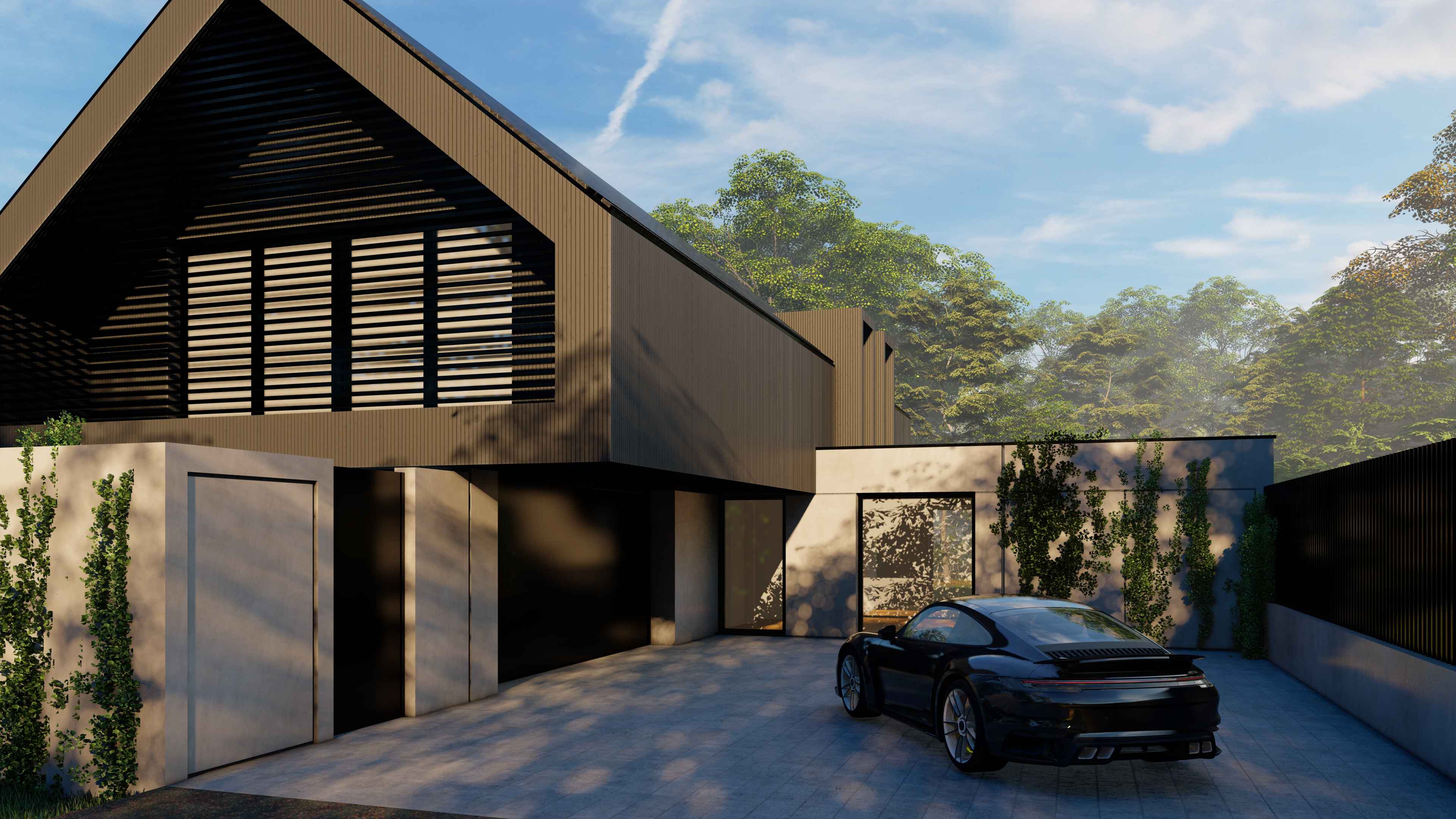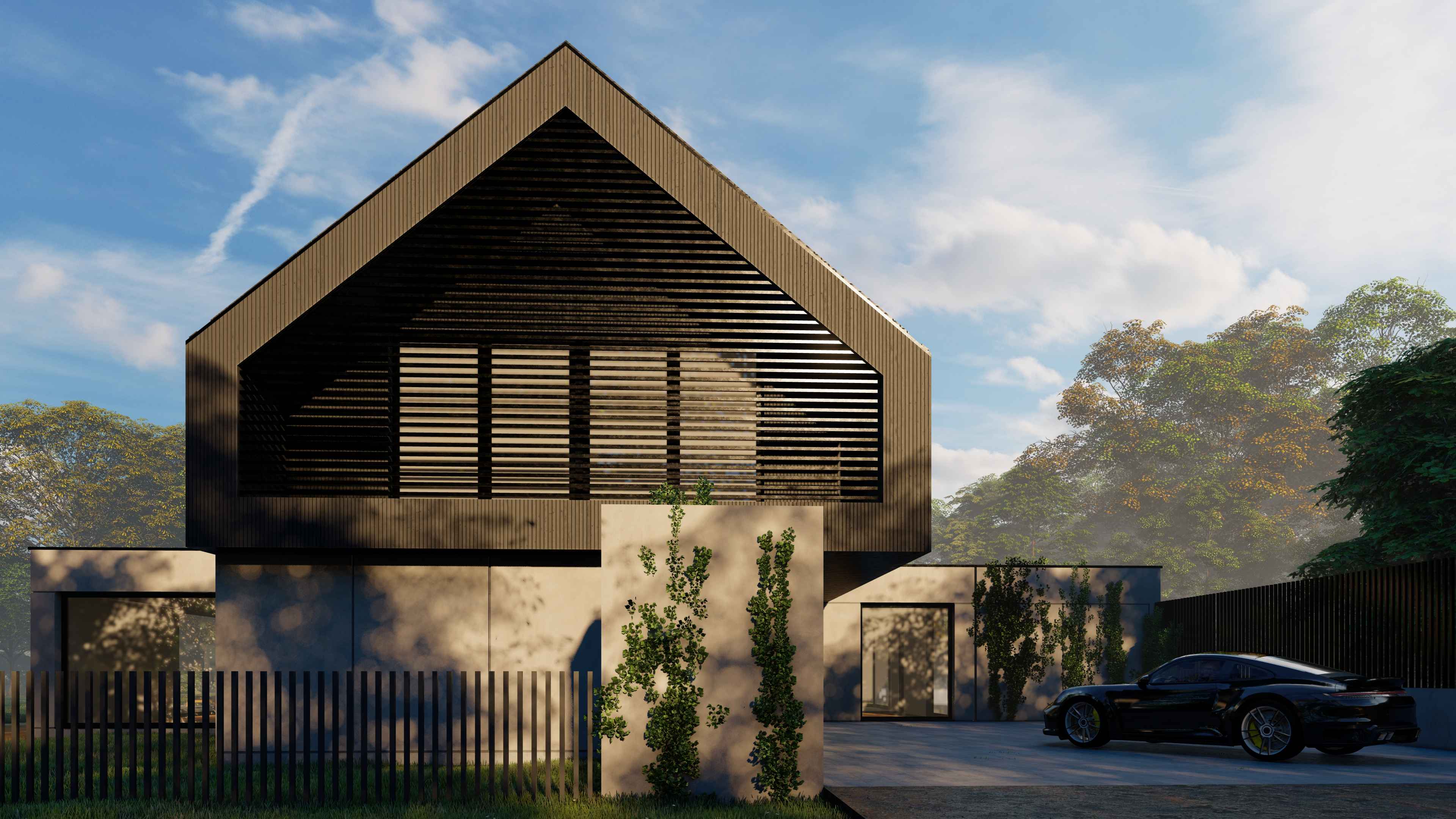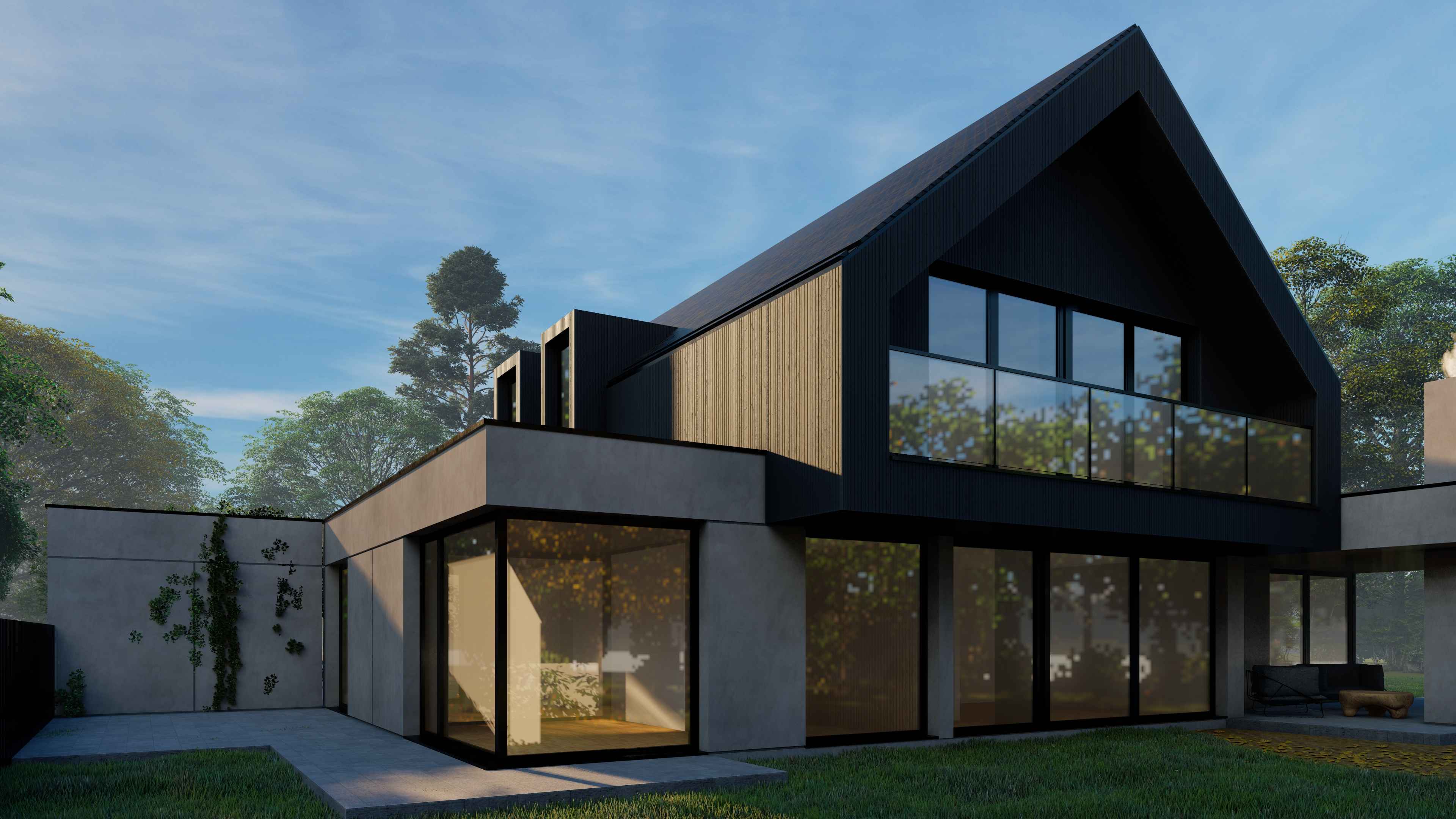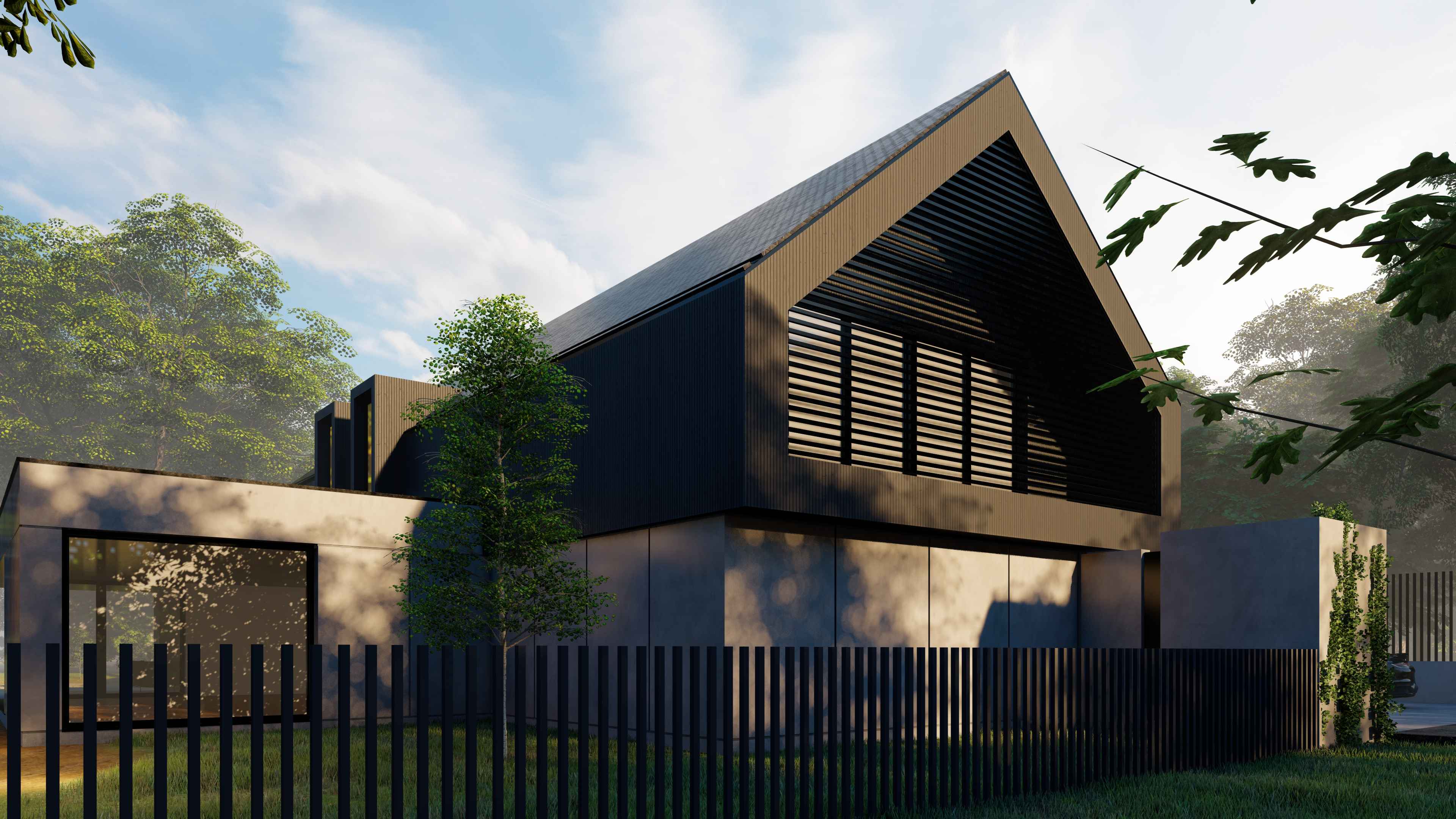 Góra budynku została zaprojektowana z czarnej deski elewacyjnej w tradycyjnej formie dachu dwuspadowego, tak aby nie odbiegała od zabudowy sąsiedniej, ale poprzez czarny kolor elewacji wtapiała się w korony otaczających drzew i nie dominowała nad zielenią. Otwarty podjazd do budynku, ogrodzenie palisadowe i poziome lamele na frontowej elewacji tworzą całość i definiują budynek.