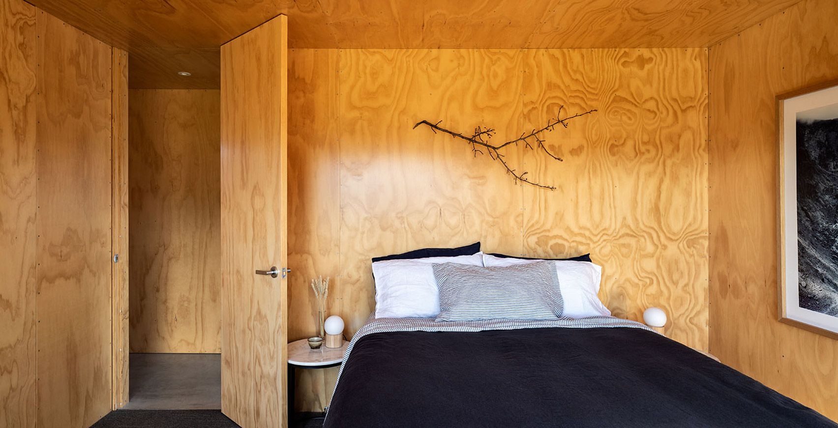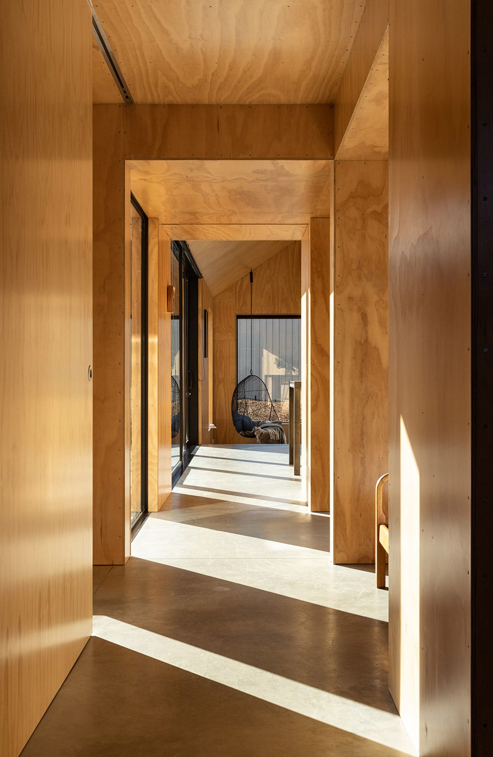 Podział nowoczesnej stodoły na dwa elementy zapewnia większą prywatność sypialniom. Jeśli właściciele będą chcieli, mogą wynająć jedną lub dwie sypialnie gościom, choć nie są one w pełni odizolowane od części głównej domu. W sypialniach zainstalowano przesuwne drzwi o pełnej wysokości, aby umożliwić otwarcie przestrzeni i stworzenie wrażenia połączenia. Na każdym końcu budynku stworzono także wyjście na zewnątrz. Dzięki temu powstał wewnętrzny korytarz.