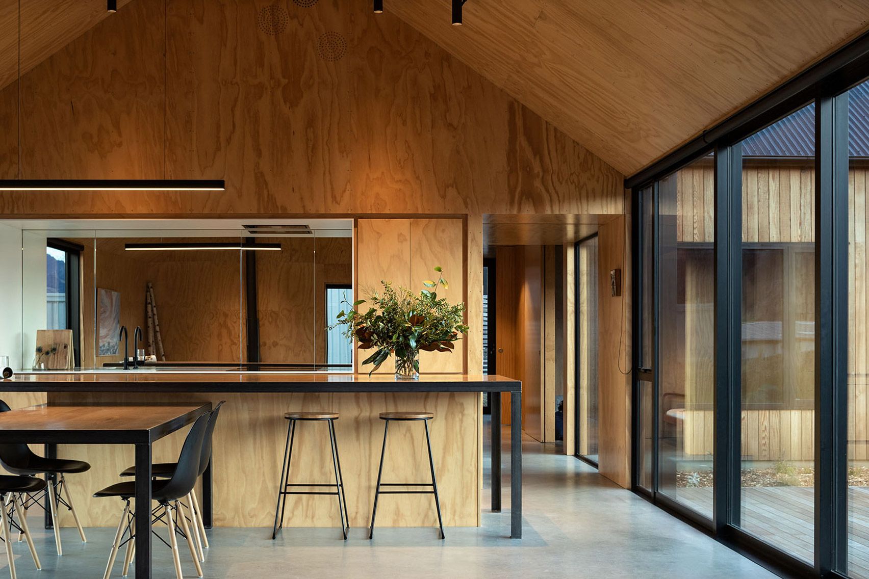 Zarówno wewnątrz, jak i na zewnątrz nowoczesnej stodoły dominuje drewno. Jest ono głównym materiałem wykończeniowym w tym projekcie. Elewację domu stanowią ułożone pionowe deski, a ściany wewnętrzne oraz sufity obłożono panelami ze sklejki. Wprowadzają one do wnętrza poczucie ciepła i atmosferę górskiej chaty. W części dziennej od środku widać dwuspadową formę dachu, który pozostał odsłonięty i tworzy teraz wyższą przestrzeń zorganizowaną wokół opalanego drewnem pieca. W tym miejscu betonowe podłogi subtelnie podkreślają swój charakter, różniąc się od materiału wykorzystanego w innych częściach domu. Na dwóch końcach skrzydła z sypialniami urządzono dwie łazienki, które wykończono sklejką połączoną z białą płytką ceramiczną.