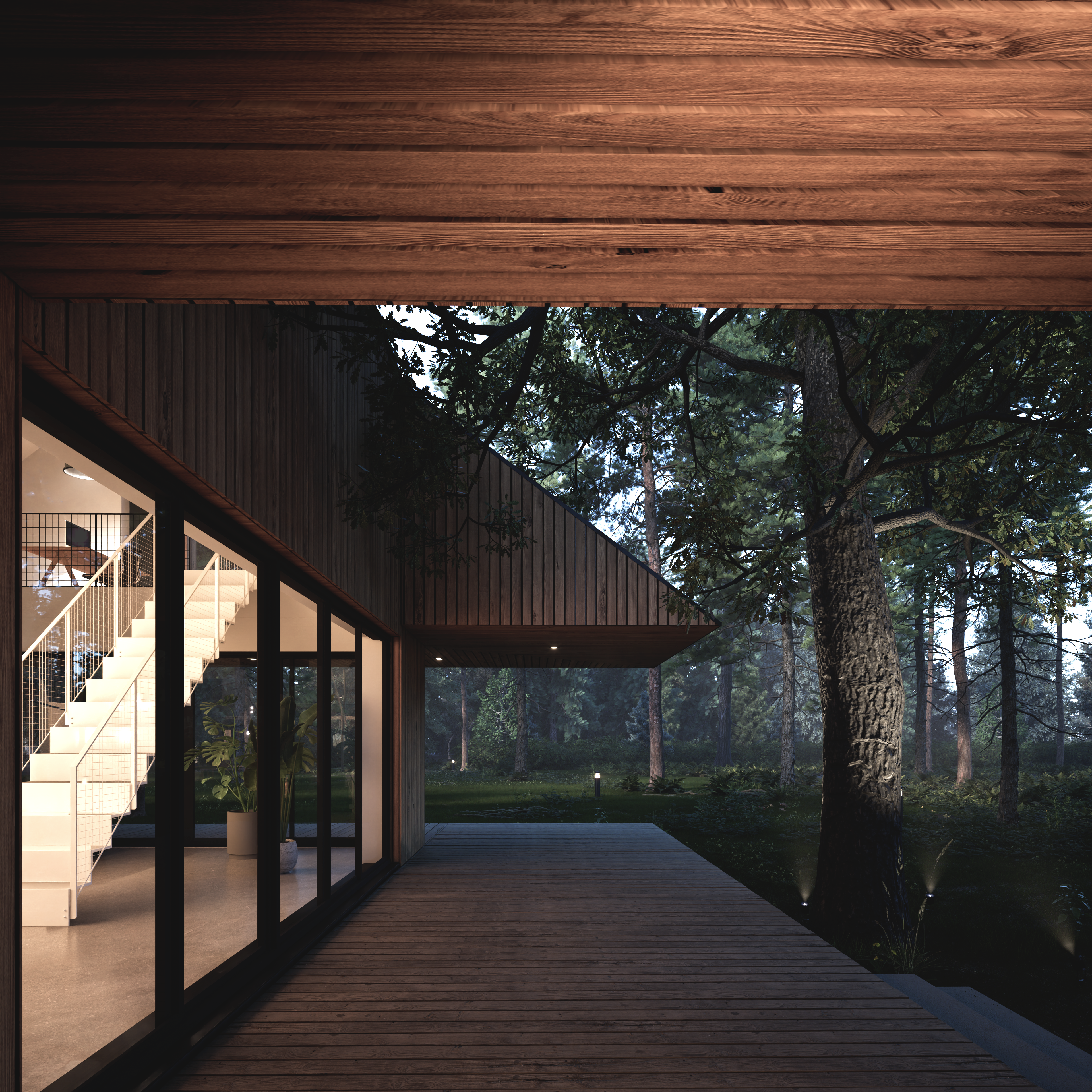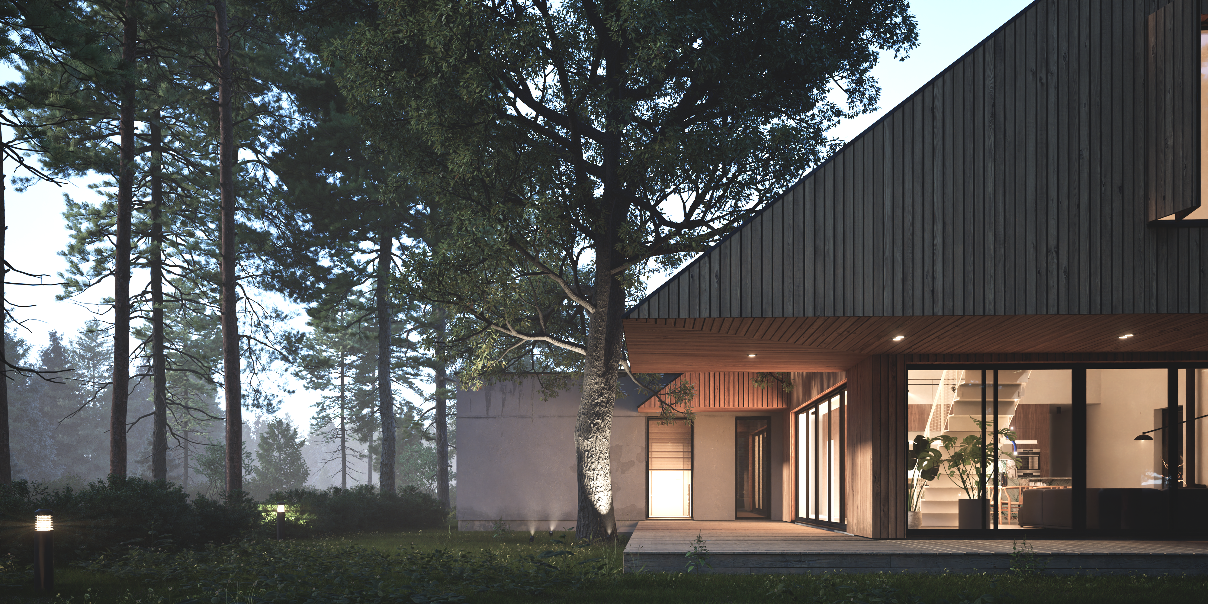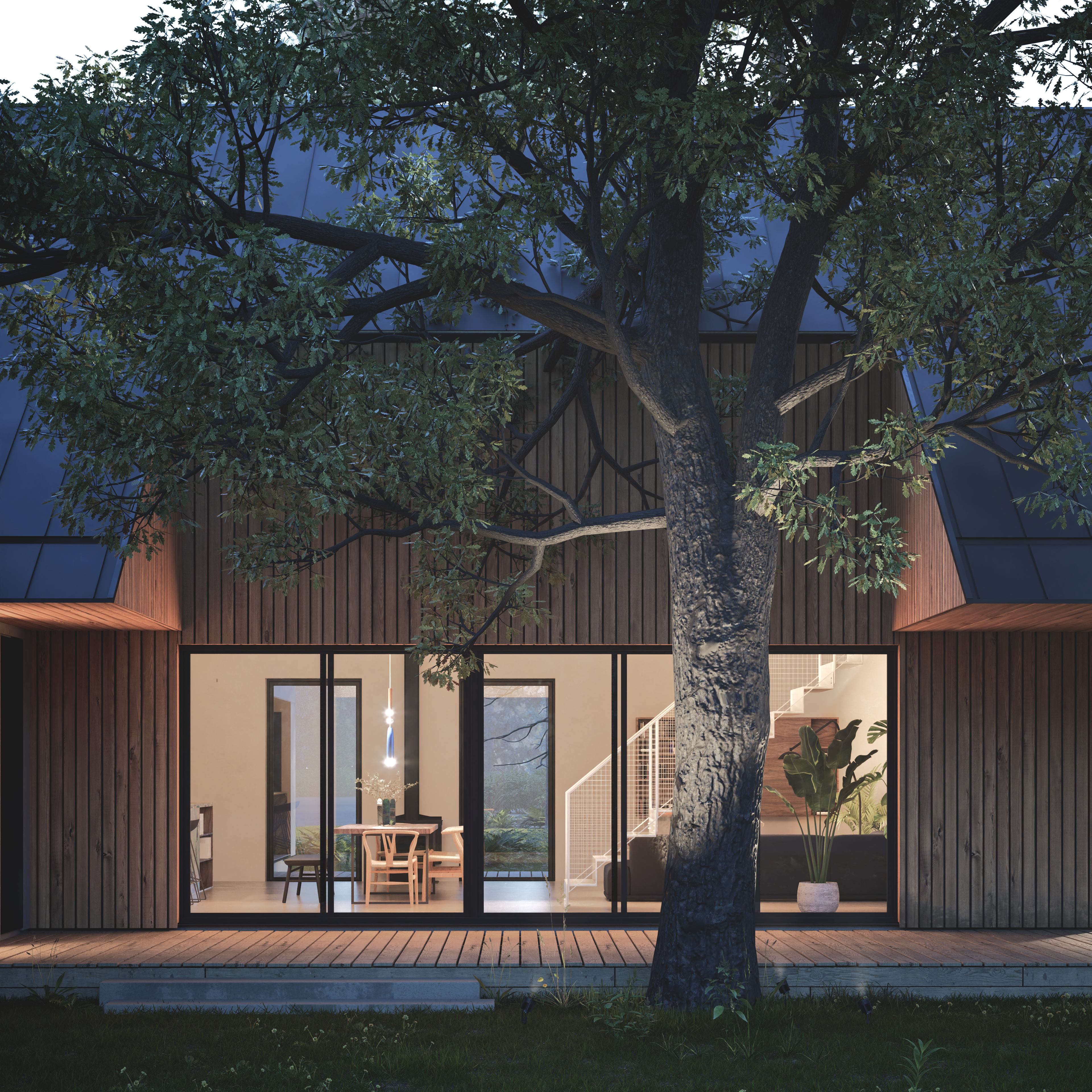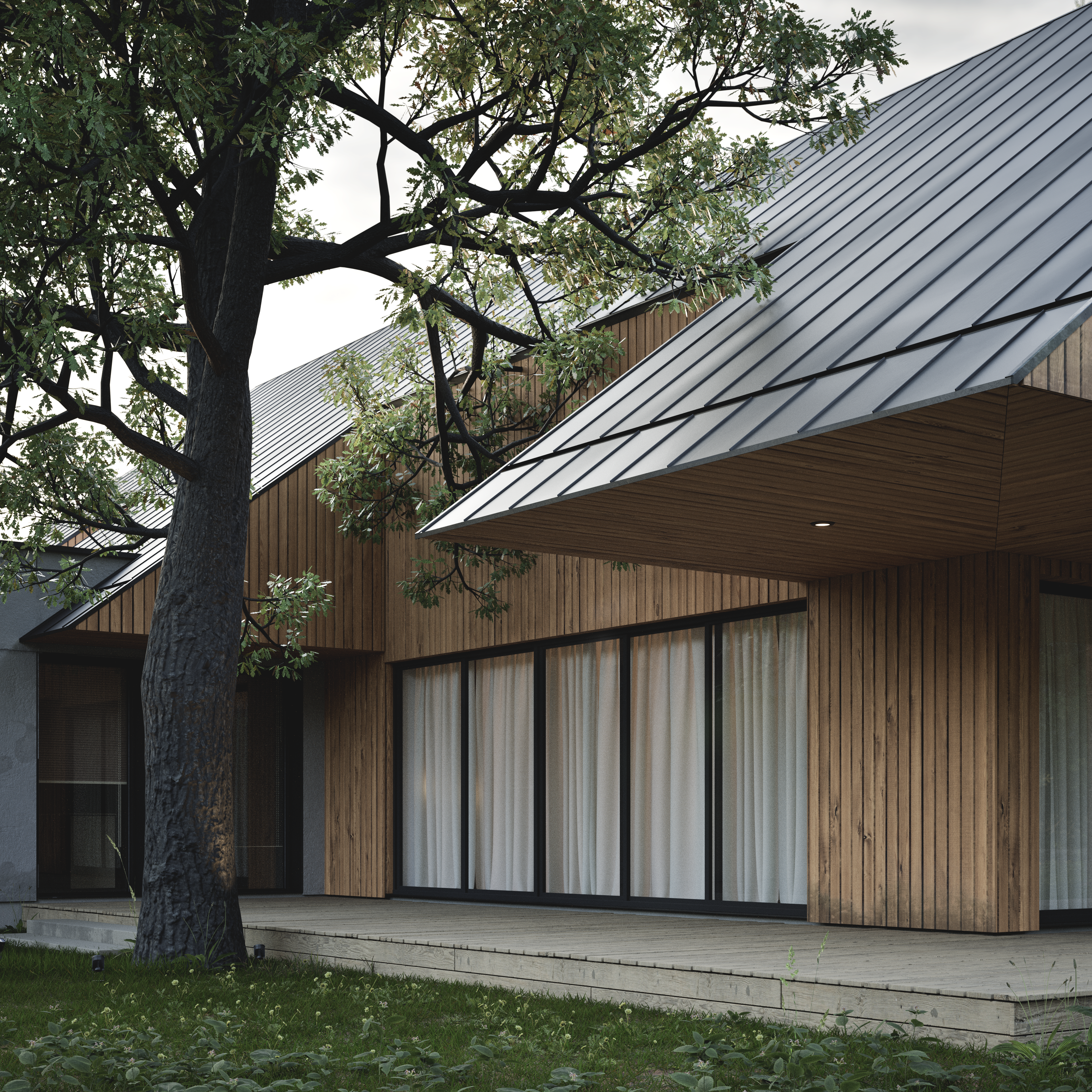 W podwarszawskich Markach, na pięknej działce, zaprojektowaliśmy dom. Naszym zadaniem było dopasowanie projektu do porośniętej drzewami działki inwestorów tak, aby zachować istniejący na niej drzewostan. Dom wsunęliśmy pomiędzy trzy wspaniałe drzewa: dąb, sosnę oraz brzozę. Bryła domu jest podzielona na trzy części. Monolityczne, betonowe prostopadłościenne bloki na froncie, część przeszkloną, parterową „wpuszczającą” las do wnętrza oraz drewnianą bryłę piętra - czapę przykrywającą pozostałe części, dającą zadaszenie przestronnemu tarasowi. W górnej bryle zaprojektowaliśmy wycięcie zapewniające przestrzeń dla rozłożystych gałęzi dębu.