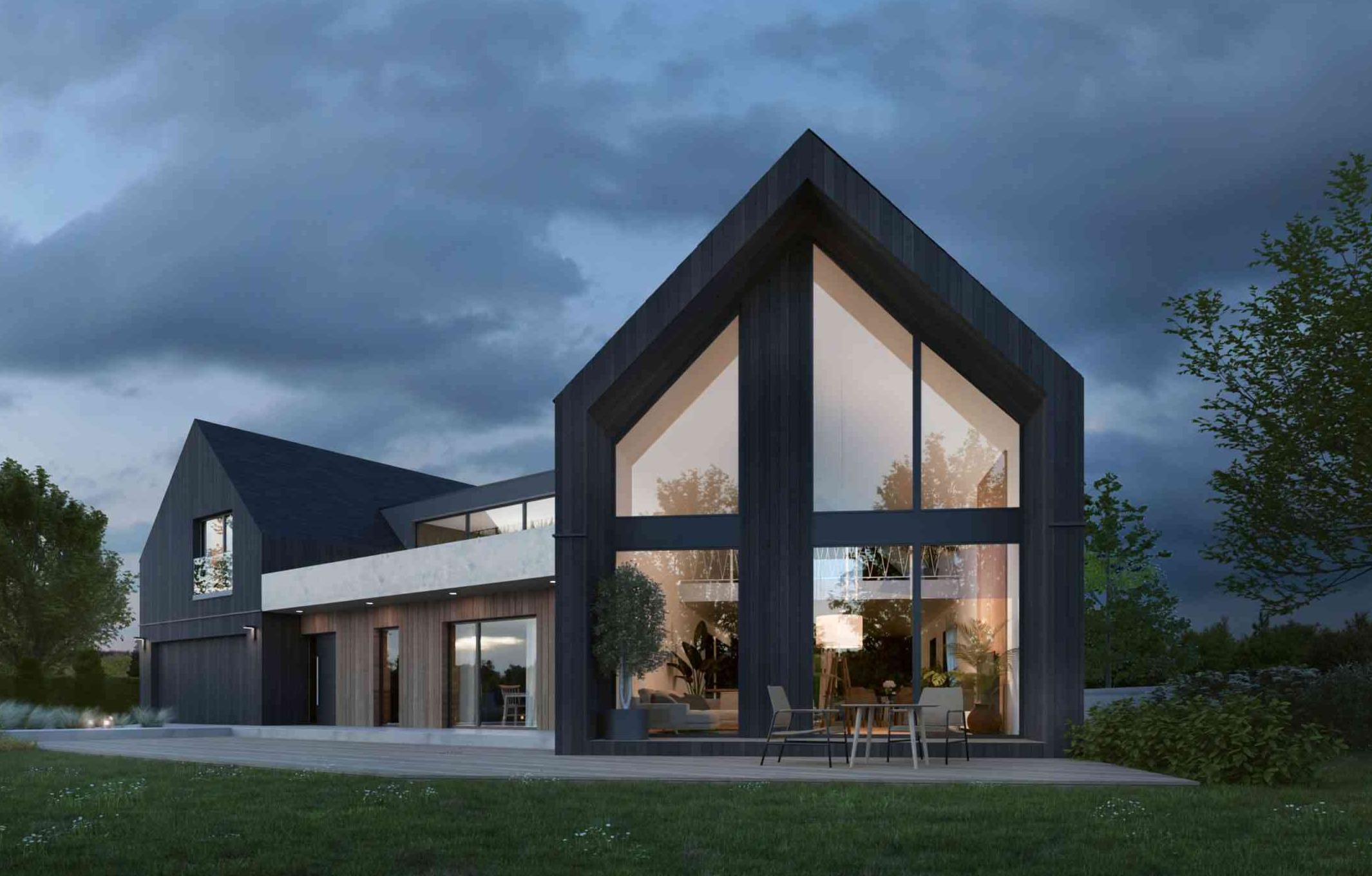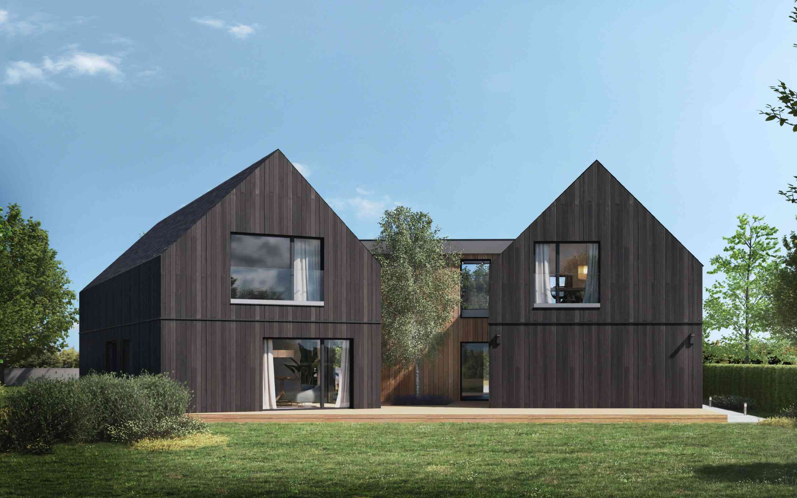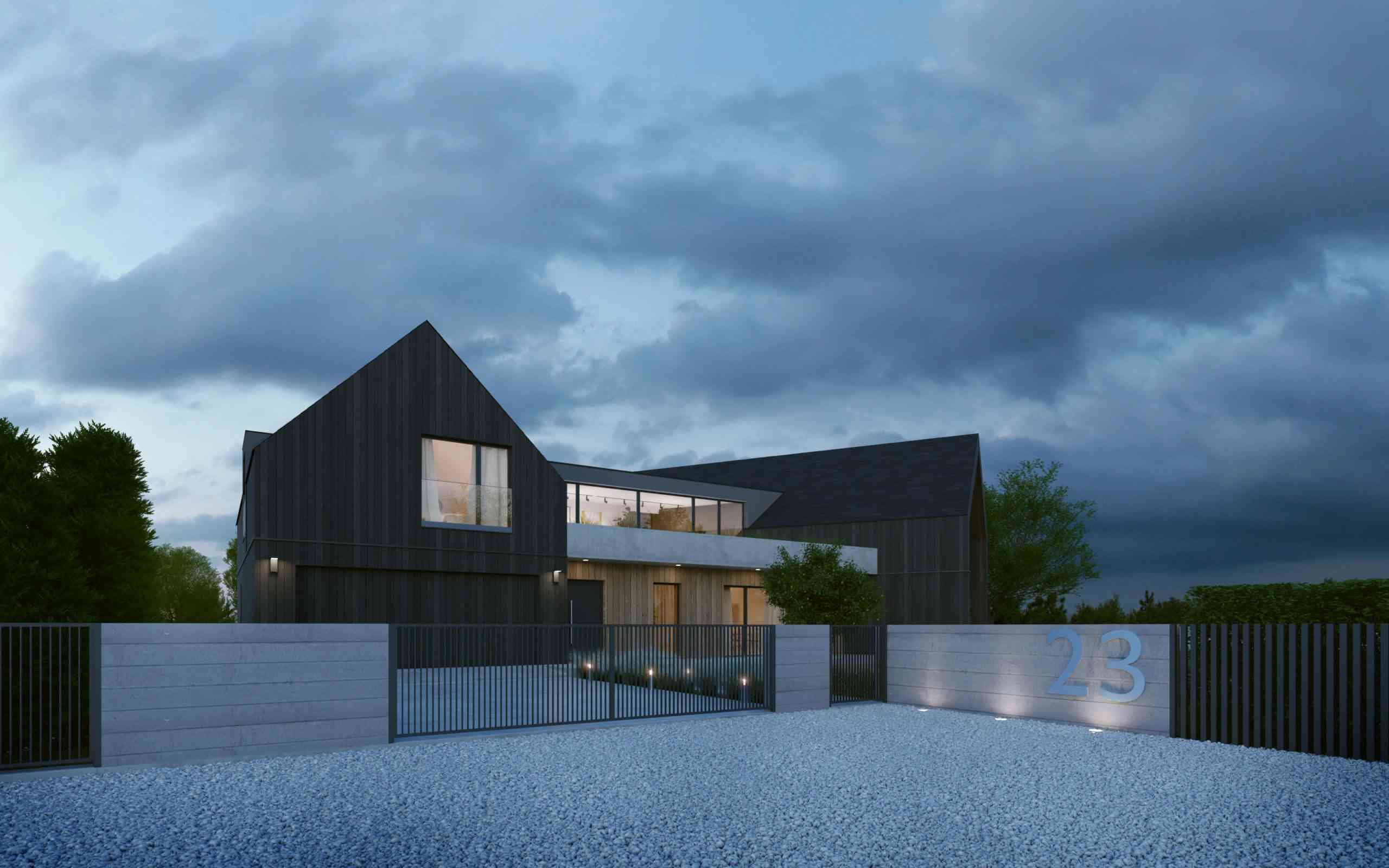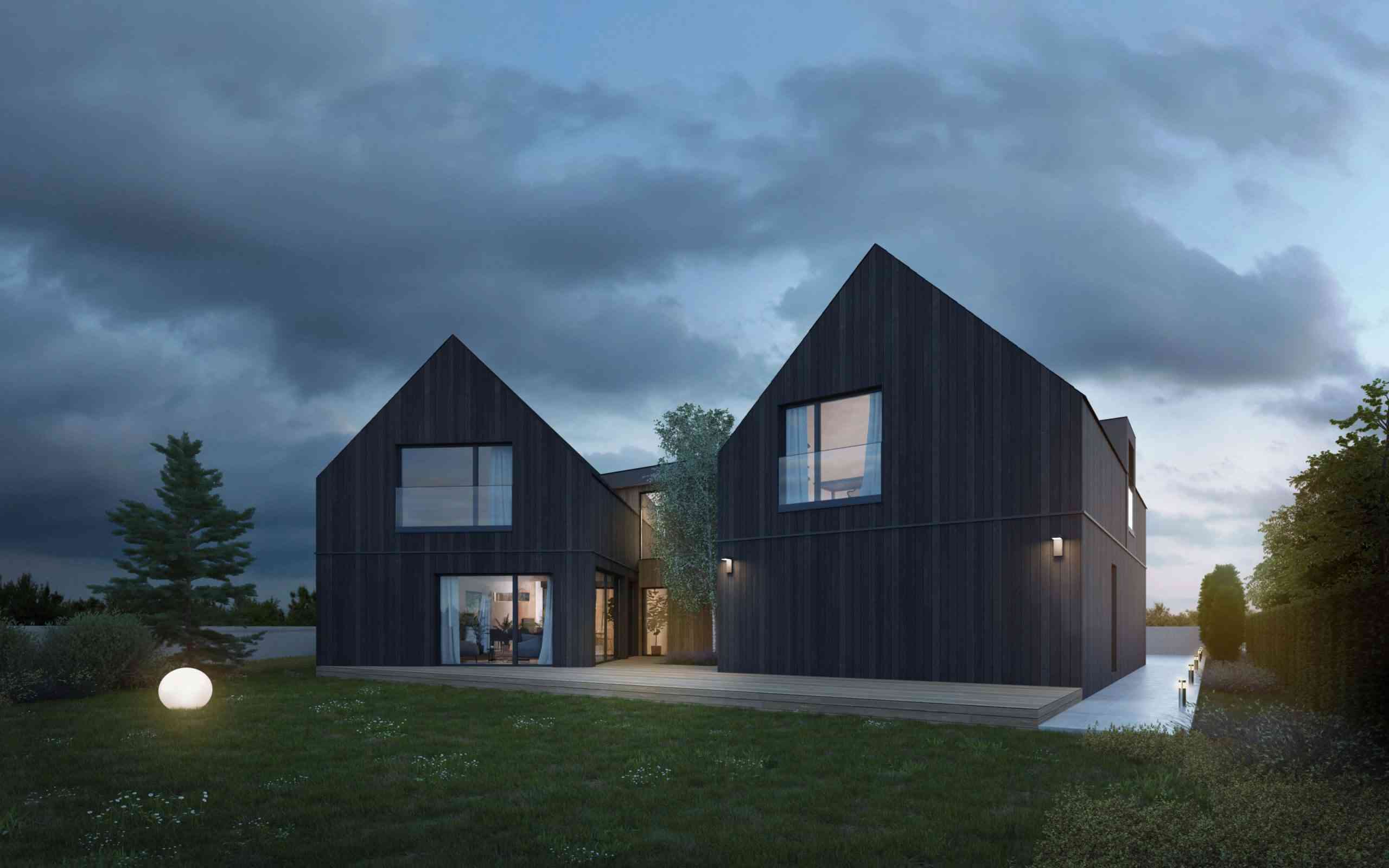 Projekt domu jednorodzinnego w Toruniu został zaprojektowany jako zestaw dwóch brył typu stodoła połączonych dwupoziomowym łącznikiem. Wyjściowym punktem była nieregularna działka o kształcie trapezu z wcięciem na wjazd w północno-zachodniej części. Jedną ze stodoł obrócono o 30 stopni, tworząc optymalną oś dla południowego światła wpadającego przez przeszklenia ściany szczytowej. Taka orientacja zapewnia intymność części dziennej i zmienia perspektywę wnętrz w stosunku do drogi dojazdowej, jednocześnie harmonizując bryłę z granicą nieruchomości.