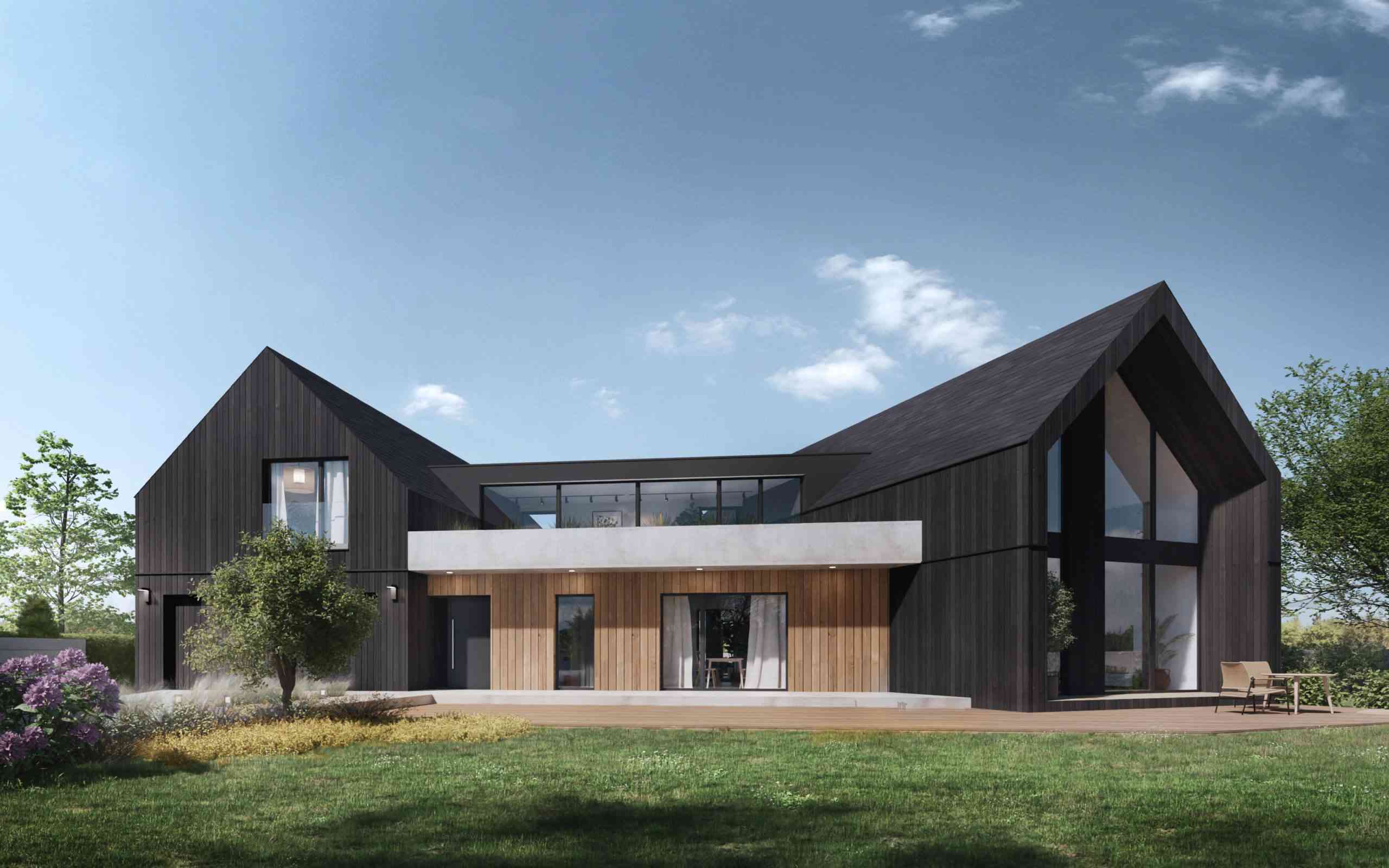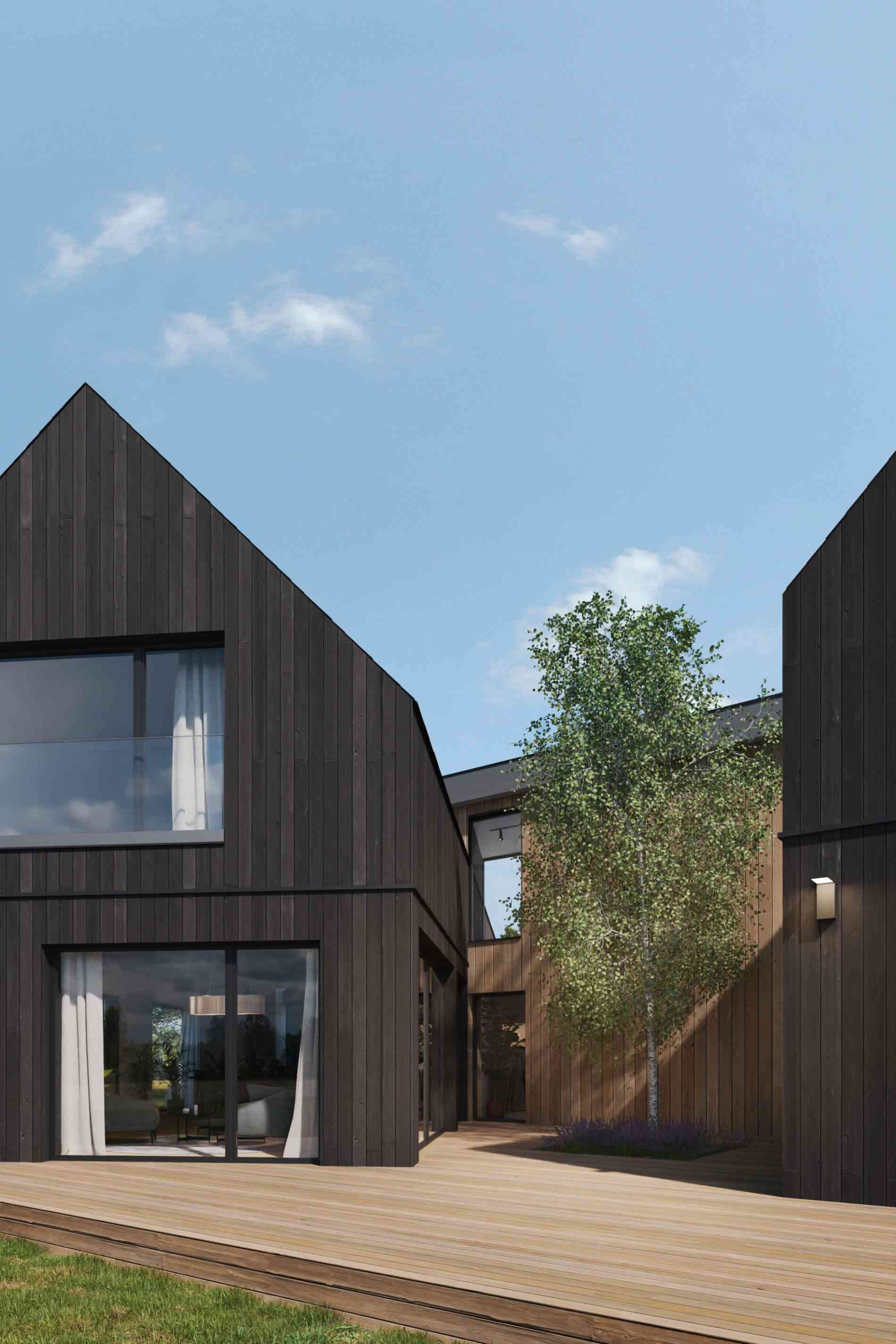 Dom otwiera się na działkę z jednej strony, a z drugiej tworzy zwężenie, w którym zaprojektowano atrialną przestrzeń z zielenią i drzewem, dającą naturalny cień w upalne dni. Ściany zewnętrzne budynku i tarasu wykończono opalanym i jasnym drewnem świerkowym, uzupełnionym o elementy betonu architektonicznego, co podkreśla współczesny charakter brył, zachowując jednocześnie harmonijną integrację z naturalnym otoczeniem działki i funkcjonalnym układem wnętrz.