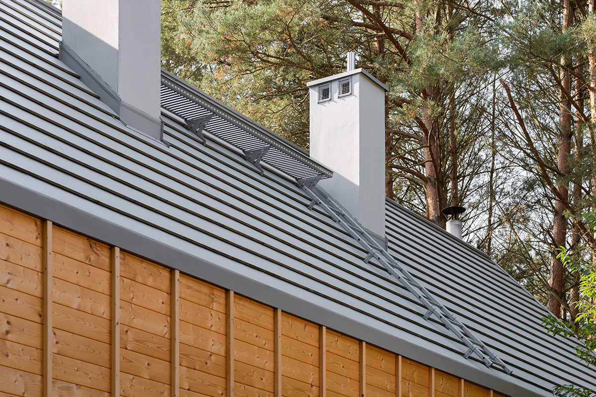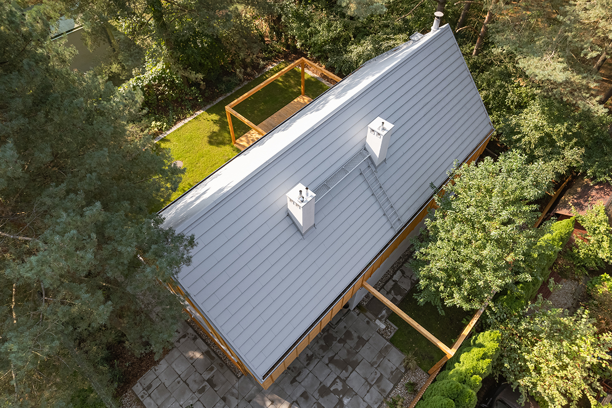W tego typu projektach dach nie jest jedynie zwieńczeniem bryły — to jeden z kluczowych elementów kompozycji. Zastosowana płaska blachodachówka modułowa Ruukki Hyygge w kolorze szarym (~RAL 7045) wpisuje się w minimalistyczny charakter budynku. Jej geometryczny podział tworzy subtelną strukturę, która porządkuje powierzchnię dachu i nadaje jej elegancki, współczesny wyraz. To rozwiązanie, które nie konkuruje z architekturą — lecz ją podkreśla.