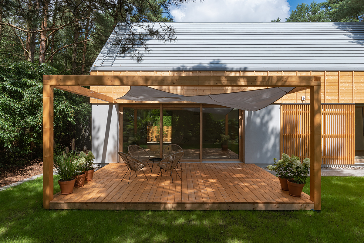 Jednym z najmocniejszych aspektów projektu jest jego konsekwencja materiałowa. Ograniczona paleta barw i faktur pozwala osiągnąć efekt harmonii, bez wizualnego chaosu. Szarość pokrycia dachowego koresponduje z naturalnym odcieniem drewna, tworząc spokojną, ponadczasową kompozycję. To estetyka, która nie podąża za chwilowymi trendami, lecz opiera się na trwałych wartościach architektonicznych.