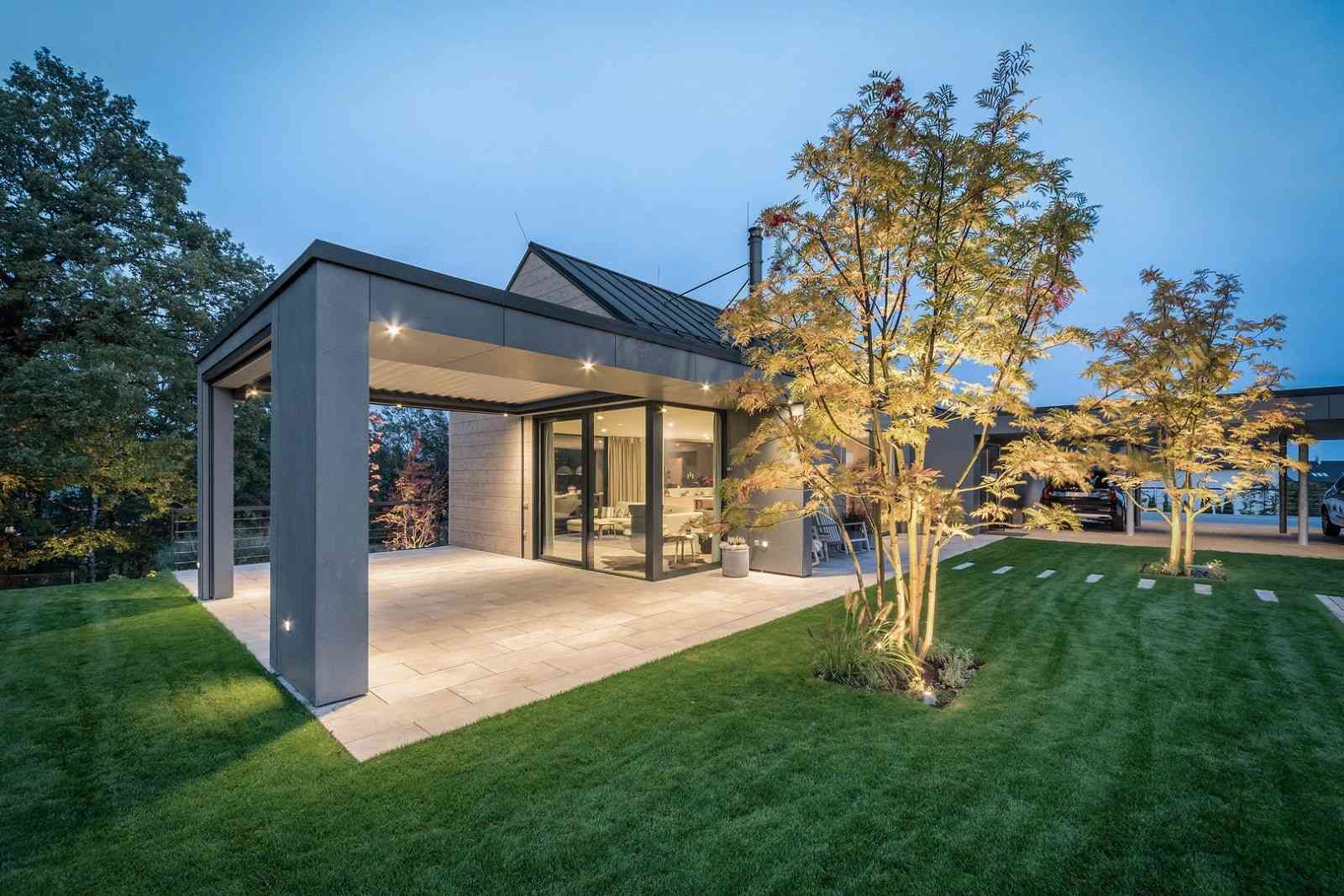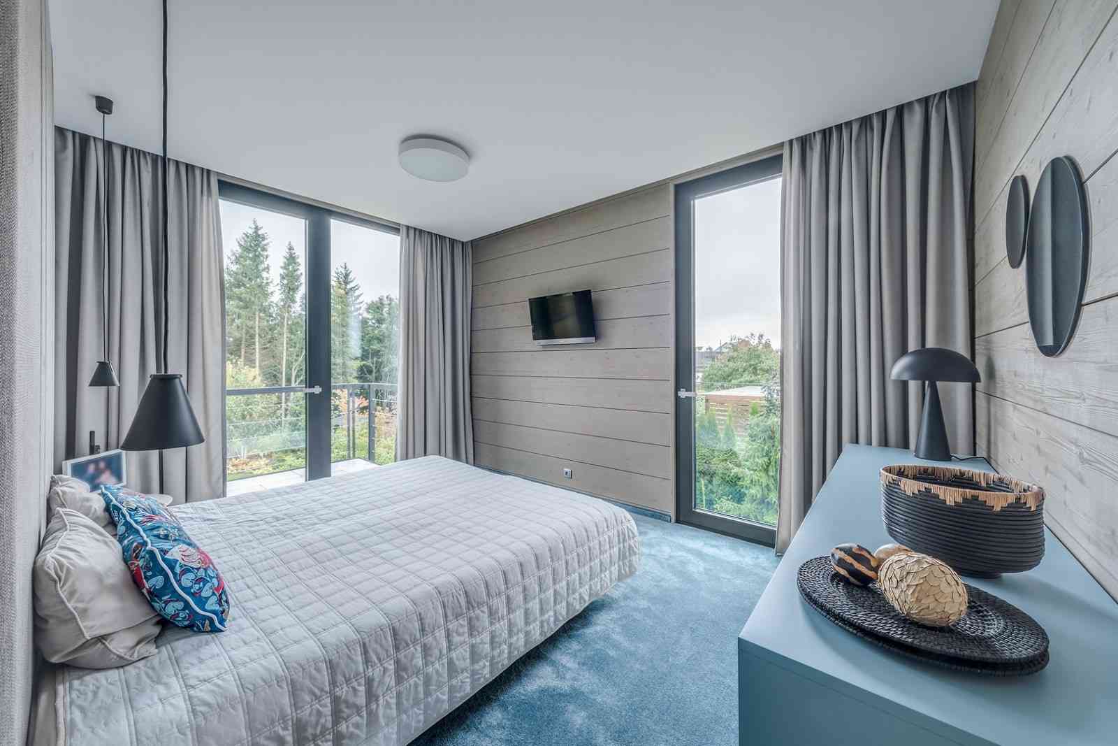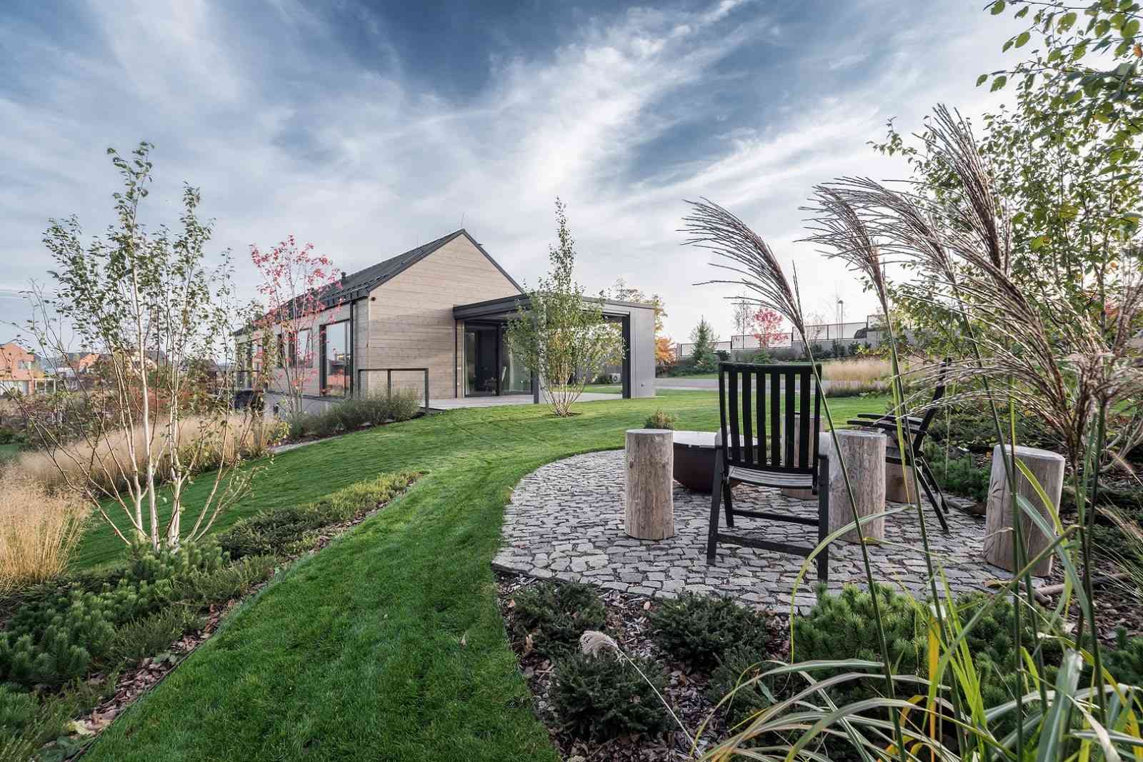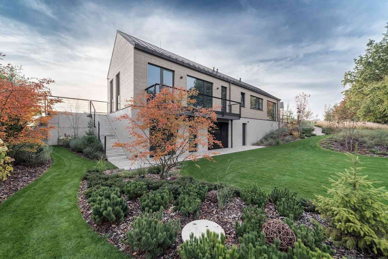 Ten wyjątkowy dom rodzinny położony jest w najwyższej części malowniczej miejscowości Červený Kopec w Trutnovie. Budynek składa się z dwóch części tworzących kształt litery L, co pozwoliło na funkcjonalne oddzielenie stref domu. Projekt obejmuje jedną kondygnację naziemną i jedną podziemną, a jego dwuspadowy dach został zaprojektowany równolegle do drogi. Część podziemna, wykonana z betonu i starannie otynkowana, wtopiona jest w teren, natomiast część nadziemna to dom z litego drewna, który zachwyca naturalnym ciepłem i ponadczasową estetyką. Do drewnianej bryły przylega hala magazynowa z płaskim dachem pokryta panelami elewacyjnymi w kolorze antracytu, co dodaje całości nowoczesnego charakteru.