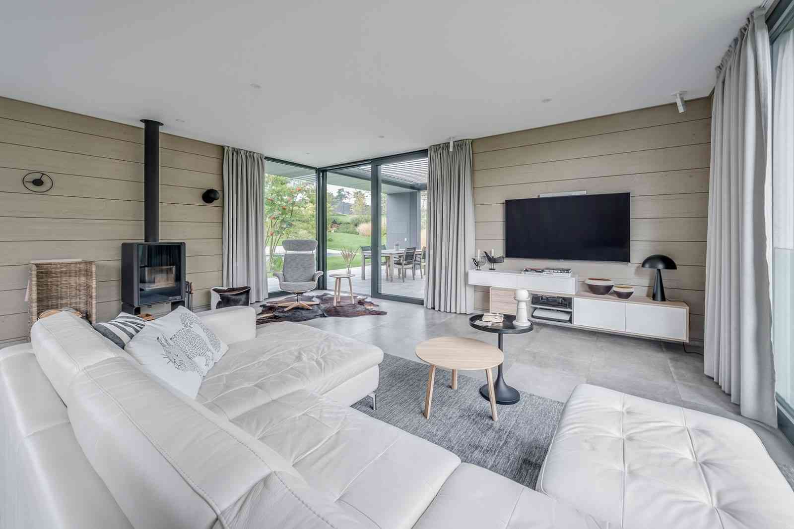 Niewątpliwym atutem projektu jest przestronny taras z pergolą, który stanowi przedłużenie salonu. To rozwiązanie nie tylko powiększa część dzienną, ale też tworzy idealne miejsce do relaksu i spotkań z rodziną na świeżym powietrzu. Pergola została perfekcyjnie dopasowana pod względem materiałowym i kolorystycznym, dzięki czemu harmonijnie łączy się z drewnianą bryłą domu. Całość tworzy wyjątkową przestrzeń, w której nowoczesna architektura, funkcjonalność i natura przenikają się w idealnych proporcjach.