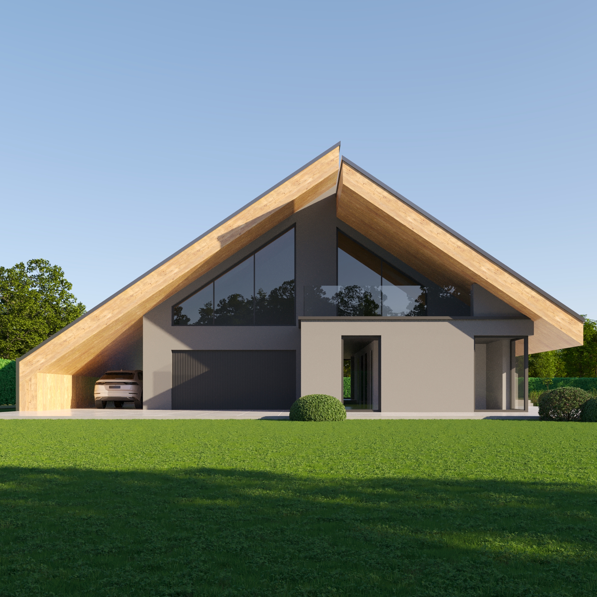 Mimo, iż jest to dom z dachem spadzistym i dom kryty dachem dwuspadowym o symetrycznych połaciach to stworzyliśmy obiekt niepowtarzalny i nietuzinkowy. Poziomy, dwustanowiskowy garaż ukryty w bryle, dodatkowa wiata na dwa samochody i drewno, wygodna strefa wejściowa, jednobiegowa klatka na ścianie pokoju dziennego, pustka i antresola to tylko niektóre zalety tego ciekawego obiektu. Na uwagę zasługuje wiszący taras od strony dziennej, jak również okna na dwie kondygnacje z widokiem na las. A sufit katedralny nad pokojem dziennym i jadalnią tworzy z części tylnej obiektu bardzo interesującą przestrzeń mieszkalną.