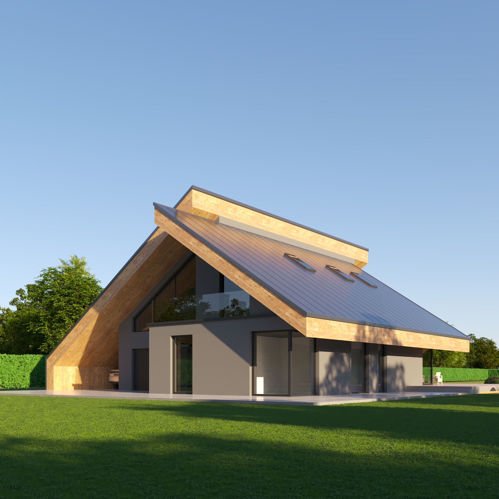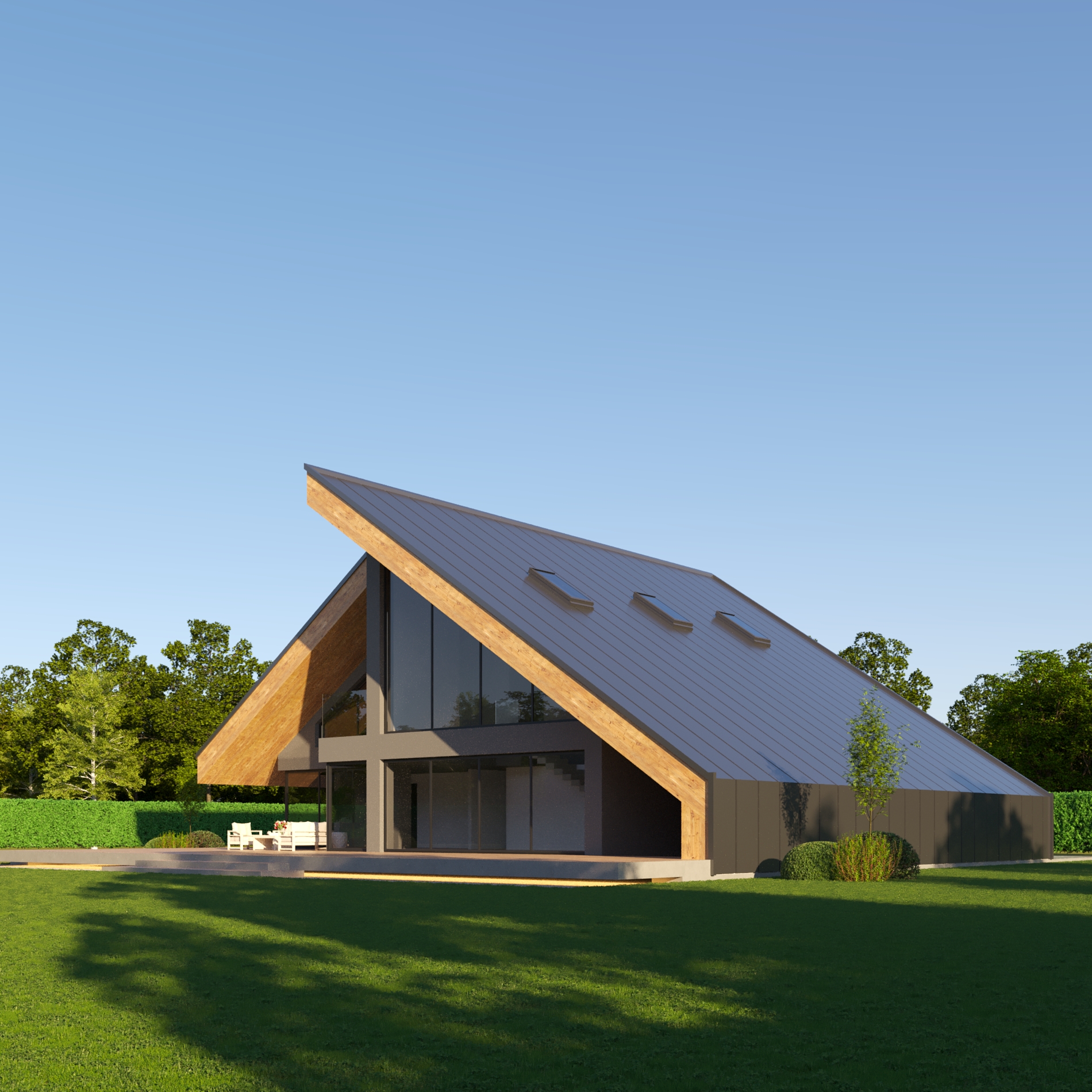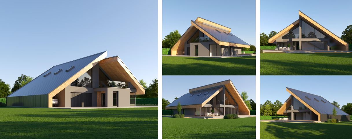 Nie jest to typowa nowoczesna stodoła z dachami symetrycznymi dwuspadowymi. Kalenica została rozcięta, jednak w rzucie połacie są równe. Kąty poszczególnych połaci również są te same. Połacie mają nawet te same długości. Są one jednak przesunięte w pionie jak i w poziomie. Dodatkowo jedna połać jest nieco dłuższa, ale o zadaszenie wiaty, która to łamie symetrię dachu, jednak nie symetrię domu, gdyż obie jego trakty są równe. Zatem dochowaliśmy zapisów MPZP tworząc jednak coś nietypowego i wyjątkowego. Zachowując również minimalny spadek dachu i maksymalną wysokość udało się zoptymalizować poddasze, tworząc przyjemne, klimatyczne pomieszczenia o dużych wysokościach i znacznych powierzchniach podłóg. Jednakże obrys poddasza jest dużo mniejszy niż przyziemia, gdyż dodatkowo jest pomniejszony przez pustkę i tarasy nad pomieszczeniami na przyziemiu.