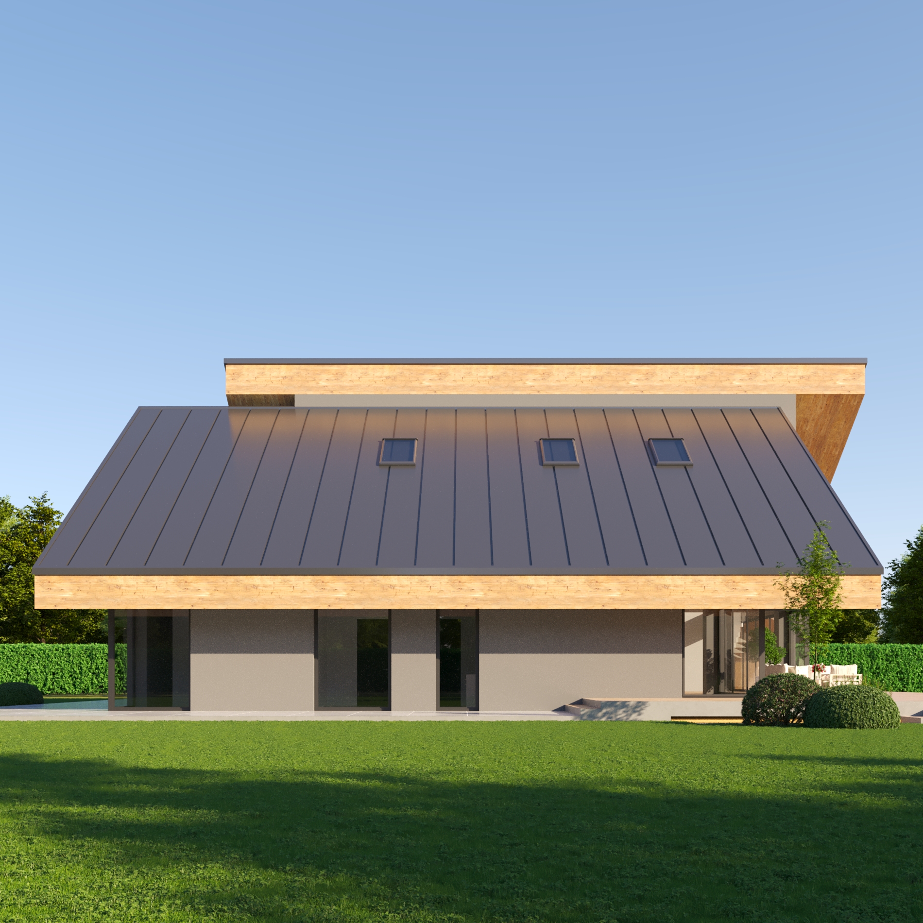 Zaprojektowany obiekt zaprezentowano w ciemnej kolorystyce. Ciemnoszare połacie tynku komponują się z blachą płaską na rąbek w kolorze grafitowym. Rozjaśnienia dodają linie kompozycyjne w postaci wystających okapów obłożonych jasnym, sosnowym, lakierowanym drewnem. Okapy specjalnie pogrubione dodają obiektowi ciekawego charakteru i tworzą oryginalną grafikę poszczególnych elewacji. A pewne cofnięcia poszczególnych ścian i brył w danych traktach obiektu powodują, że jest to dom o dynamicznej formie i bryle. Dom mimo prostego układu funkcjonalnego, prezentuje się jako nietypowy i niepowtarzalny.