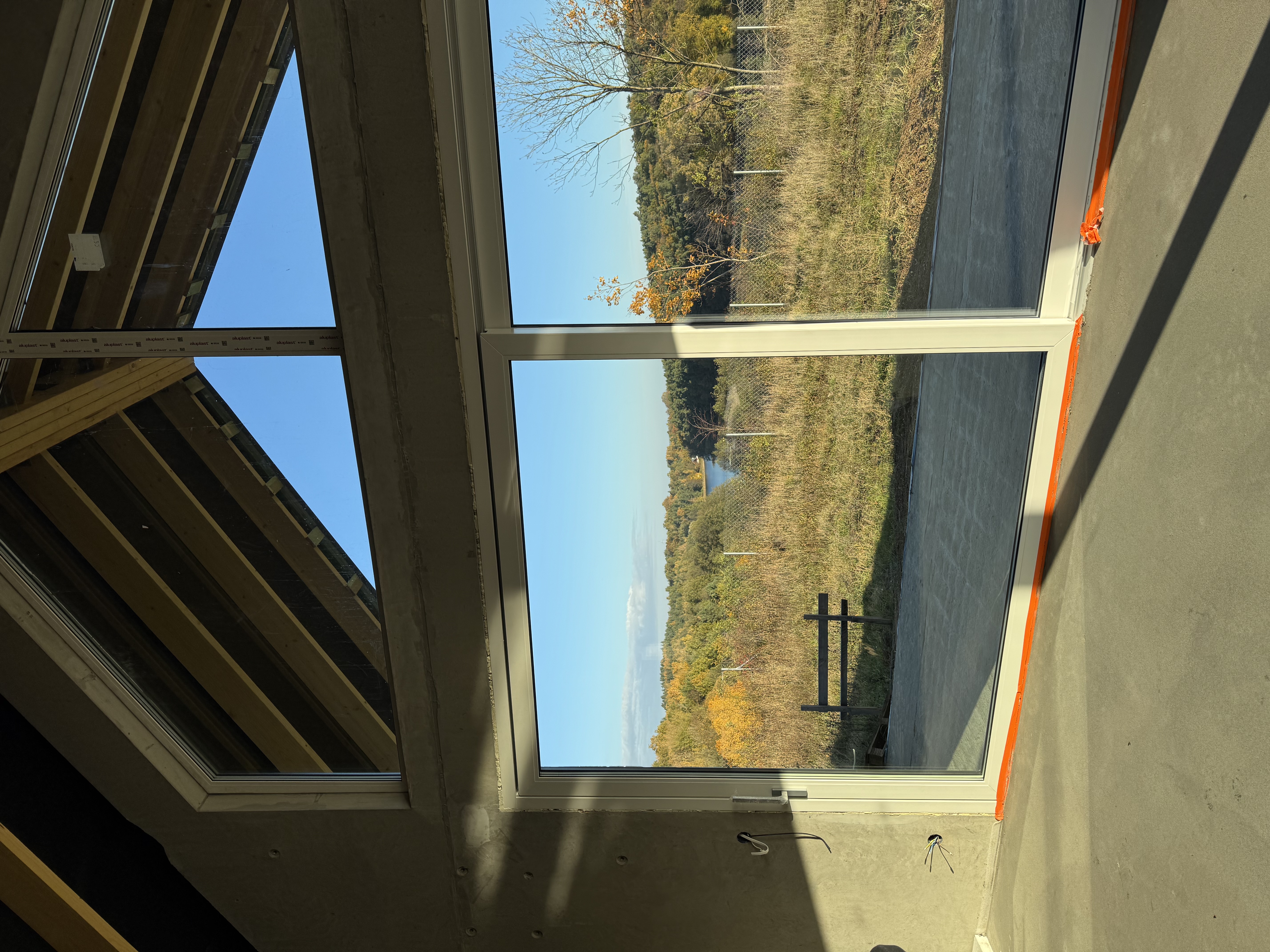 Szczególną uwagę zwracają ściany trójwarstwowe z betonową elewacją, które stanowią jeden z najbardziej charakterystycznych elementów projektu. Surowy beton doskonale komponuje się z zielenią otoczenia, tworząc spójny i ponadczasowy efekt. Elewacja nie tylko podkreśla nowoczesny charakter budynku, ale również zapewnia długowieczność i stabilność konstrukcji.