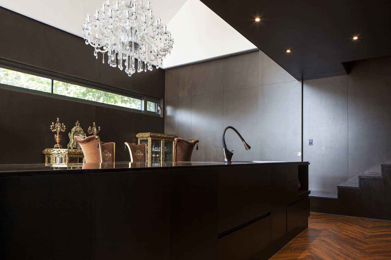 Pierwszy dom charakteryzuje się minimalistycznym stylem i nowoczesną prostotą – wysokie sufity, duże okna i otwarta przestrzeń dzienna tworzą wrażenie lekkości i przestronności. Widok na drugi dom oraz zadbany trawnik staje się częścią doświadczenia wizualnego, jakby wnętrze domu było galerią sztuki. Drugi budynek, dedykowany rodzicom, łączy klasykę i elegancję z funkcjonalnością, zachowując monumentalny charakter dzięki wysokim, 6-metrowym sufitom, ciemnym wykończeniom i ostentacyjnym meblom. Mostek łączący oba domy zapewnia szybki i łatwy dostęp między budynkami, jednocześnie podkreślając prywatność i harmonijną organizację przestrzeni.