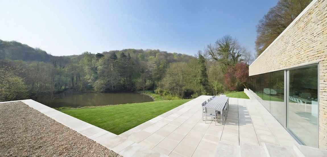 Rezydencję otacza niemal perfekcyjny, sielankowy krajobraz pełen falujących łąk, które zmieniają wygląd wraz z porami roku. W pobliżu domu znajduje się jezioro, otoczone wysokimi, bujnymi drzewami, dzięki czemu codzienny widok z okien przypomina malarski angielski pejzaż. To właśnie harmonijne połączenie architektury z naturą sprawia, że dom w Cotswolds stanowi przykład idealnego balansu między designem a krajobrazem.
