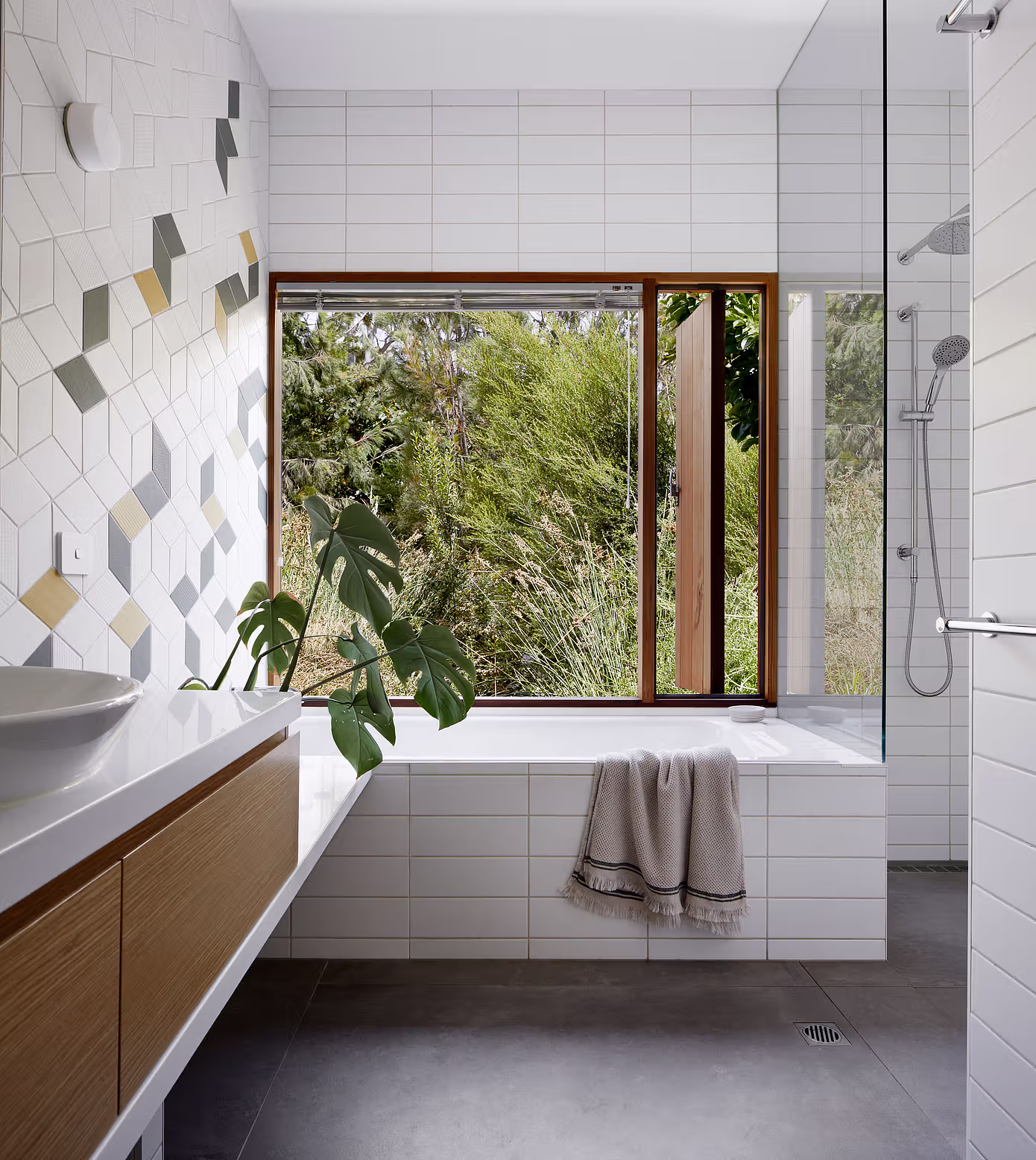Centralnym punktem domu jest łazienka z widokiem na ogród – przestrzeń relaksu i oddechu. Wolnostojąca wanna, subtelne kafle i drewniana toaletka budują atmosferę spokoju, a szerokie okno pozwala w pełni cieszyć się otaczającą zielenią.