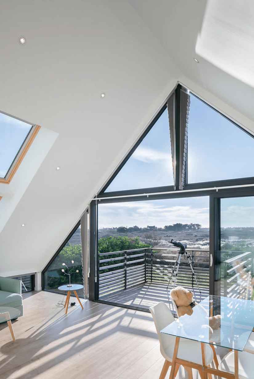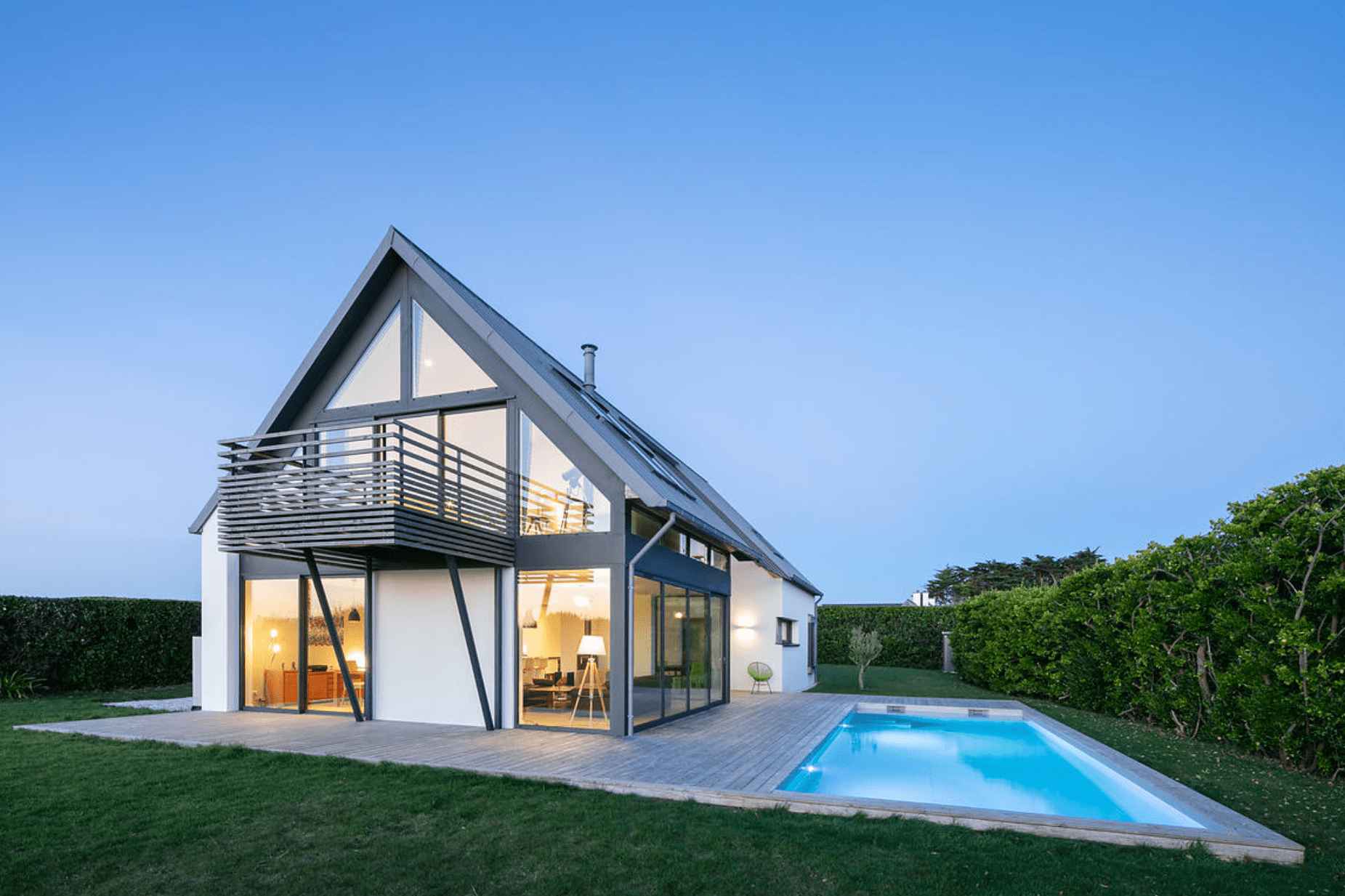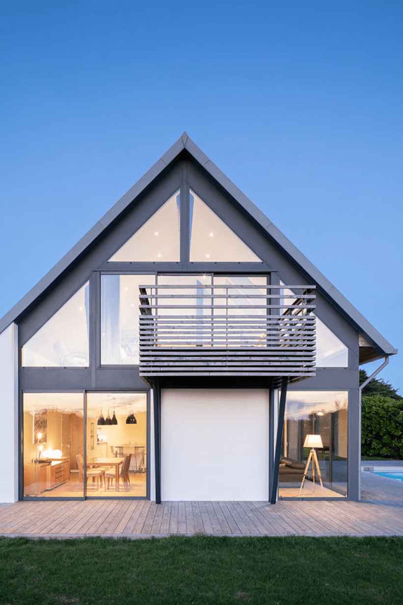 Projekt domu opiera się na prostej, eleganckiej bryle, która doskonale wpisuje się w tradycyjną zabudowę okolicy. Architektura łączy współczesne rozwiązania z klasycznymi formami, tworząc harmonijną całość. Budynek został podzielony na dwie strefy funkcjonalne – część „nocną” od północnego wschodu z tradycyjną elewacją oraz część „dzienną” otwartą na południowy zachód. Przeszklona fasada z przesuwanymi drewnianymi okiennicami umożliwia pełne doświetlenie wnętrz i zapewnia ochronę przed słońcem. Wnętrze otwiera się na przestronny taras i patio, wokół którego rozciąga się przeszklona bryła, nawiązująca formą do nowoczesnej stodoły. Elewacje wykonano z połączenia białego betonu, szkła i czerwonego drewna cedrowego, co nadaje budynkowi wyrazisty, a zarazem ciepły charakter.