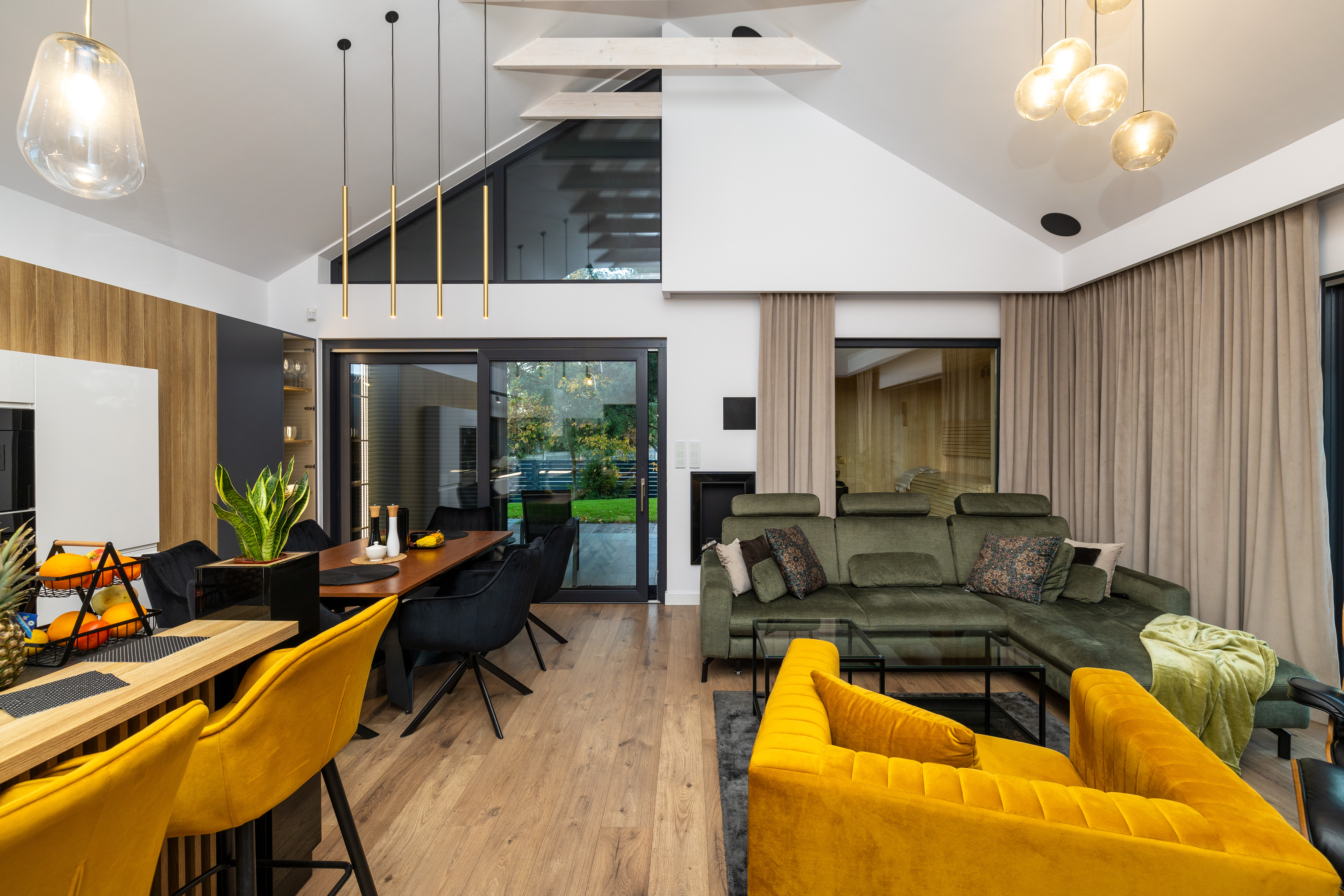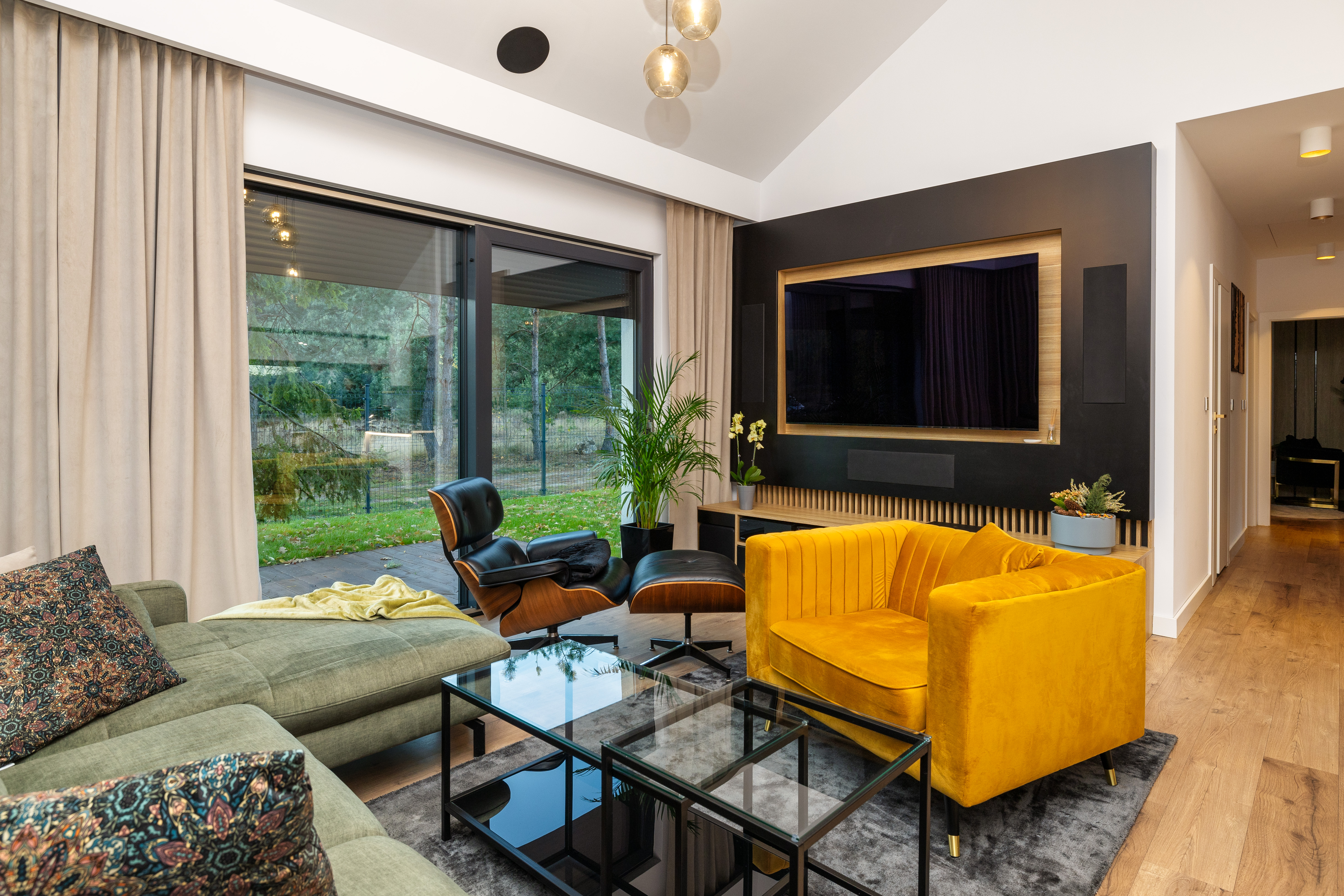 Nieodłącznym elementem projektu jest taras o powierzchni 50 m², który stanowi naturalne przedłużenie przestrzeni mieszkalnej. Dzięki bezpośredniemu połączeniu ze strefą SPA, tworzy atmosferę sprzyjającą relaksowi. Obecność dużych przeszkleń sprawia, że wnętrza wypełniają się naturalnym światłem, a kontakt z otaczającą przyrodą staje się integralną częścią codziennego życia.