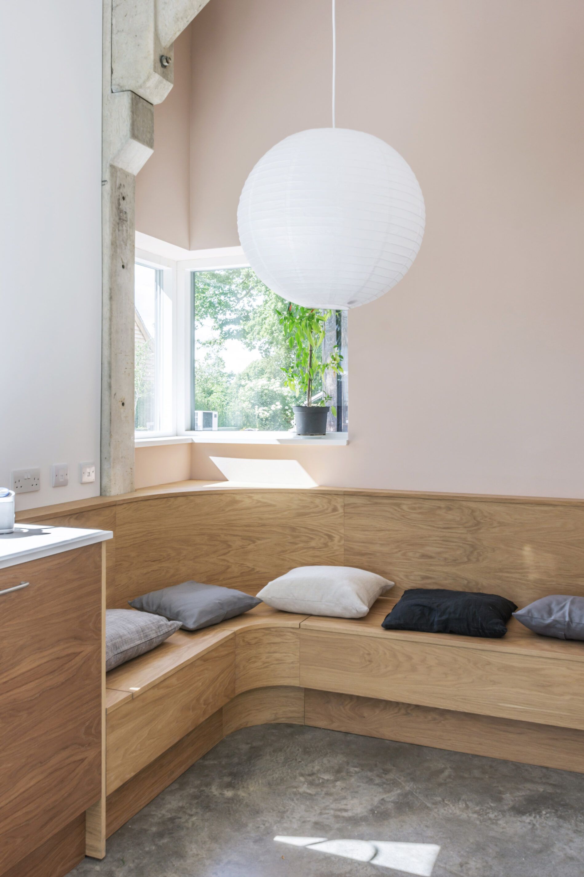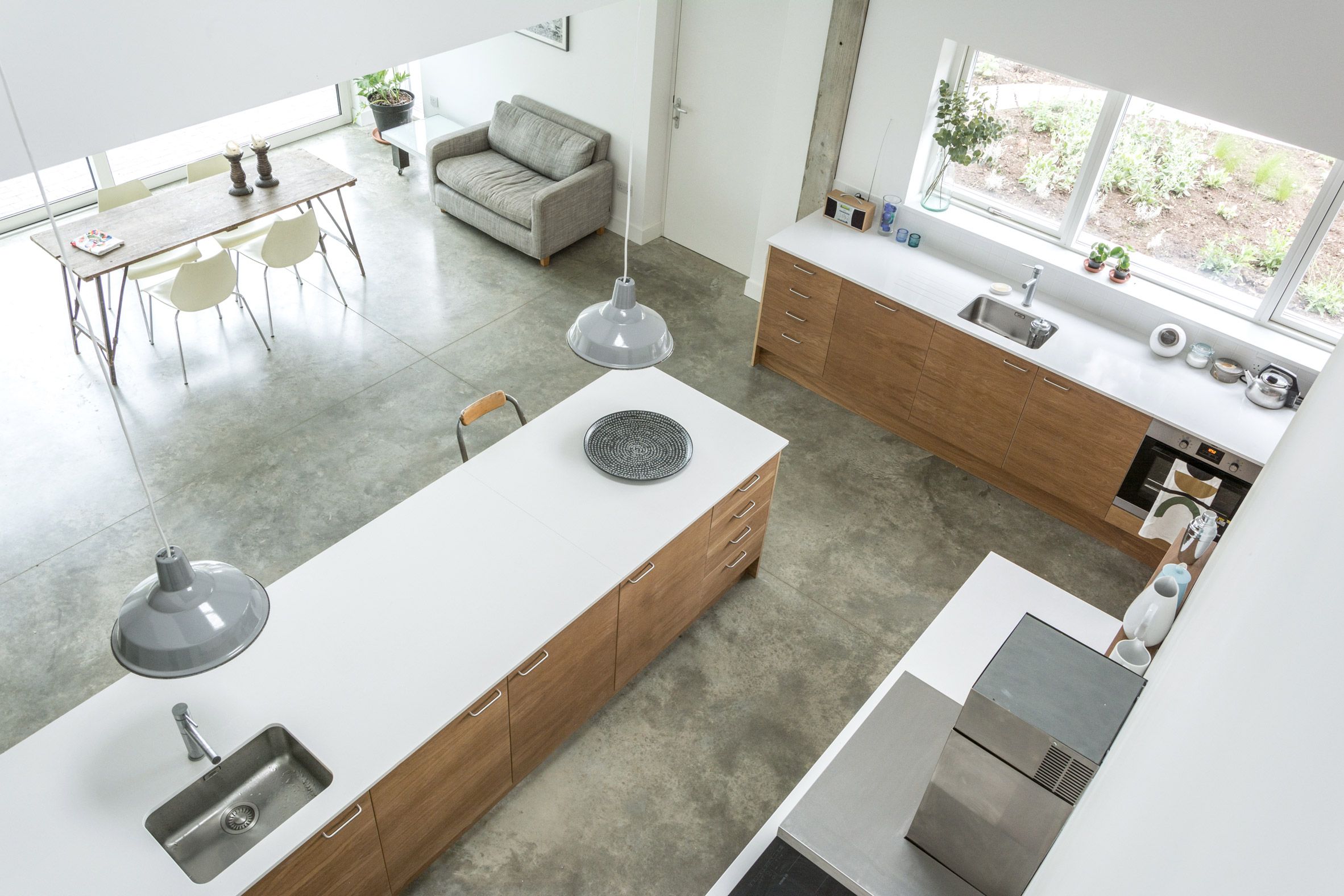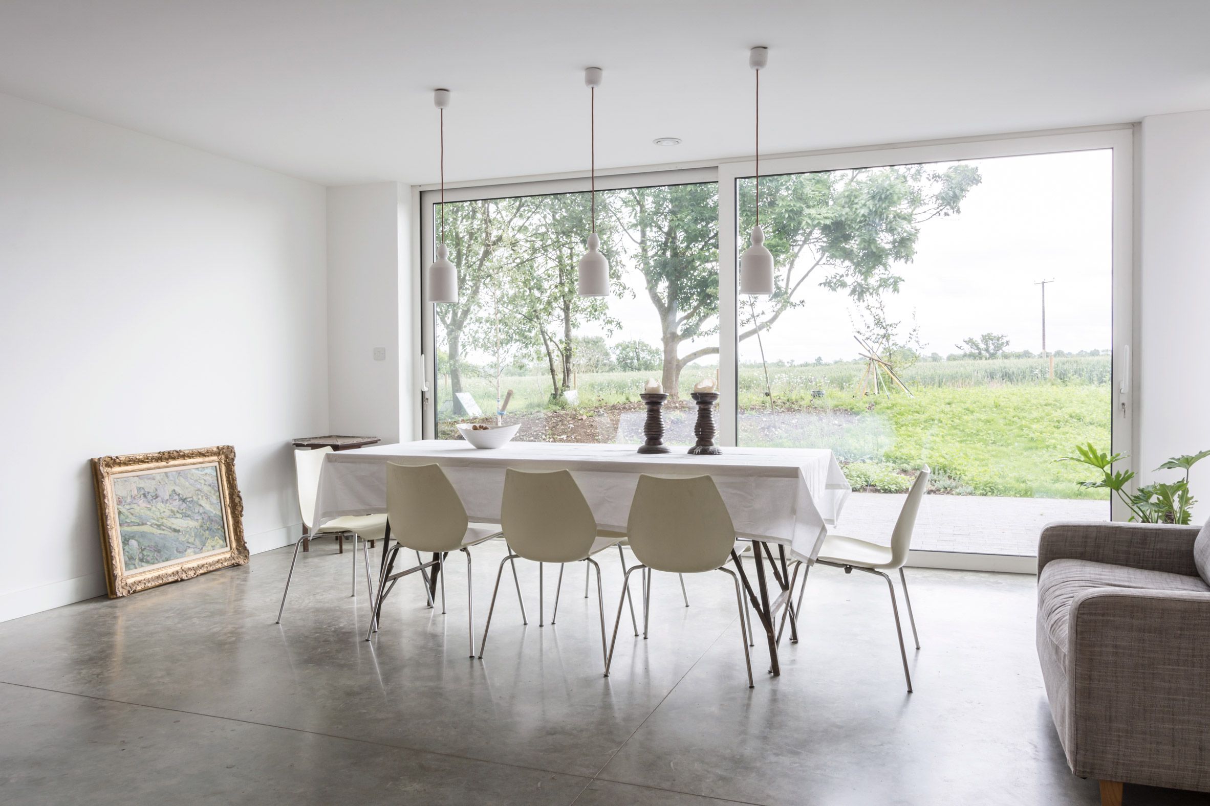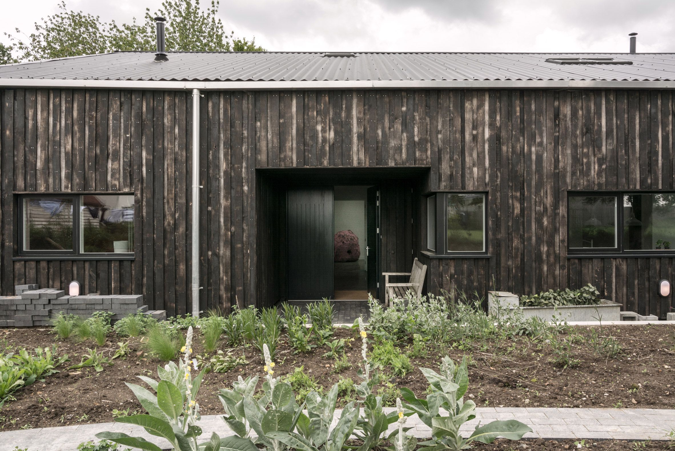 Architekci zachowali pierwotne rolnicze proporcje budynku, wykorzystując istniejącą betonową konstrukcję i eksponując dawne wsporniki stodoły jako element wystroju wnętrza. Na parterze zastosowano polerowany beton, a na obu kondygnacjach pojawiły się solidne dębowe deski podłogowe. Całość oparto na ograniczonej palecie naturalnych materiałów, podkreślających autentyczność i trwałość projektu. Prosta bryła została podzielona na dwa poziomy, przy czym wybrane pomieszczenia – salon i kuchnia – zachowały pełną wysokość, wzmacniając wrażenie przestronności.