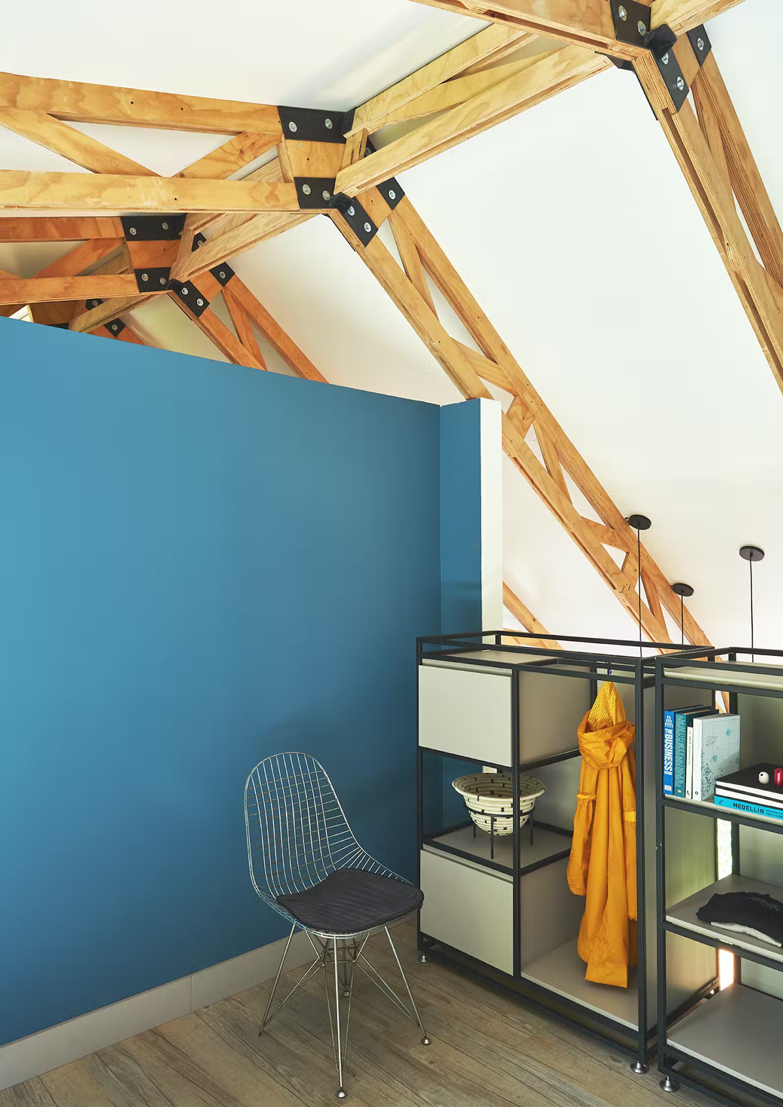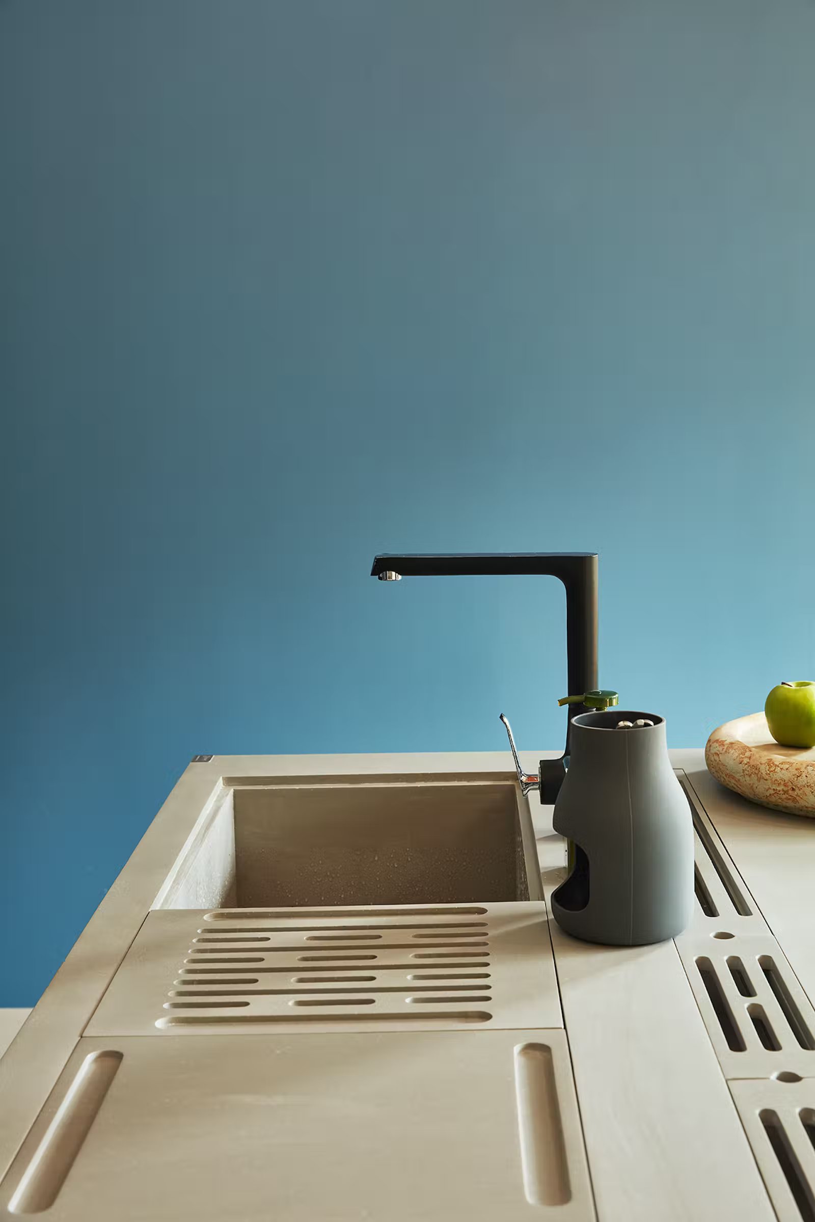 Wnętrza MH01 to przykład modułowości i funkcjonalności. Tu Taller Design przygotowało na zamówienie meble, wyspę kuchenną z Corianu oraz laserowo wycinane detale stolarskie. Taras z drewna mangium harmonijnie łączy dom z zielonym krajobrazem, a inteligentne rozwiązania, takie jak przesuwne elementy blatu kuchennego czy modułowe organizery pełniące rolę ścian działowych i szaf, pozwalają zachować przestrzeń otwartą i uporządkowaną.
