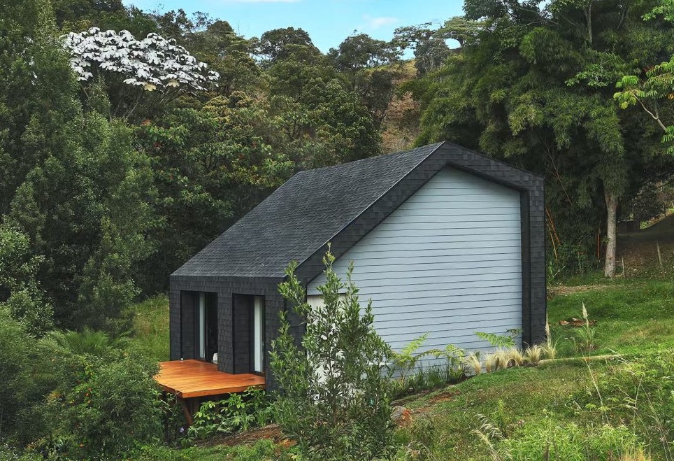 Eksperymentując z prefabrykowanymi elementami, projektant David Del Valle i architektka Amalia Ramírez stworzyli weekendowy dom MH01 na obrzeżach Medellín. Ta kolumbijska bryła o powierzchni 116 m² urzeka elewacją z czarnych gontów i płyt cementowych, które wtapiają budynek w tropikalne otoczenie. Inspiracją dla wykończeń były srebrzyste liście drzewa yarumo, symbolu Kolumbii. Projekt łączy tradycyjną konstrukcję z architekturą prefabrykowaną, wpisując się w trend prostych, funkcjonalnych i ekologicznych domów, podobnie jak europejska nowoczesna stodoła.