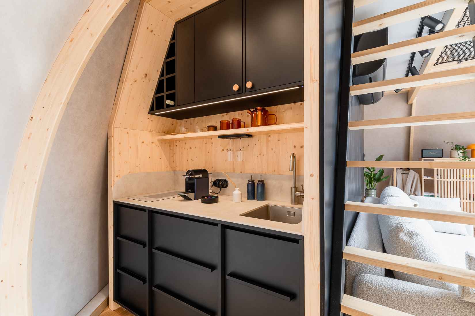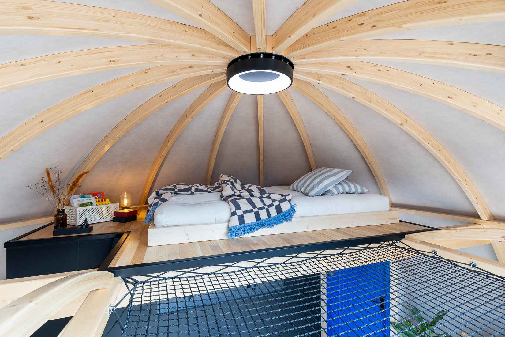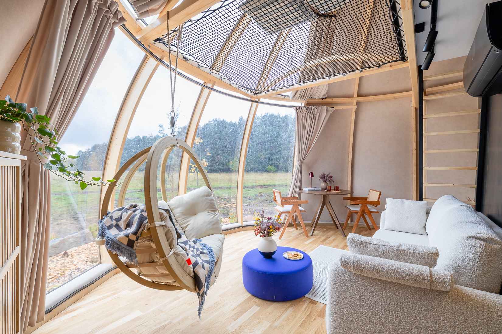 Każda z kopuł - Obserwatorium LAS i Obserwatorium RZEKA ma powierzchnię 27 m2 i mieści do czterech osób. Wnętrze zaprojektowane jest tak, że tworzy w pełni funkcjonalną przestrzeń. Strefa dzienna to wygodna sofa (z funkcją spania) na wprost panoramicznego okna, duży bujany fotel o unikalnej konstrukcji zapewniającej niezwykłą wygodę, projektor, gry i książki o architekturze i designie, dobrze wyposażony aneks kuchenny z lodówką, płytą indukcyjną i ekspresem do kawy oraz przytulna łazienka z prysznicem. Na antresoli znajduje się intymna przestrzeń - miejsce, które ma zapewnić idealny sen, dlatego goście będą mogli wyspać się tutaj na zdrowym, japońskim materacu typu futon otulając się najwyższej jakości tkaninami od polskiej marki HopDesign.
