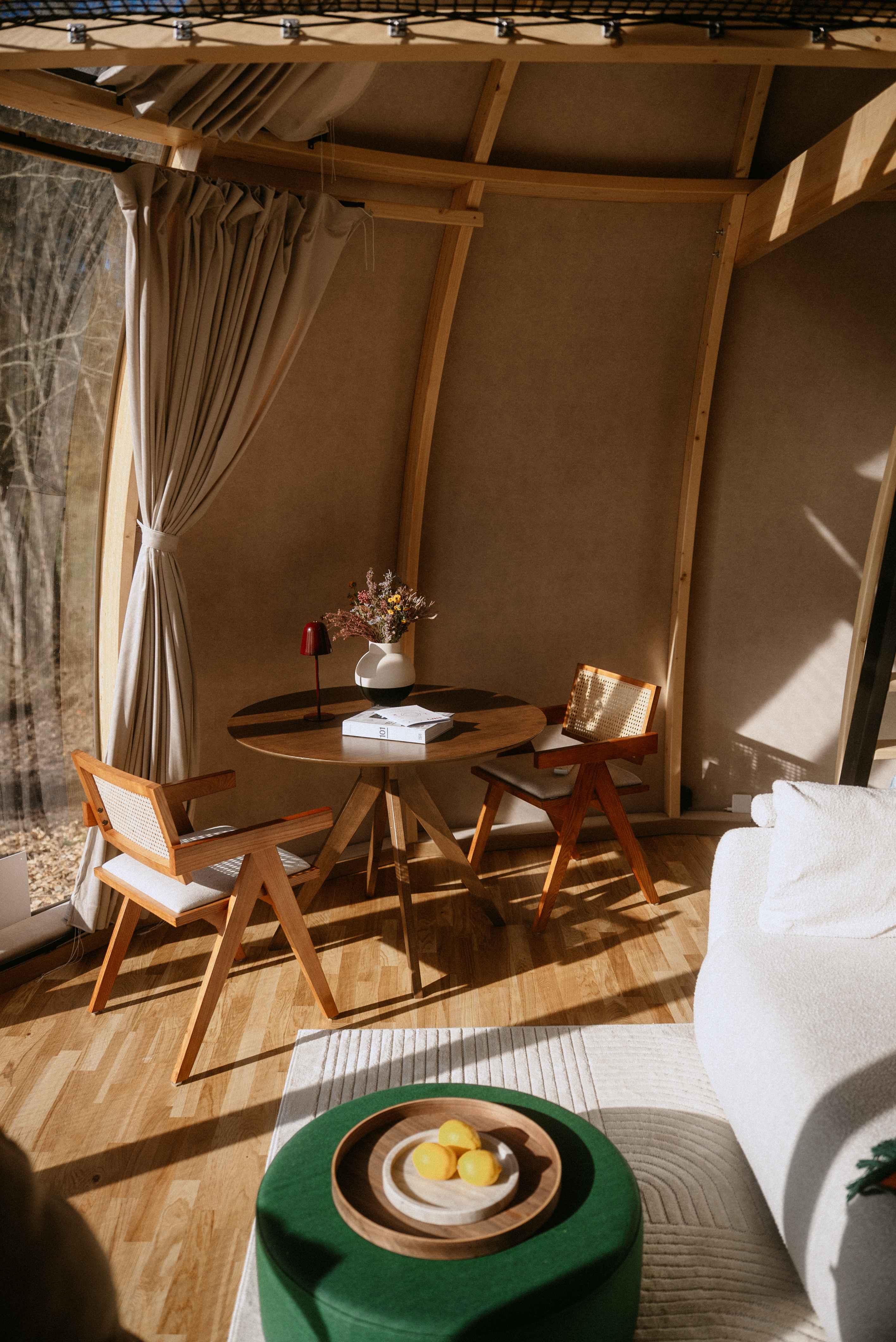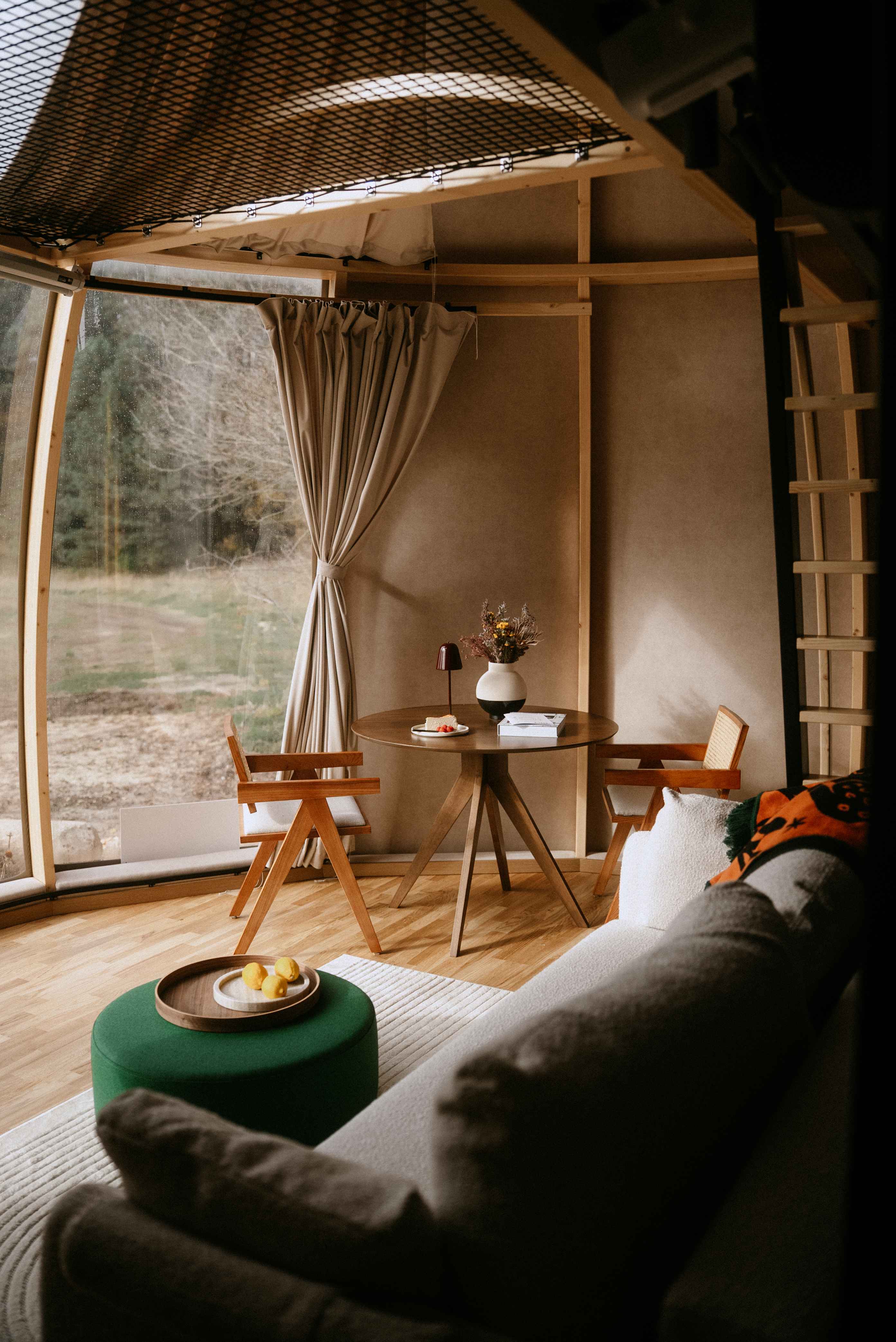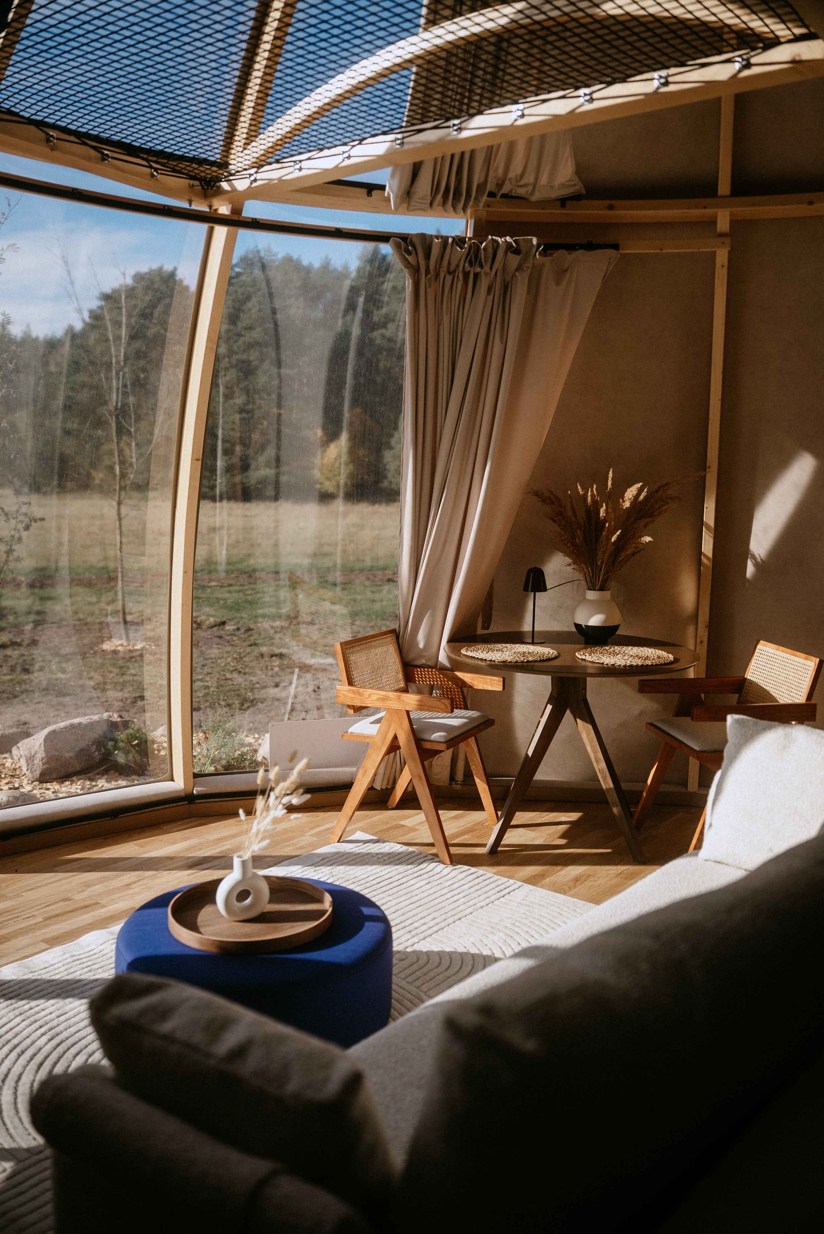 Wnętrza namiotów kontynuują estetykę znaną z Leśnej Chaty, czyli pierwszego domu w obiekcie „Patoki. Dom i las.” – to połączenie skandynawskiego minimalizmu i naturalnych materiałów. Przytulną atmosferę tworzą drewno, rattan, miękkie tkaniny i ciepłe oświetlenie wprowadzając spokój i harmonijnie współgrając z łąkowym i leśnym otoczeniem. Każdy detal został zaprojektowany z myślą o funkcjonalności i estetyce. Panoramiczne okna (ponad 16m2) pozwalają gościom obserwować zmieniające się światło i rytm przyrody. System rekuperacji, klimatyzacji z funkcją grzania oraz ogrzewanie podłogowe infrared tworzą warunki, które łączą luksus hotelowy z doświadczeniem przebywania w blisko natury.