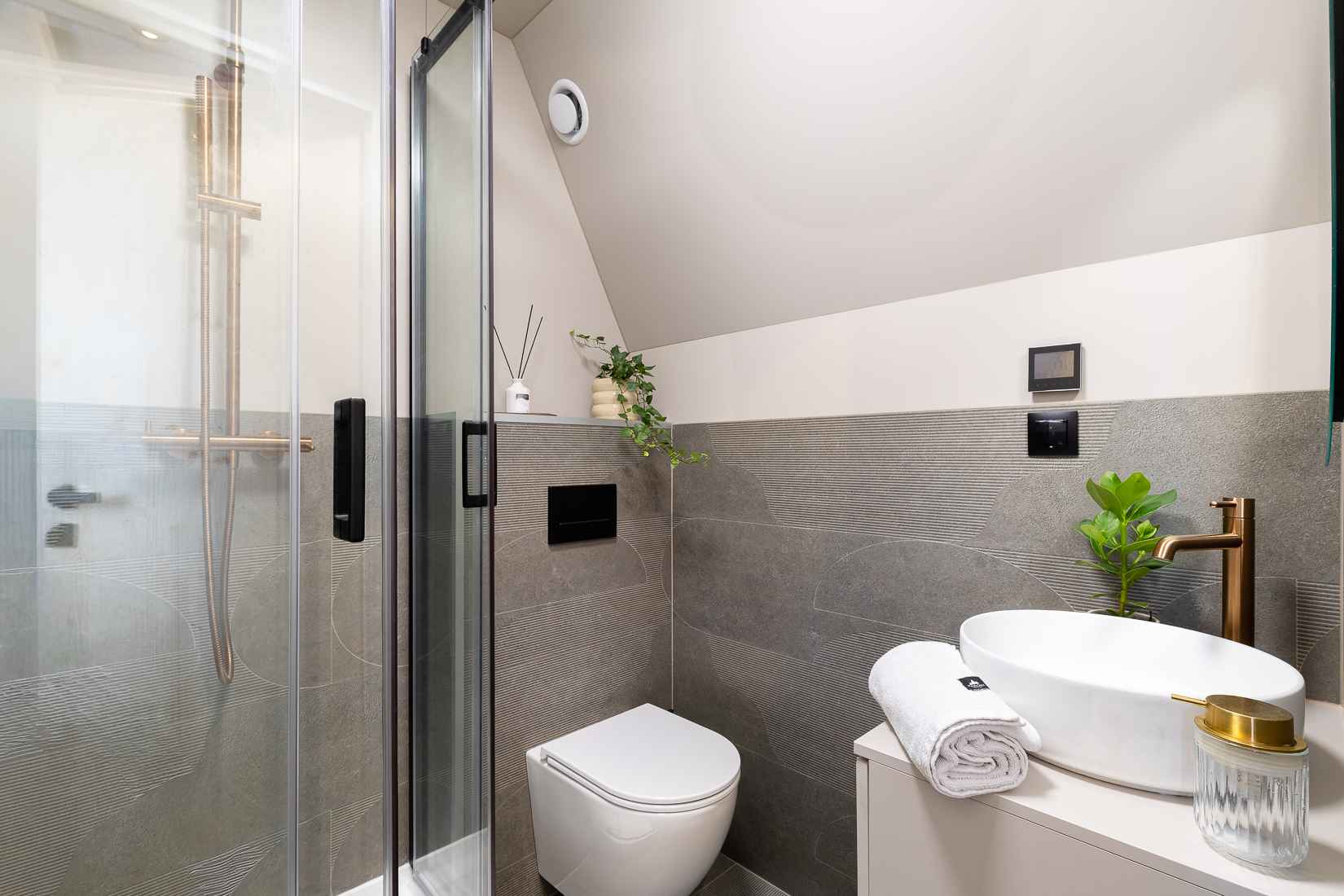 minimalizując przy tym straty energii. Z kolei nowoczesny klimatyzator pracuje cicho i wydajnie, zapewniając przyjemne ciepło zimą i orzeźwiający chłód latem. Uzupełnieniem całości jest ogrzewanie podłogowe infrared które wprowadza wyjątkowy komfort – ciepło odczuwalne w stopach sprawia, że przebywanie w domku jest przyjemnością nawet podczas najchłodniejszych dni.