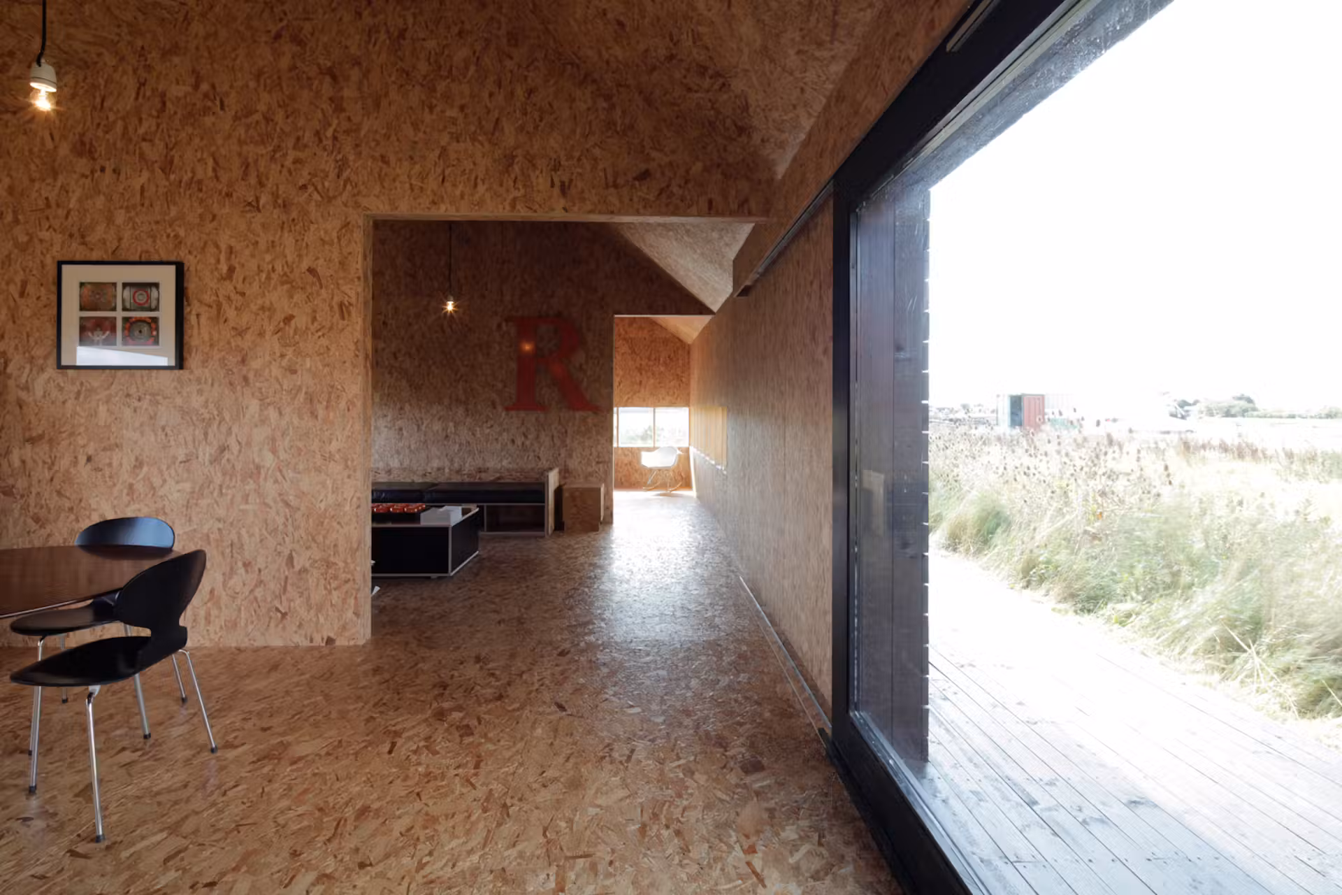 Turner, znany ze swojej pracowni Carl Turner Architects, zdecydował się na użycie OSB jako głównego materiału wnętrzarskiego. Ta pozornie surowa płyta stała się kluczowym elementem projektu, tworząc przegrody, meble, a nawet centralny moduł łazienki i biura. Wnętrze odzwierciedla minimalistyczny styl inspirowany pracami Donalda Judda i Richarda Serry, jednocześnie wpisując się w historię i kontekst architektoniczny regionu.