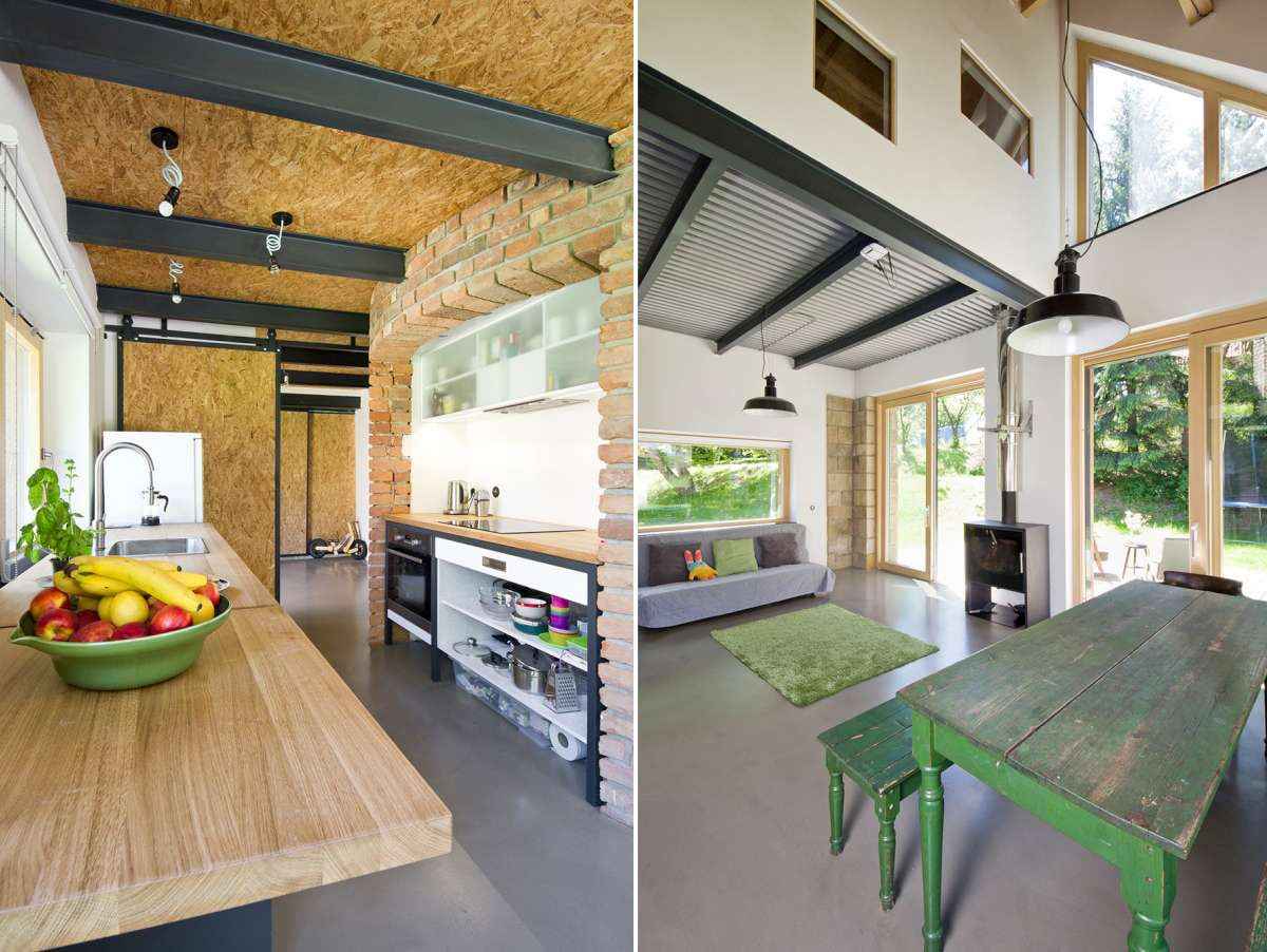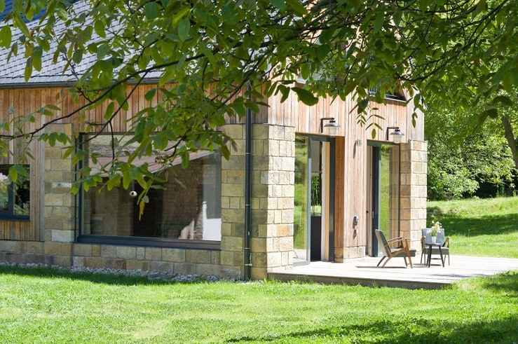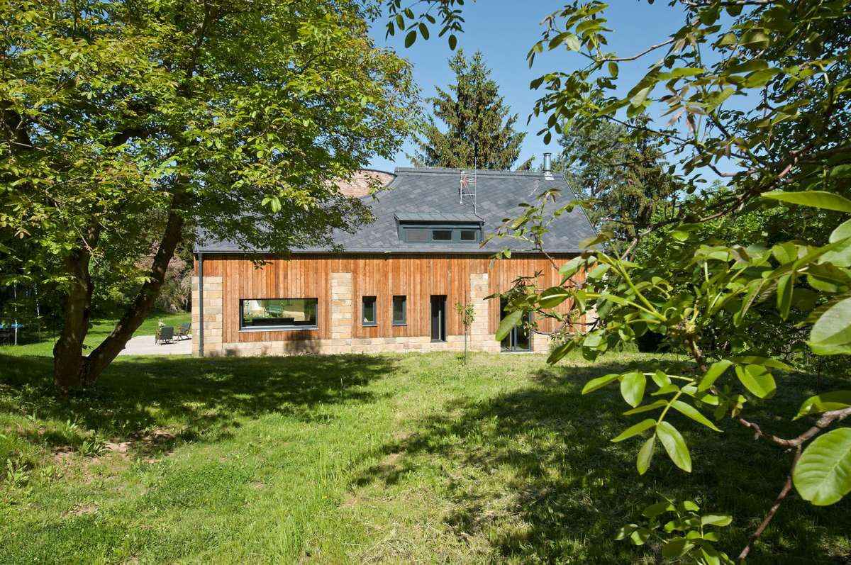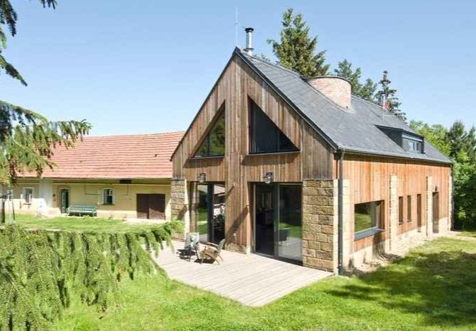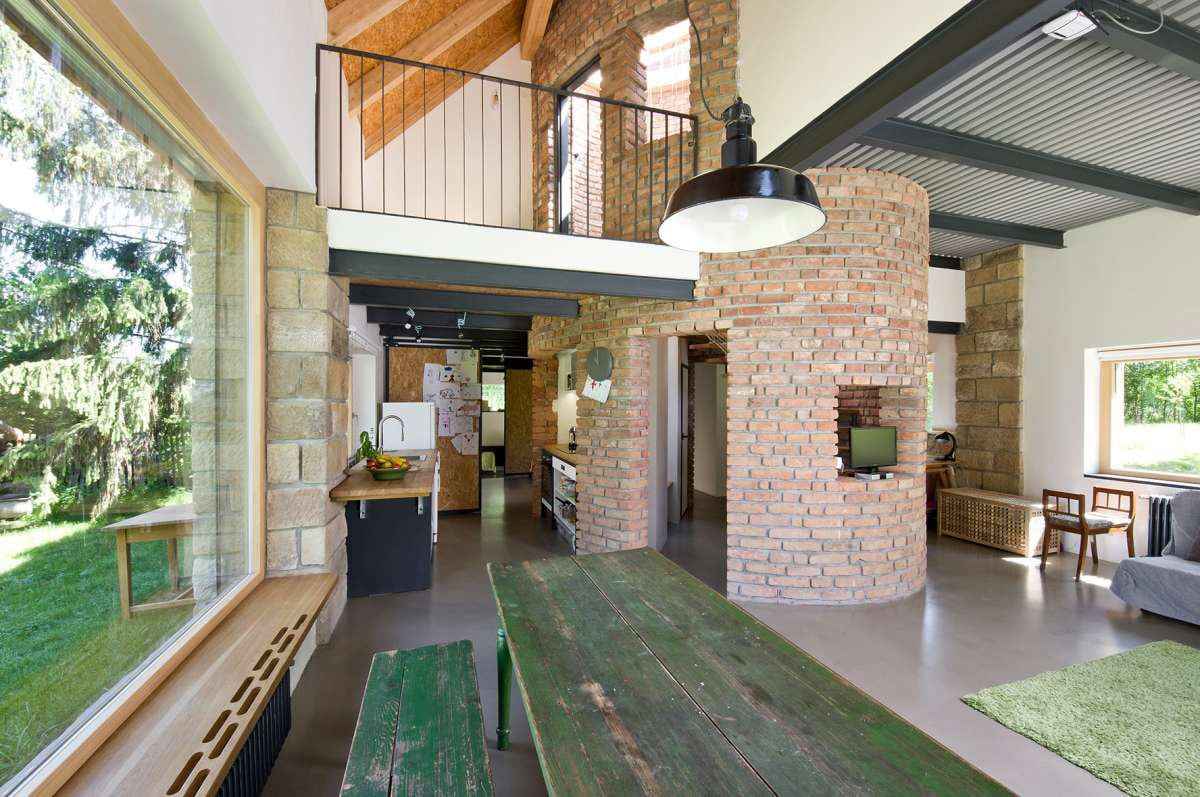 Architekci nie ograniczyli się do renowacji, lecz „reinkarnowali” budynek, tworząc nowoczesną stodołę inspirowaną pierwotnym kształtem i proporcjami. Zachowano oryginalny rzut i układ konstrukcyjny, a do budowy wykorzystano odzyskane materiały – kamień, drewno i cegłę. Nowy dom, tak jak dawniej, posiada podłużny trakt zorientowany północ–południe i prostokątny rzut przykryty dwuspadowym dachem. Konstrukcję tworzą kamienne filary z piaskowca wypełnione ociepleniem, między którymi ułożono cegłę. Na elewacji cegła przeplata się z drewnem, tworząc naturalną, ciepłą fakturę wpisującą się w wiejski krajobraz.