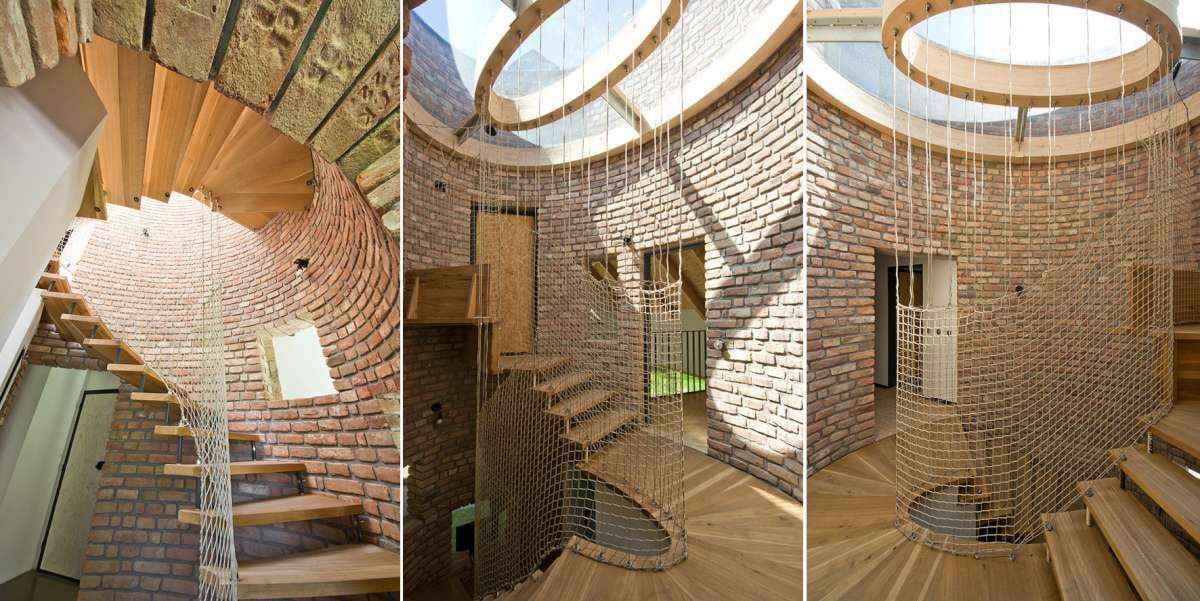 Wnętrze nowoczesnej stodoły zachwyca prostotą i spójnością materiałów. Parter mieści otwartą strefę dzienną z kuchnią, jadalnią i salonem, a także pracownię właściciela. Na piętrze ulokowano prywatne sypialnie. Centralnym elementem domu są eliptyczne schody ukryte w ceglanej „tubie”, prowadzące ku przeszklonemu świetlikowi. Połączenie naturalnego światła, cegły i drewna tworzy niepowtarzalny klimat, przywodzący na myśl wiktoriańskie oranżerie. Dzięki użyciu lokalnych materiałów i tradycyjnej formie bryły, budynek idealnie harmonizuje z otoczeniem, stając się przykładem, jak nowoczesna stodoła może łączyć historię, funkcjonalność i architektoniczną elegancję.
