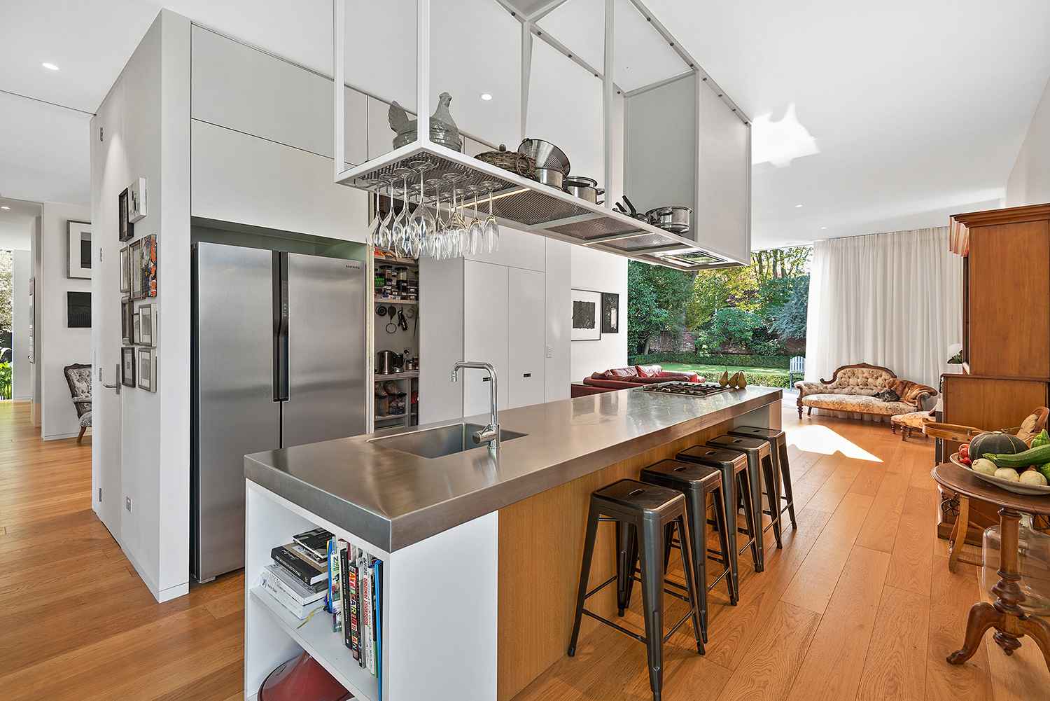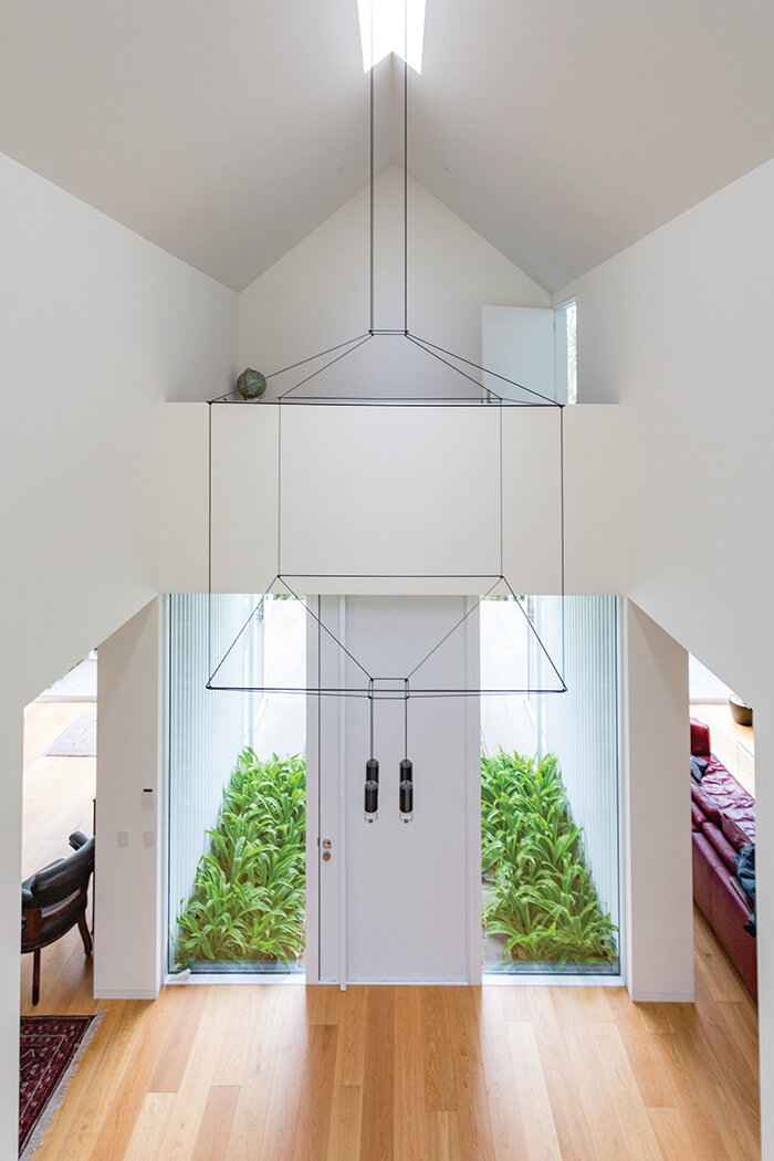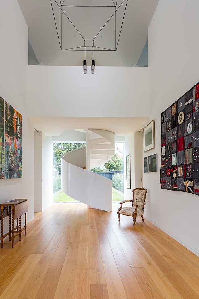 Nowy dom, choć zbudowany od podstaw, zachował układ przestrzenny starego budynku i jego relacje z otoczeniem. Architekci zastosowali duże przeszklenia od podłogi po sufit, które otwierają wnętrza na ogród – niegdyś integralną część rodzinnego życia. Dzięki temu nowoczesna stodoła w stylu Fendalton House zyskała niezwykłą lekkość i poczucie harmonii z naturą. Na parterze zlokalizowano salon i kuchnię w ich pierwotnych miejscach, jednak nadano im nowy charakter – bardziej otwarty i pełen światła. Dwa skrzydła domu łączy klatka schodowa ze spiralnymi schodami, a funkcjonalność budynku podnosi winda pasażerska.