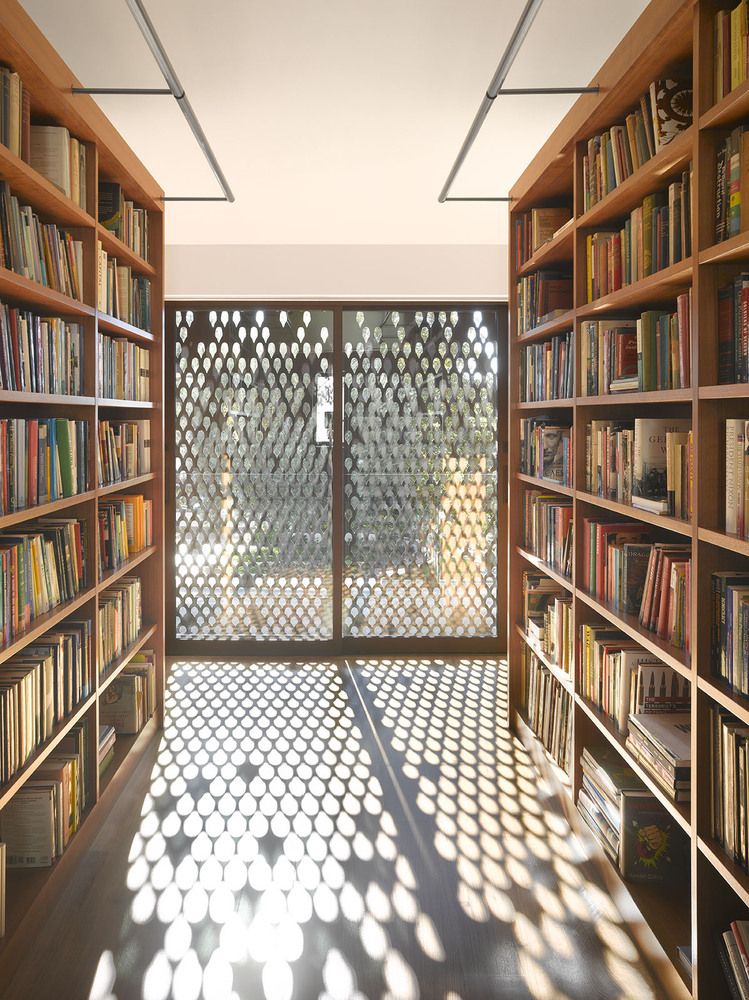 Nowo powstały dwupiętrowy pawilon pełni funkcję uzupełniającą wobec zabytkowego domu – na parterze mieści przestronny garaż, a na piętrze prywatną bibliotekę, miejsce do czytania, schowek oraz łazienkę. Najbardziej charakterystycznym elementem tej części inwestycji jest metalowa fasada z perforowanych paneli, wykonanych z anodowanego na brązowo aluminium. Ruchome elementy działają jak nowoczesne okiennice, umożliwiając pełne otwarcie widoku na ogród lub – po zamknięciu – ograniczenie dostępu światła, zwiększenie prywatności i ochronę wnętrz przed nadmiernym nagrzewaniem. Wzory wycięte w panelach nawiązują do historycznych kratek okiennych oryginalnego budynku, dzięki czemu nowoczesna forma harmonijnie wpisuje się w kontekst miejsca. To projekt, który pokazuje, że współczesna architektura – podobnie jak koncepcja nowoczesna stodoła – może szanować przeszłość, jednocześnie odpowiadając na dzisiejsze potrzeby użytkowników.