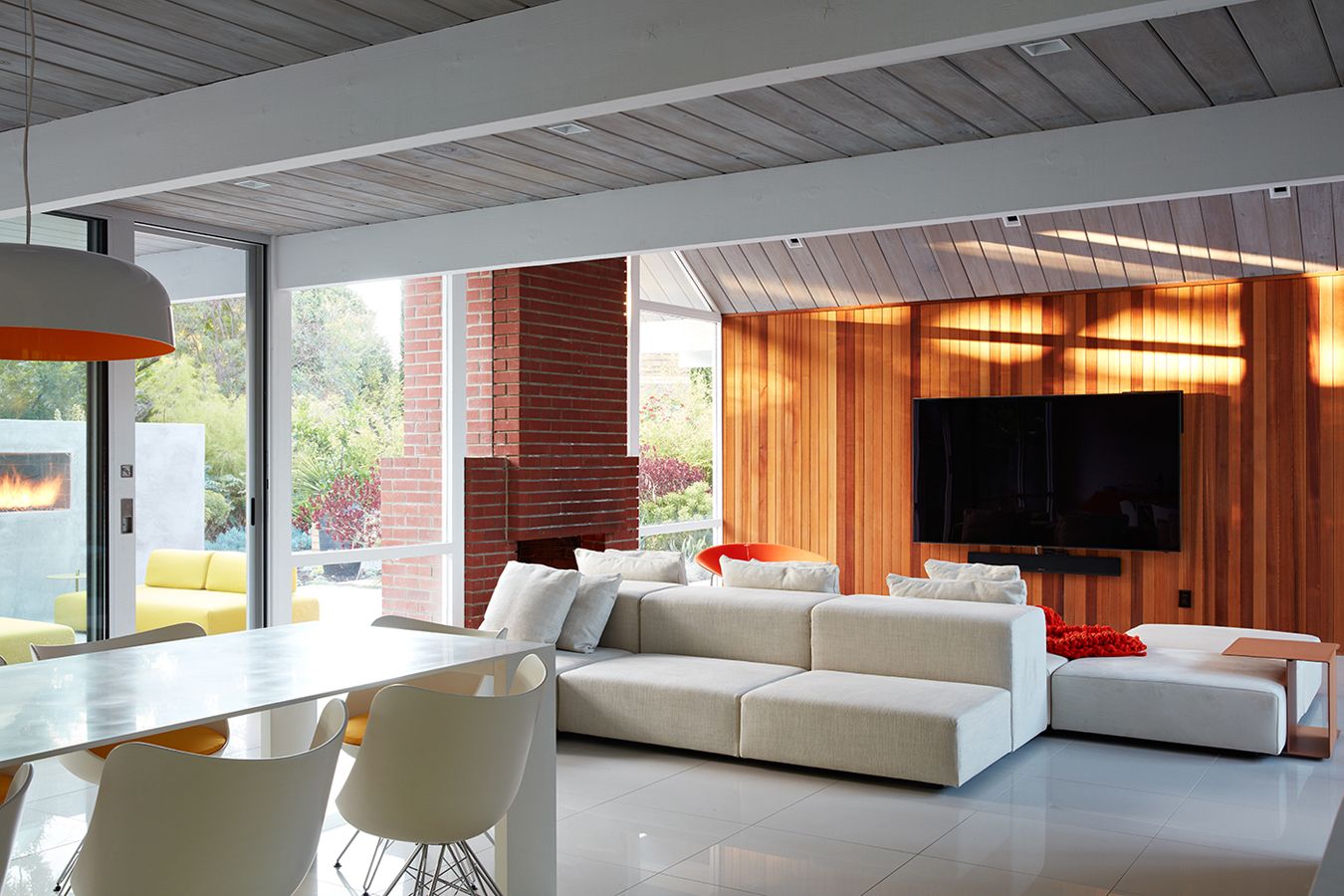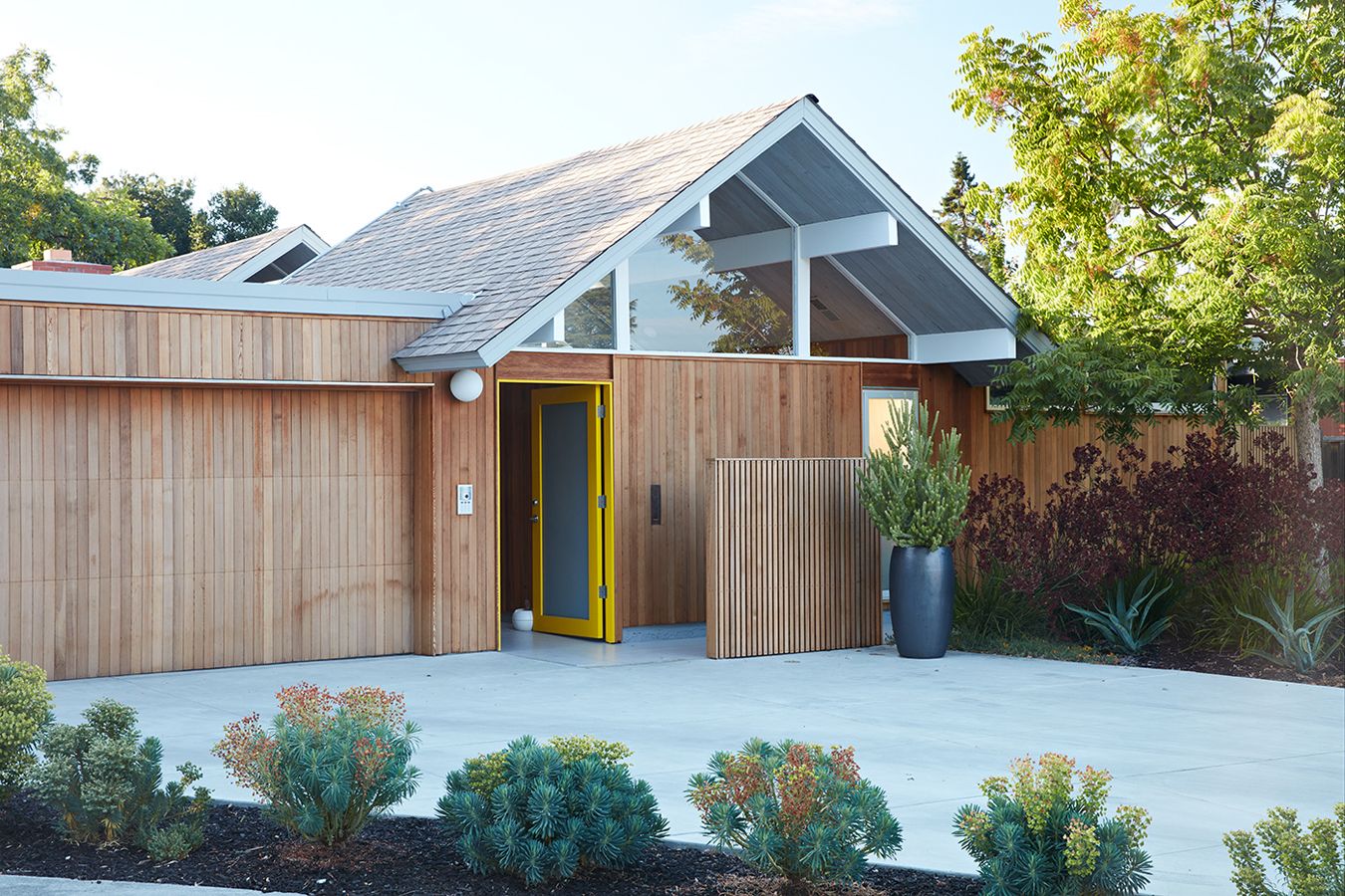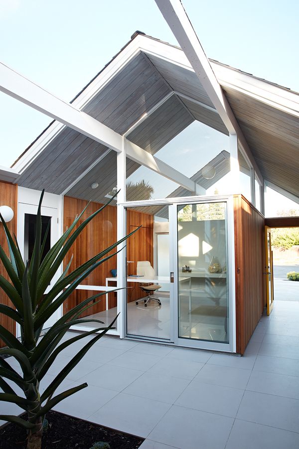 Renowacja jednego z klasycznych Domów Eichlera w Mountain View w Kalifornii została przeprowadzona przez Klopf Architecture we współpracy z Outer Space Landscape Architects, Sezen & Moon Structural Engineer oraz Flegels Construction. Projekt zakładał zachowanie oryginalnego, modernistycznego charakteru domu Eichlera, przy jednoczesnym dostosowaniu go do współczesnego stylu życia mieszkańców. Zastosowanie naturalnego, drewnianego sidingu stanowi nowoczesną interpretację jednej z najbardziej rozpoznawalnych cech tej typologii zabudowy. Układ przestrzenny oparto na idei płynnego przenikania wnętrza i zewnętrza, charakterystycznej dla architektury kalifornijskiego modernizmu. Minimalistyczna forma, horyzontalna bryła i naturalne materiały przywodzą na myśl estetykę, którą dziś często określa się jako dom inspirowany typologią, jaką reprezentuje nowoczesna stodoła, choć w miejskim, modernistycznym wydaniu.