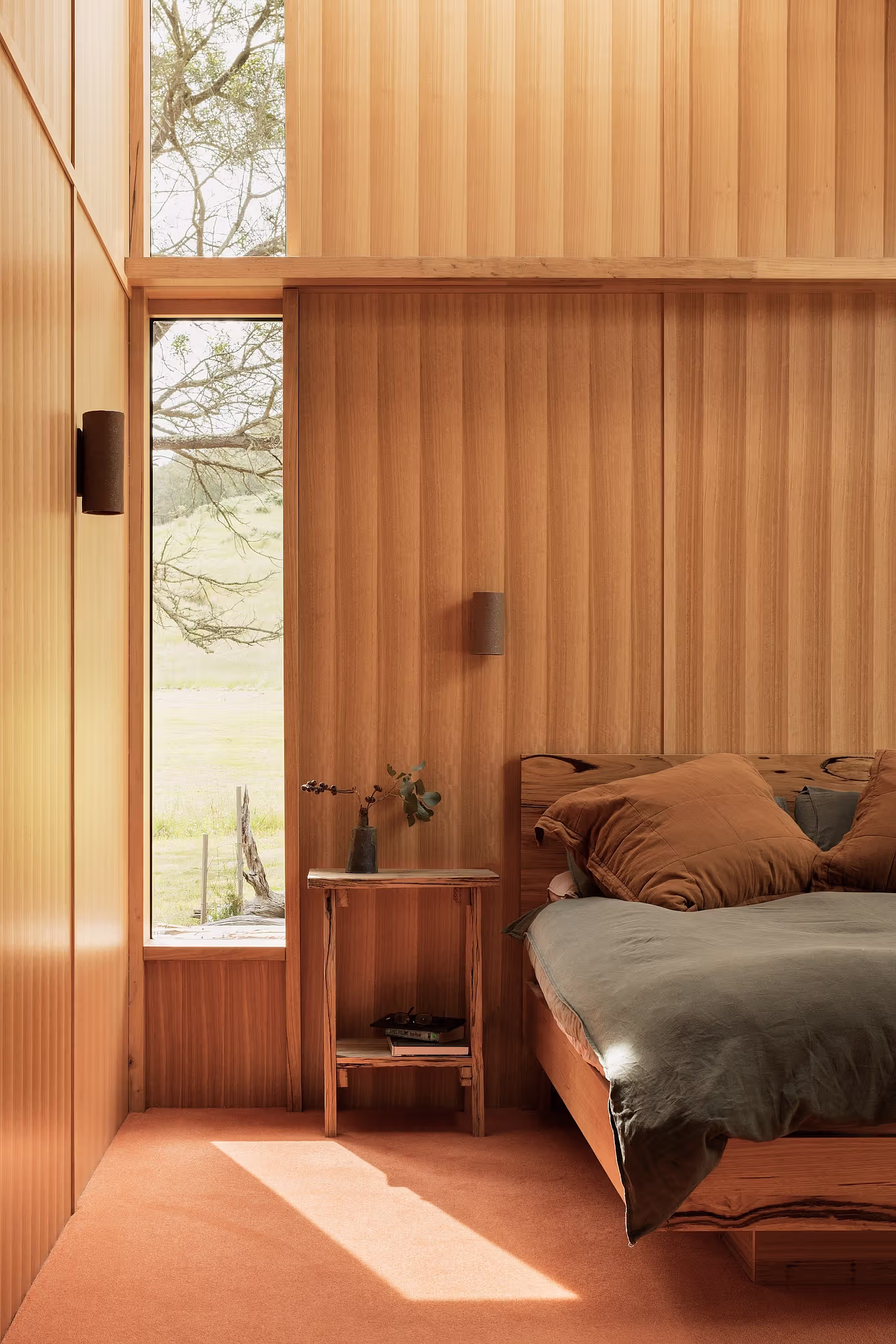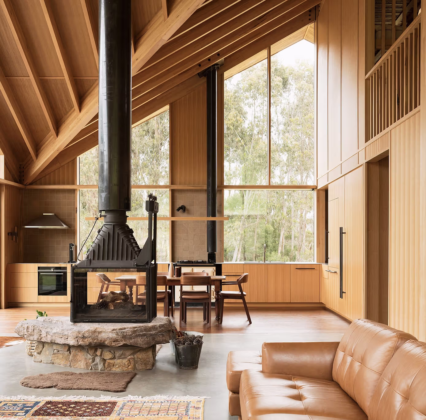 Kluczowym materiałem stało się lokalne australijskie drewno liściaste. Odsłonięte krokwie, belki z drewna klejonego warstwowo oraz wyrazista tekstura desek tworzą spójne, ciepłe wnętrze, które niemal stapia się z otaczającym lasem.