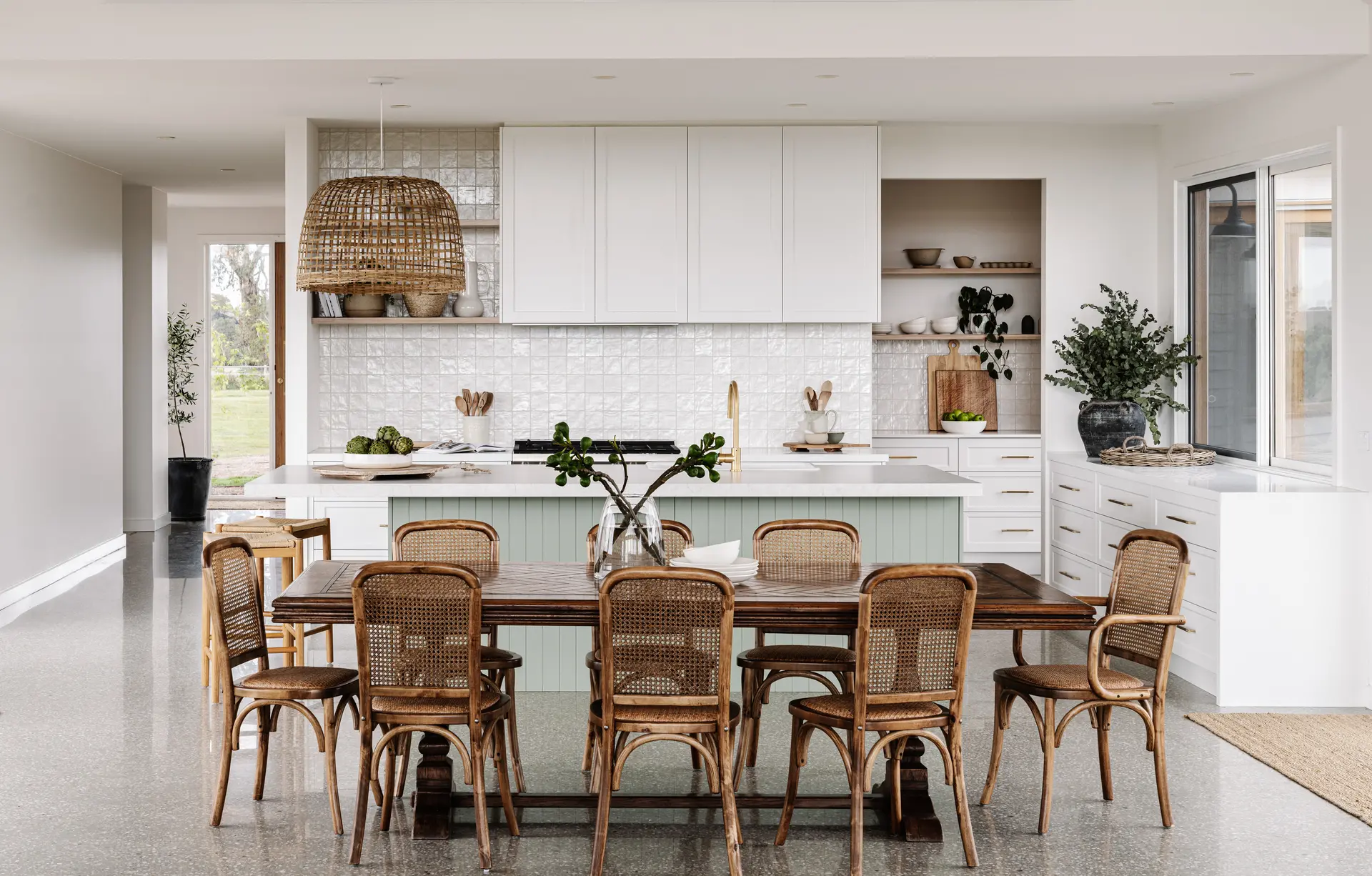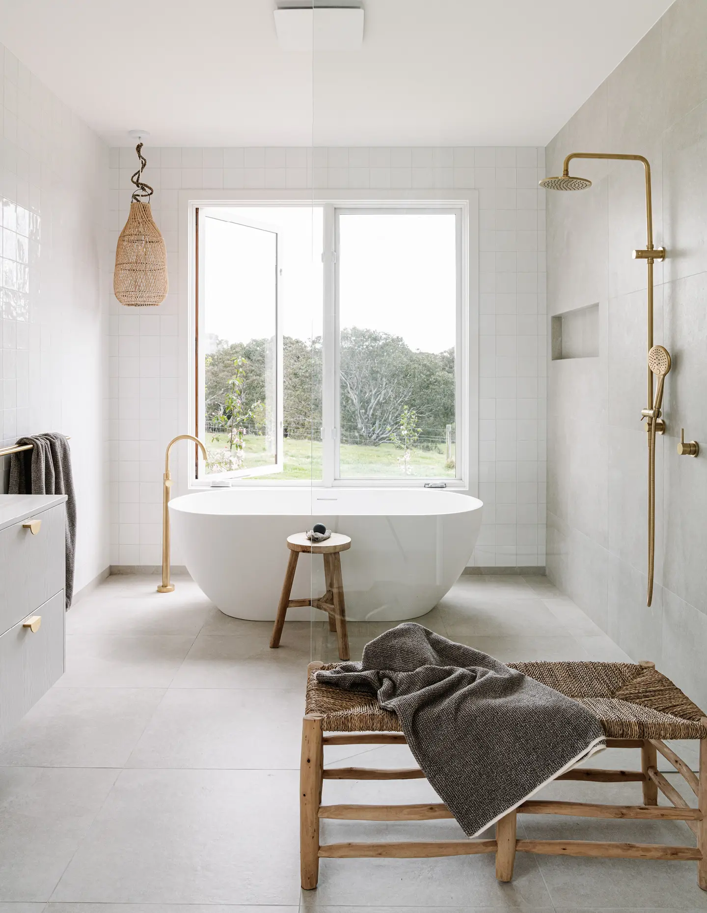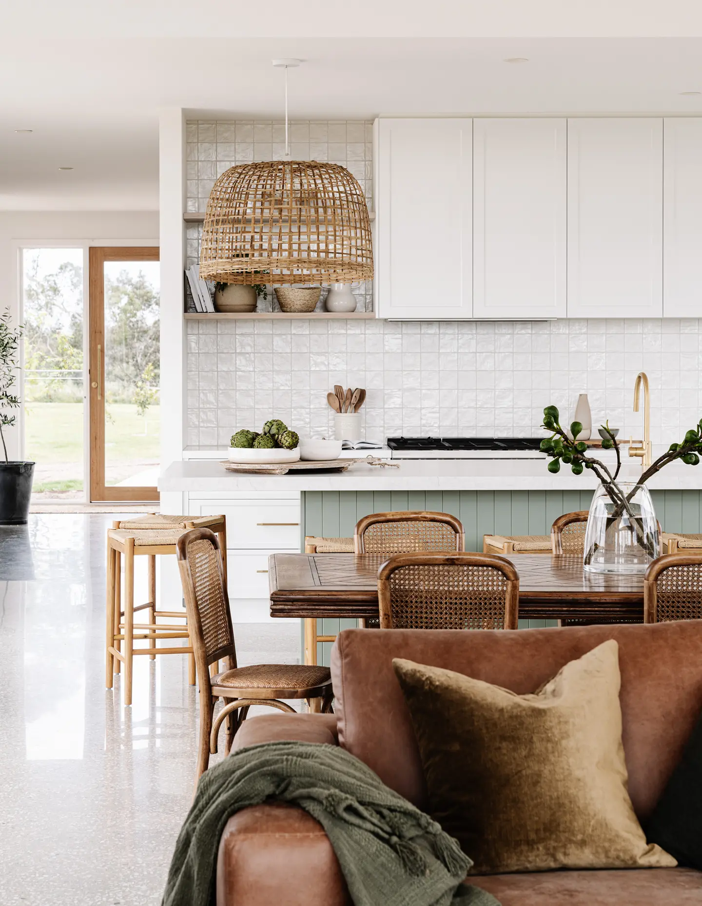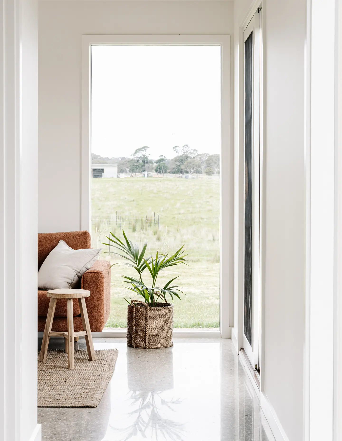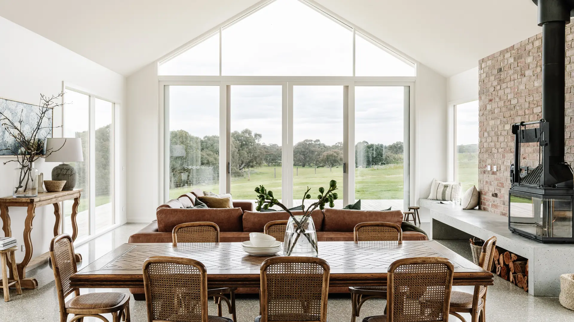 Mel Wilson Interiors stworzyło spójną, jasną paletę barw – biel i neutralne odcienie podkreślają widoki, które rozciągają się z każdego pomieszczenia. Wnętrza łączą klasyczne elementy, takie jak szerokie francuskie drzwi i przesuwne doors of barn style, z nowoczesnymi akcentami: minimalistycznymi liniami, współczesnymi detalami i kominkiem Chiminees Philippe, który nadaje strefie dziennej ciepło i charakter.