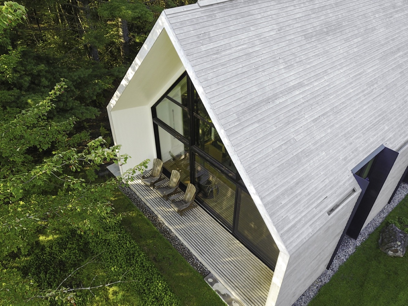 Ten parterowy dom letniskowy wyróżnia się drewnianą konstrukcją oraz pełnym zespoleniem z naturą. Budynek stoi na polanie, a dzięki ukrytym fundamentom sprawia wrażenie, jakby lewitował nad trawą. Całość została wykończona białymi deskami cedrowymi, obejmującymi zarówno dach, jak i elewacje, co podkreśla jego czysty, monolityczny charakter.