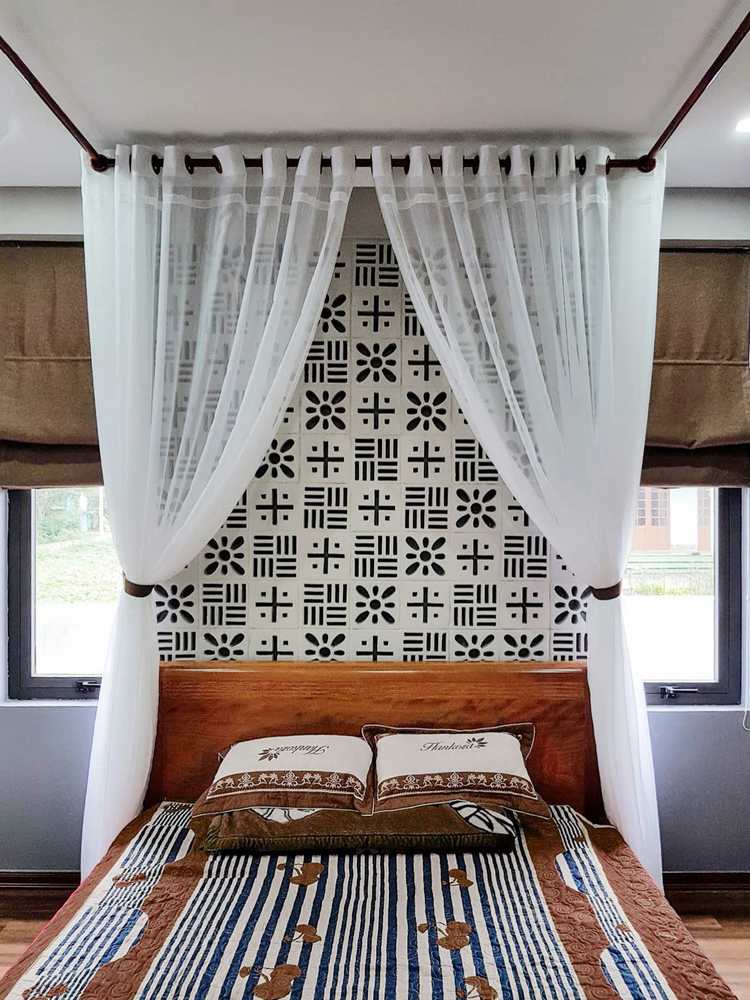 Najbardziej charakterystycznym elementem projektu jest oryginalna fasada, łącząca kamień naturalny z wentylowanymi ścianami z cegły, które zapewniają lepszą cyrkulację powietrza i dostęp światła dziennego do wnętrz. Ze względu na ograniczony budżet, Pham Hung samodzielnie podróżował po różnych prowincjach w poszukiwaniu odpowiednich materiałów, a elewację obłożono kamieniami o wielkości 3–4 cm, starannie układanymi przez lokalnego rzemieślnika. Przemyślana konstrukcja fasady podnosi walory estetyczne salonu i całego wnętrza, które jest jasne, przestronne i wypełnione naturalnym światłem dzięki dużym przeszkleniom. W aranżacji wykorzystano także stare meble rodzinne, co podkreśla autentyczność projektu i nadaje mu osobisty charakter. Dzięki połączeniu niskobudżetowych rozwiązań, lokalnych materiałów i innowacyjnego podejścia, dom zyskał dużą popularność w mediach architektonicznych, stając się inspiracją dla inwestorów poszukujących rozwiązań podobnych do koncepcji nowoczesna stodoła w azjatyckim wydaniu.