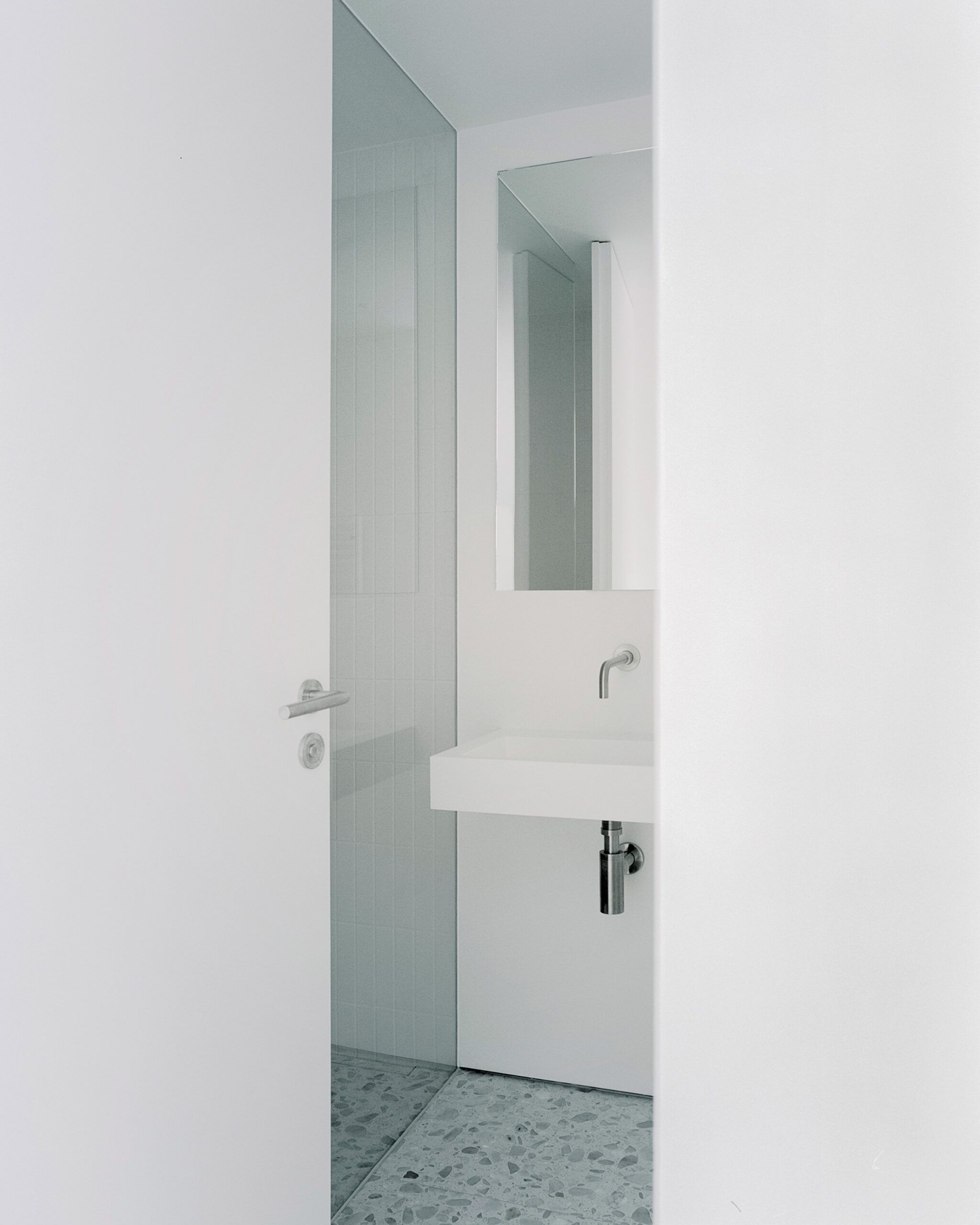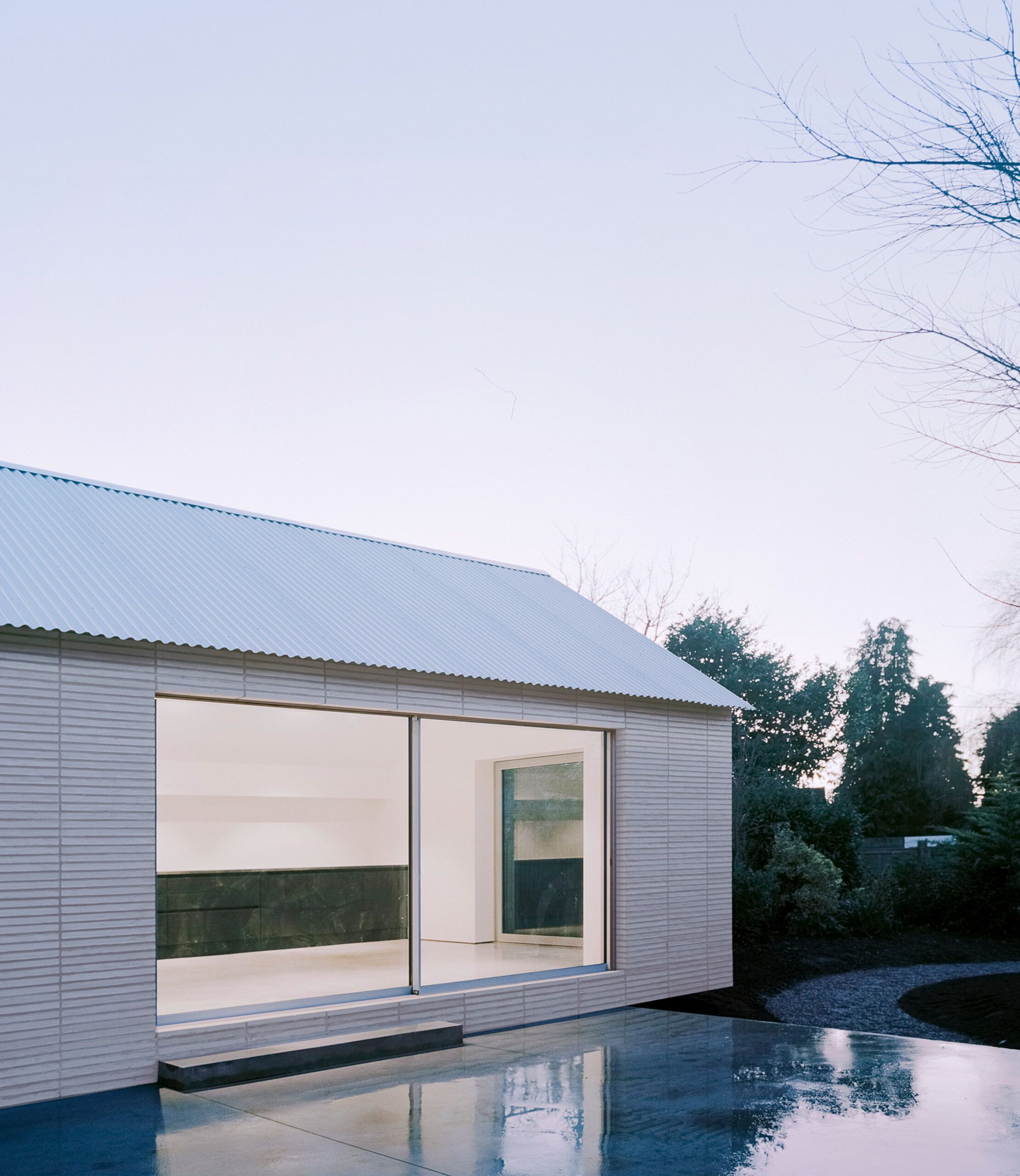 Wnętrze domu cechuje minimalistyczna estetyka z kontrastującą czarną kuchnią i jasnymi ścianami. Duże szklane drzwi wprowadzają naturalne światło i łączą przestrzeń wewnętrzną z otoczeniem. Przeszklona ściana oddziela starą i nową część domu, a hall wejściowy, łazienka, salon oraz dwie sypialnie tworzą funkcjonalny układ mieszkalny. Betonowe patio przedłuża wnętrze na zewnątrz, tworząc harmonijną relację między domem a krajobrazem.