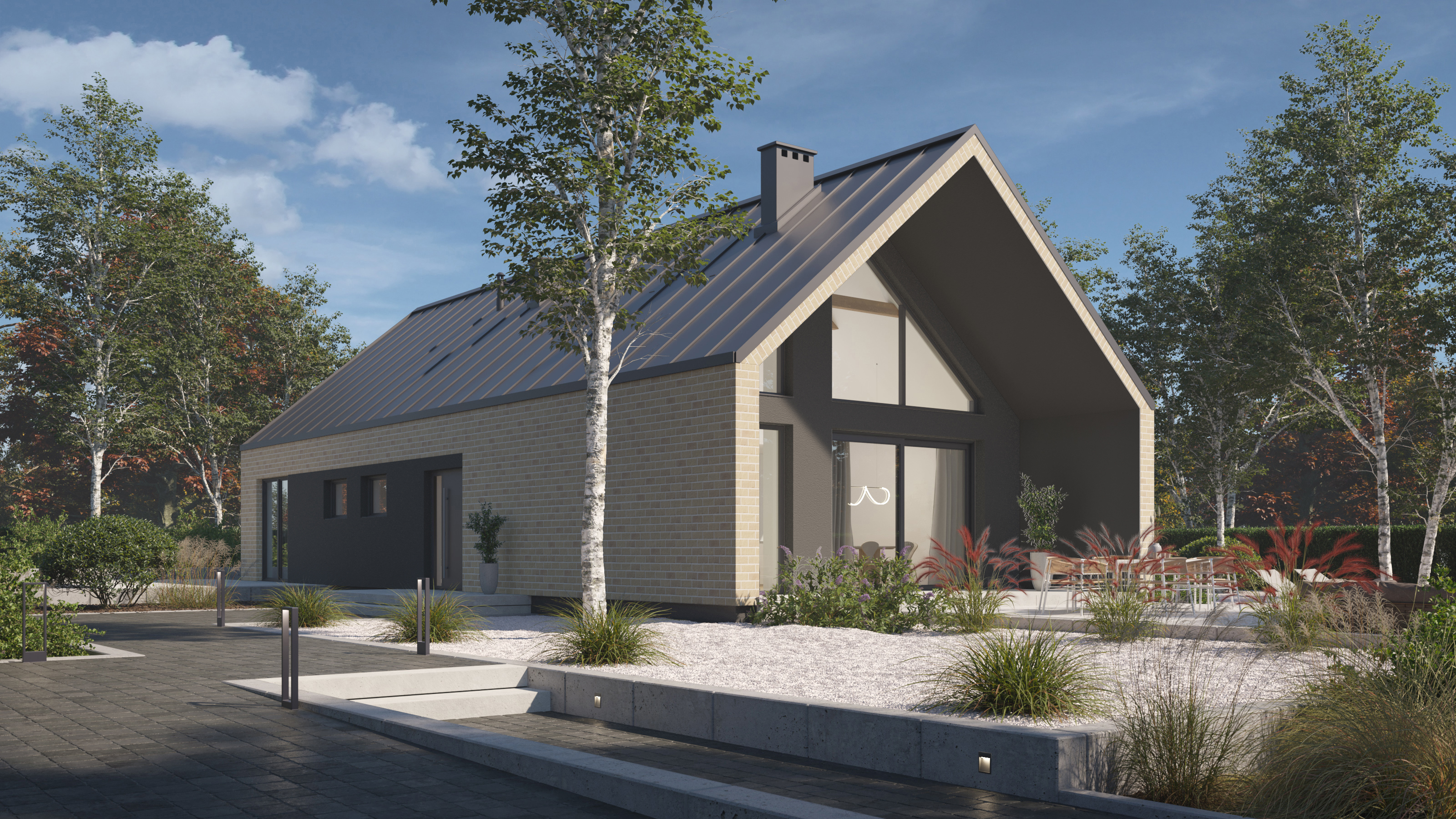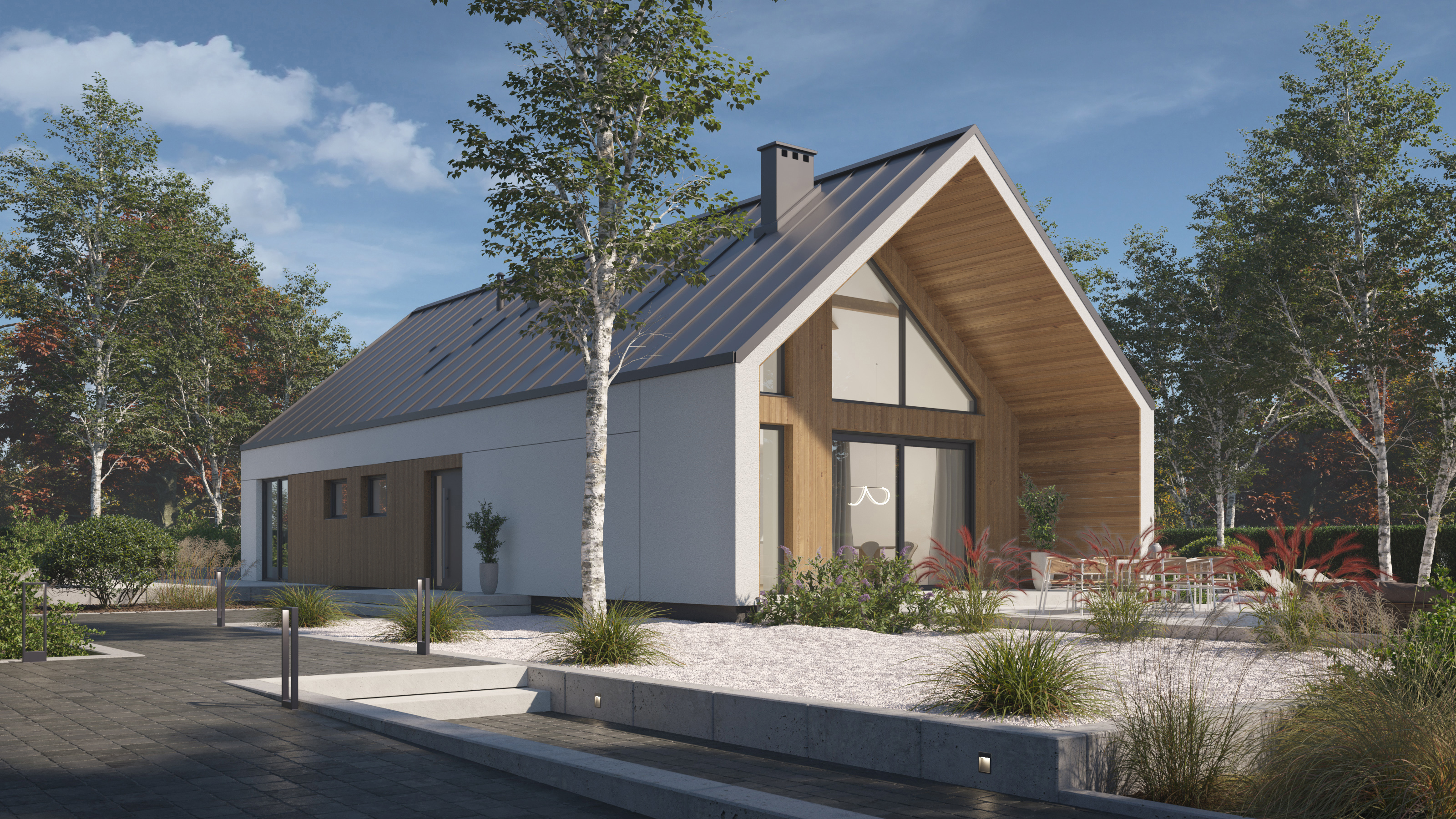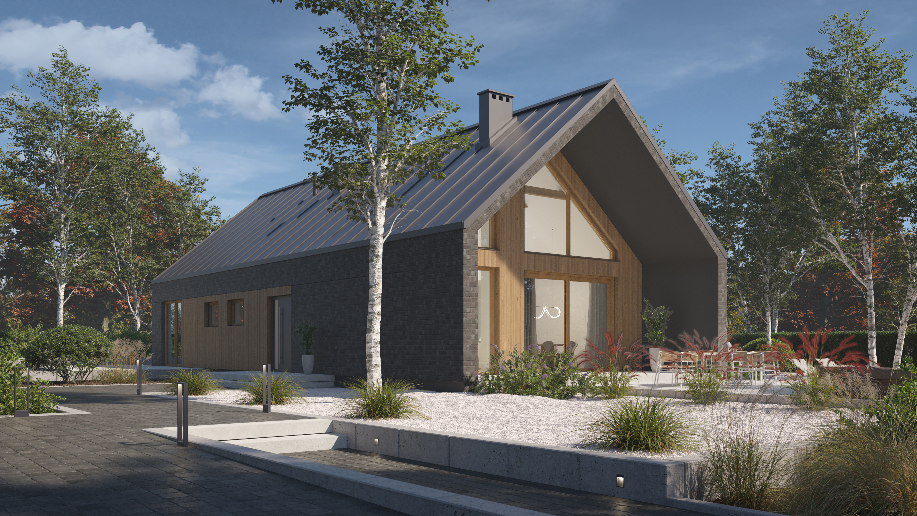 Projekt P.14 od P. Homes to współczesna interpretacja tradycyjnej stodoły – dom, który z jednej strony wtapia się naturalnie w krajobraz, z drugiej przyciąga spojrzenia swoją elegancką, wyważoną formą. Prosta bryła, wysokiej klasy wykończenia i perfekcyjnie przemyślany układ funkcjonalny to przepis na komfortową codzienność.